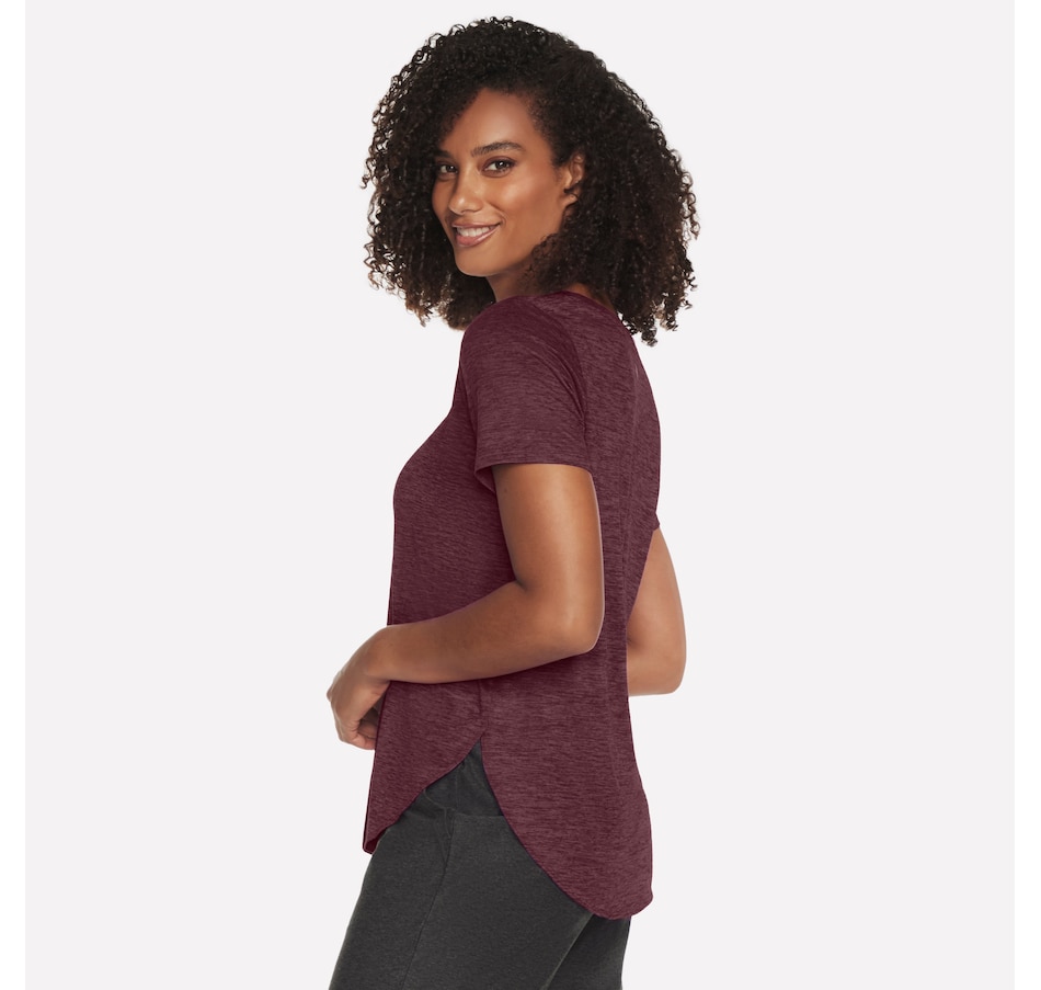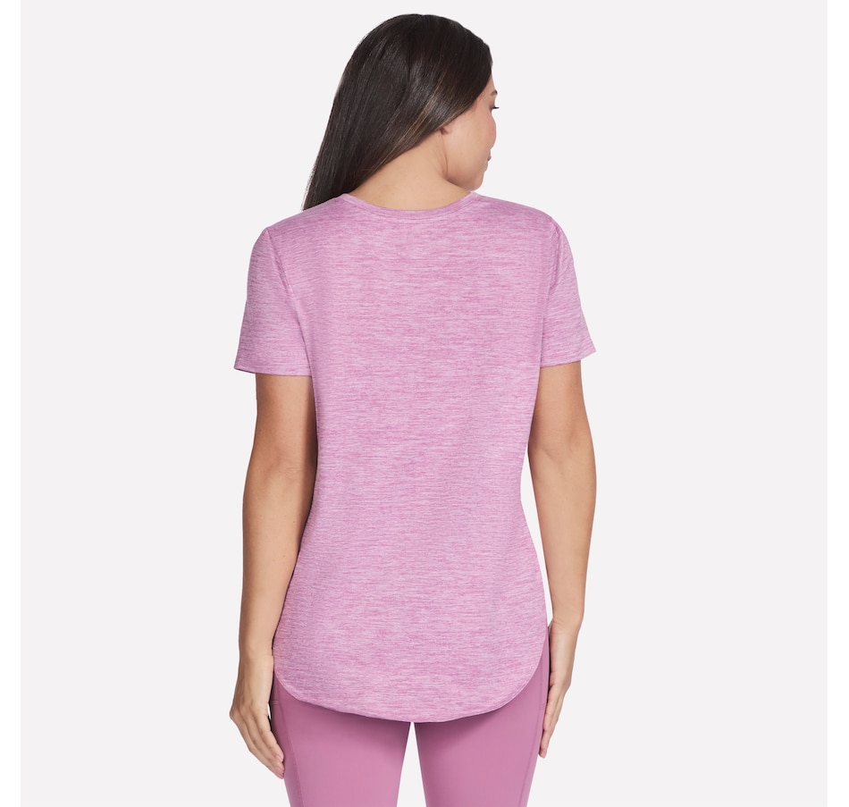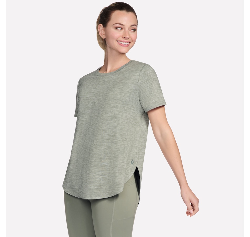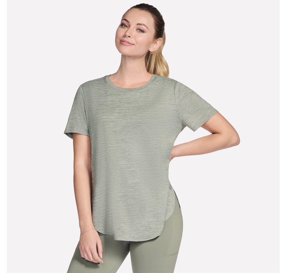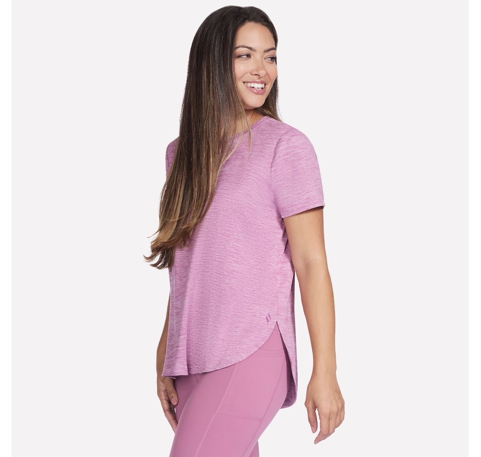 This short sleeve tunic tee from Skechers features a high-low shirt tail hem with side slits.
