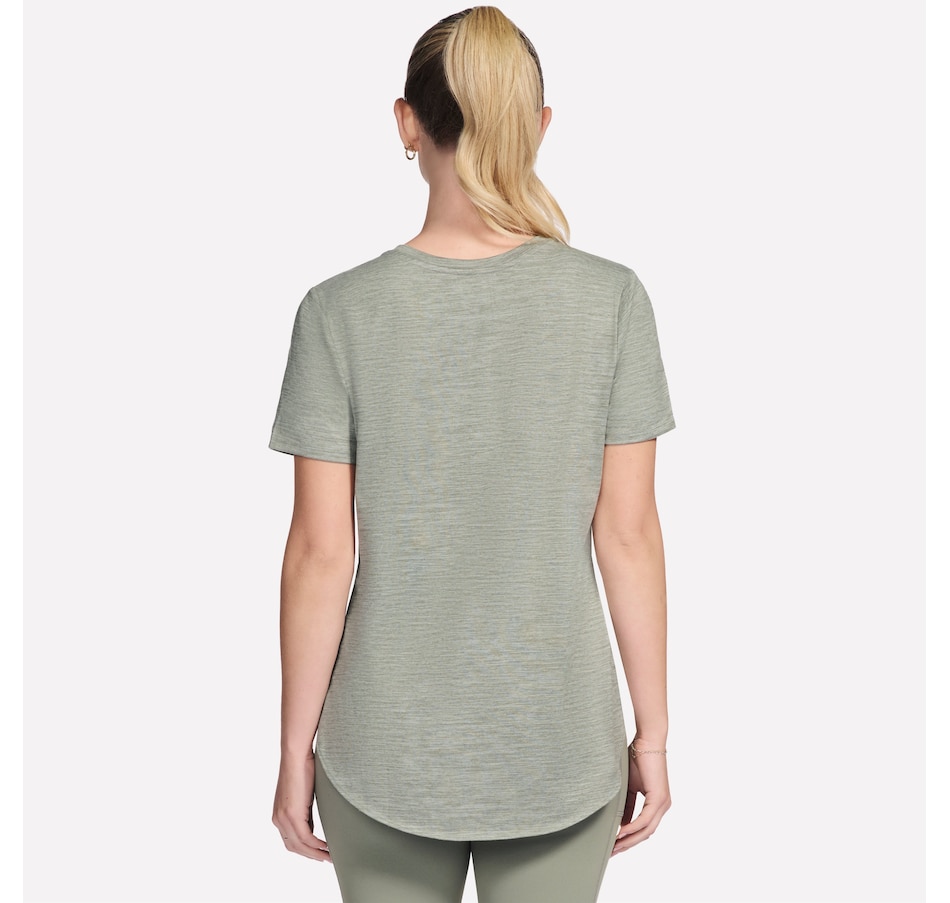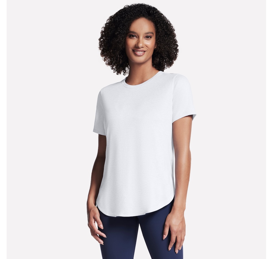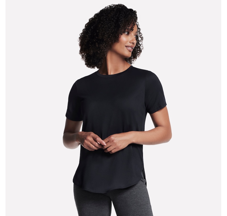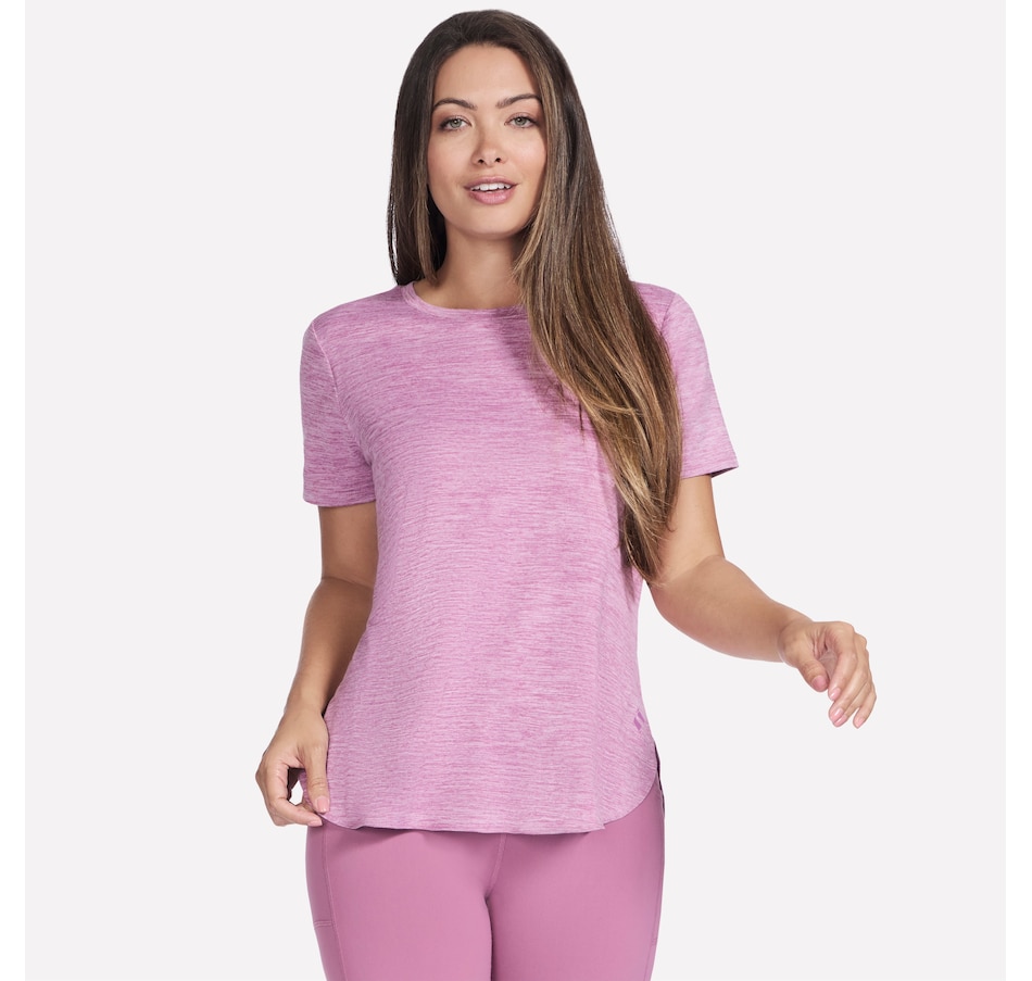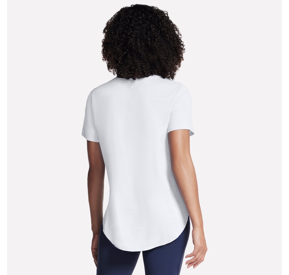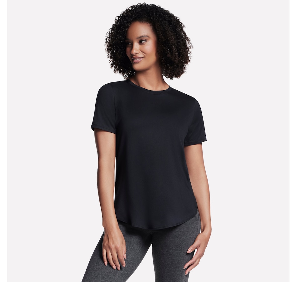 This short sleeve tunic tee from Skechers features a high-low shirt tail hem with side slits.