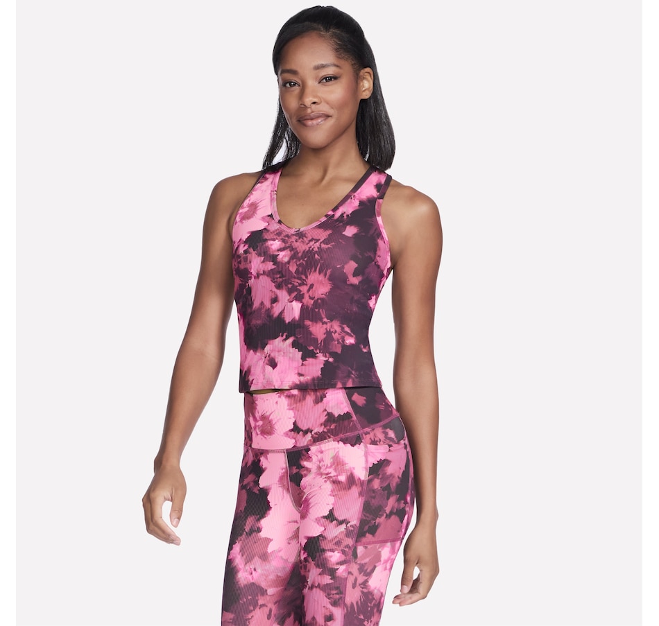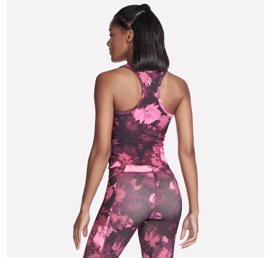 This Skechers tank top features a racer back, a built-in shelf bra with removable Air-Cooled Memory Foam cups, and is part of a coordinating apparel collection.