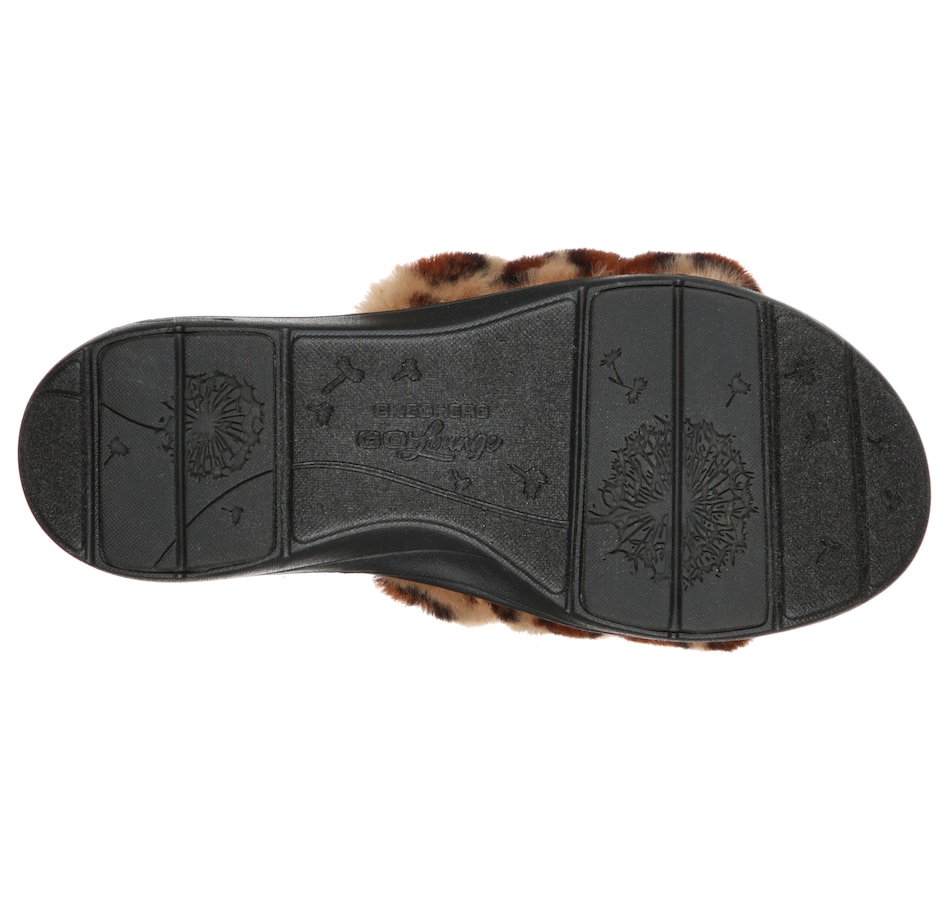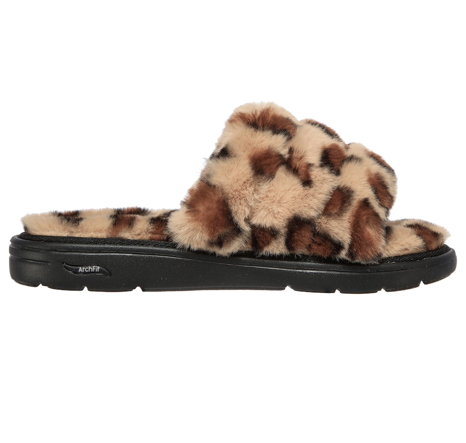 Relax in cozy vibes and comfort with the Skechers Go Lounge Arch Fit print fur slipper. This faux-fur slide sandal features a puffer style vamp, supportive arch fit comfort footbed, and a lightweight Ultra Go cushioned midsole.