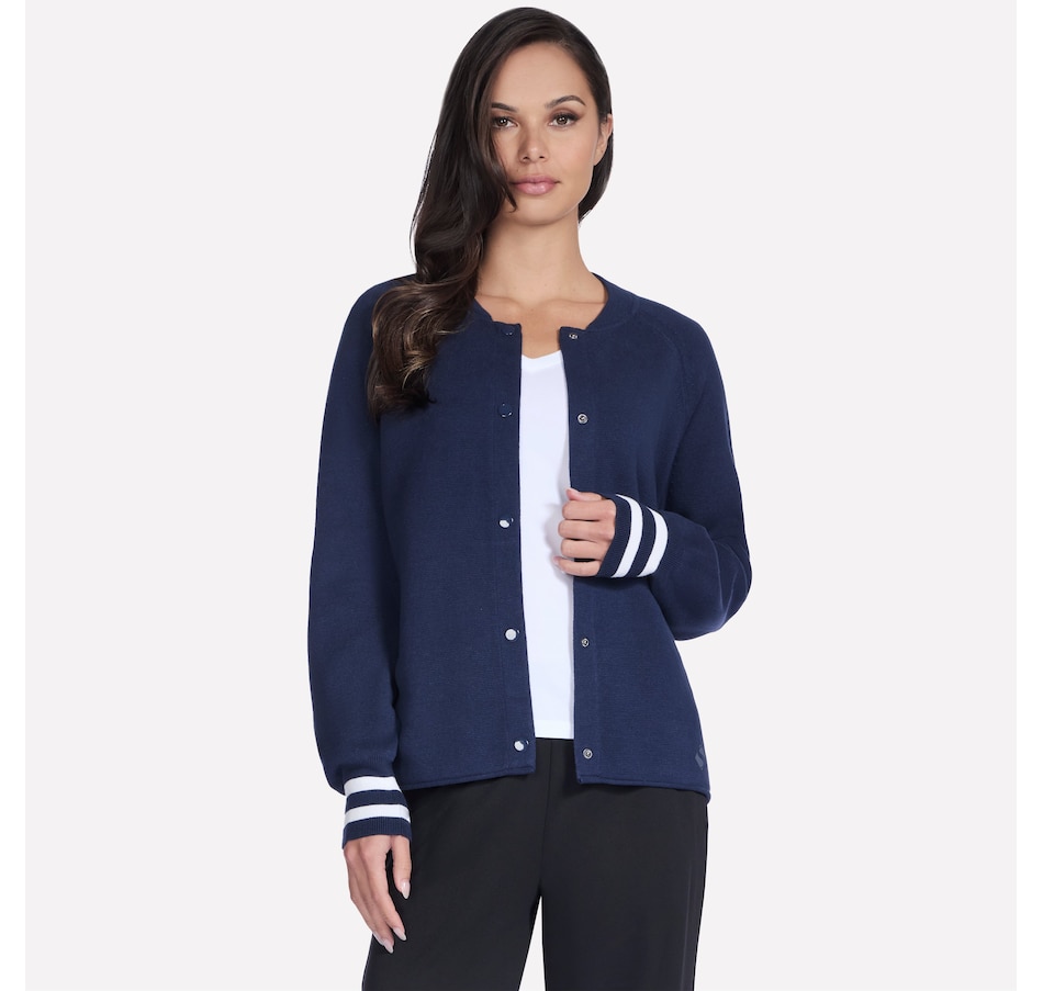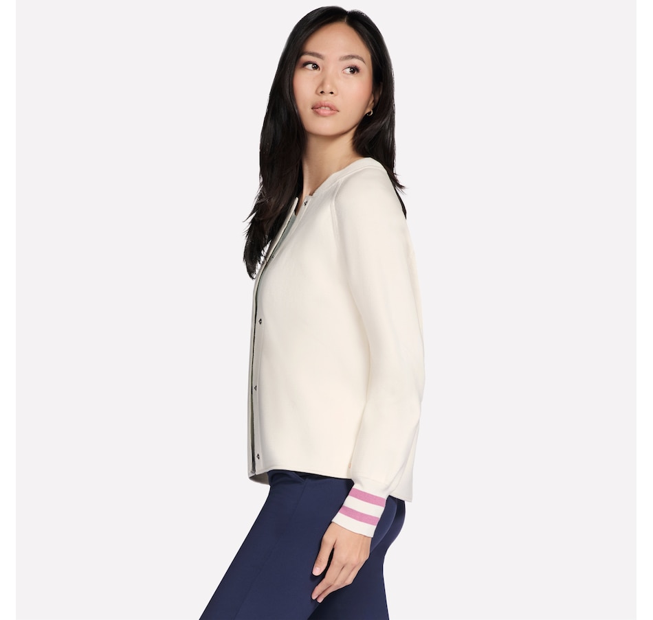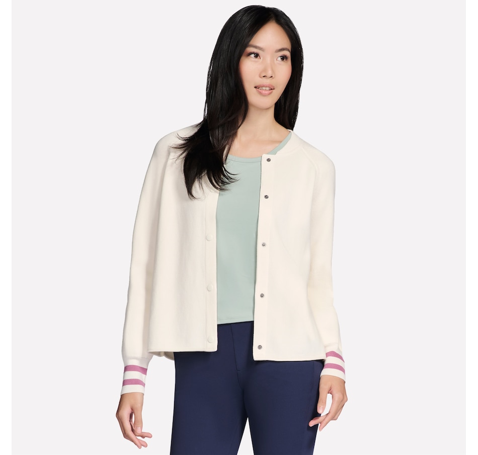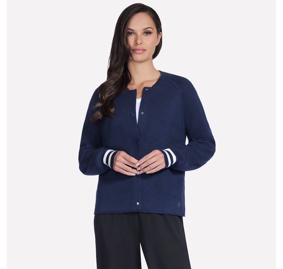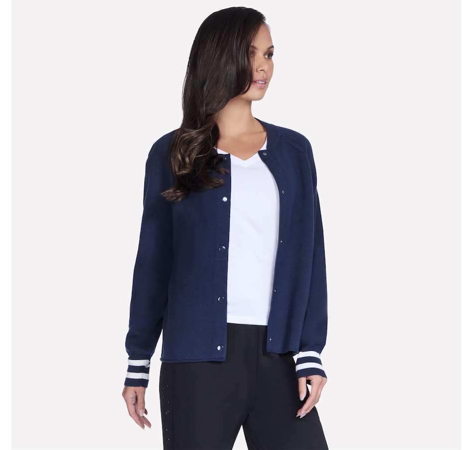 This varsity style bomber jacket from Skechers features raglan sleeve seams, a ribbed collar and cuffs with stripe detail, and a snap button front closure.