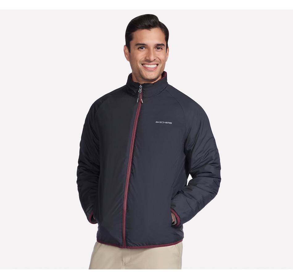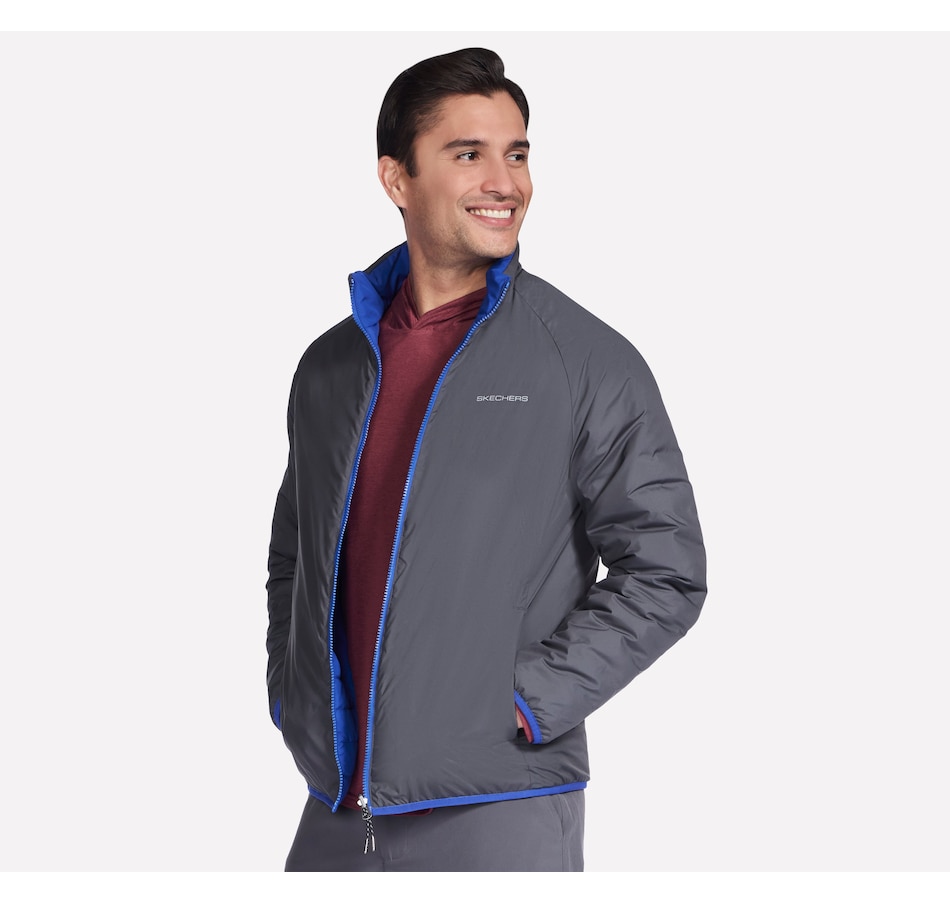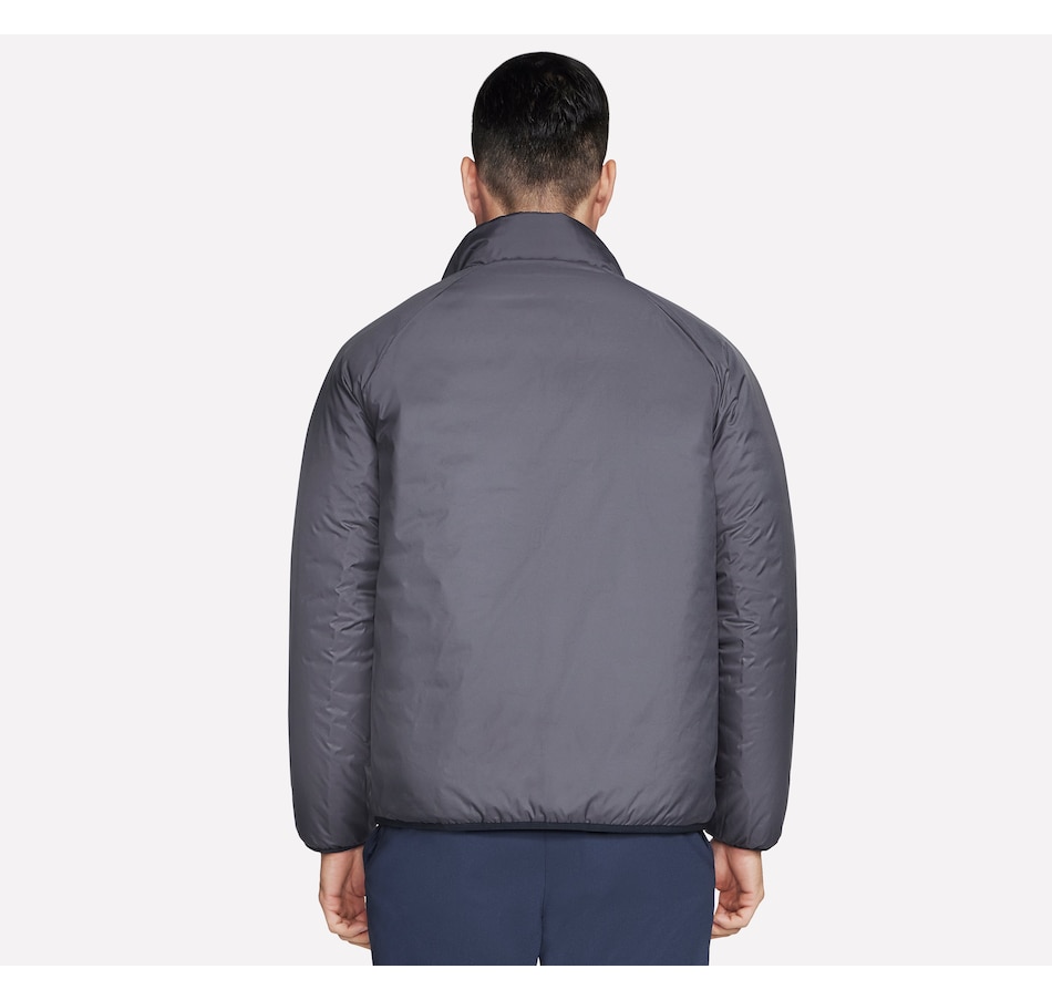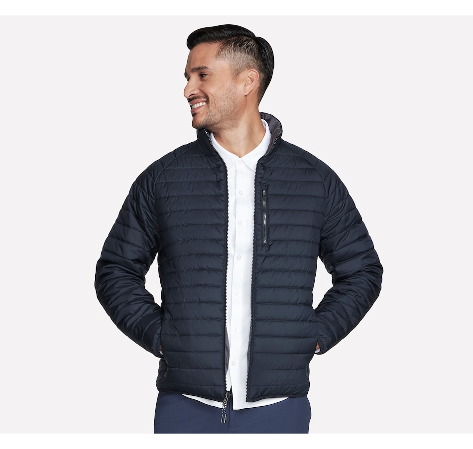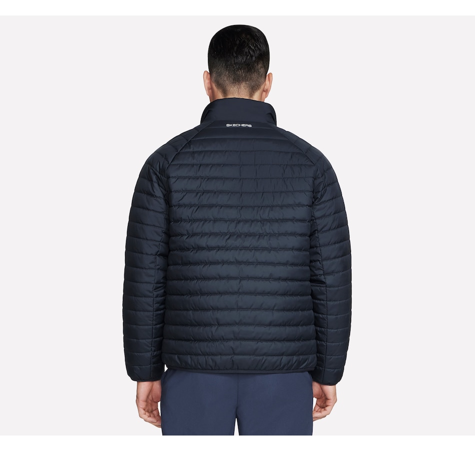 This men's mock neck puffer jacket from Skechers is designed with a reversible zipper with ticked cord puller and elastic binding at the hem and cuffs. The quilted side has a  zippered chest and hand pockets, while the non-quilted side has open hand pockets, the Skechers logo and an interior locker loop.