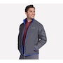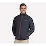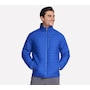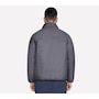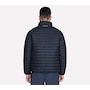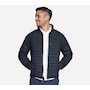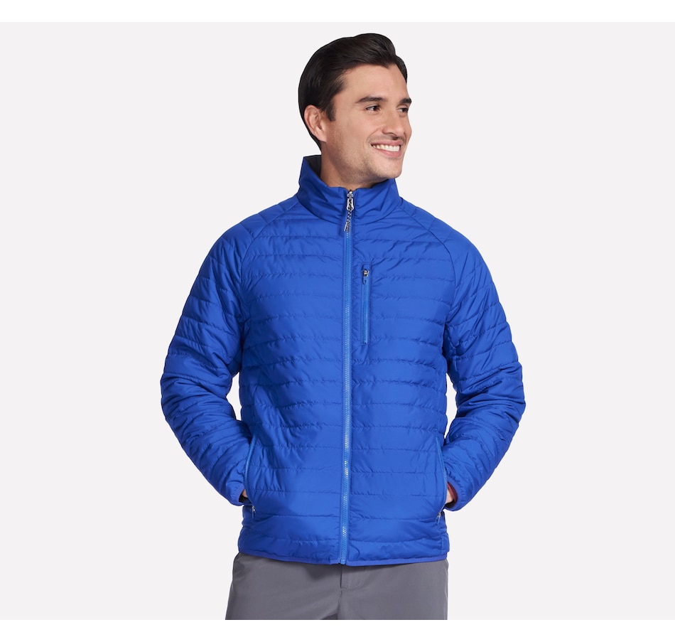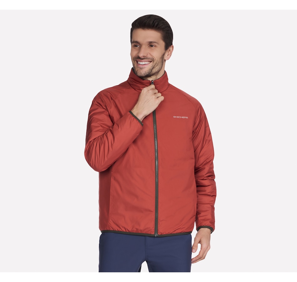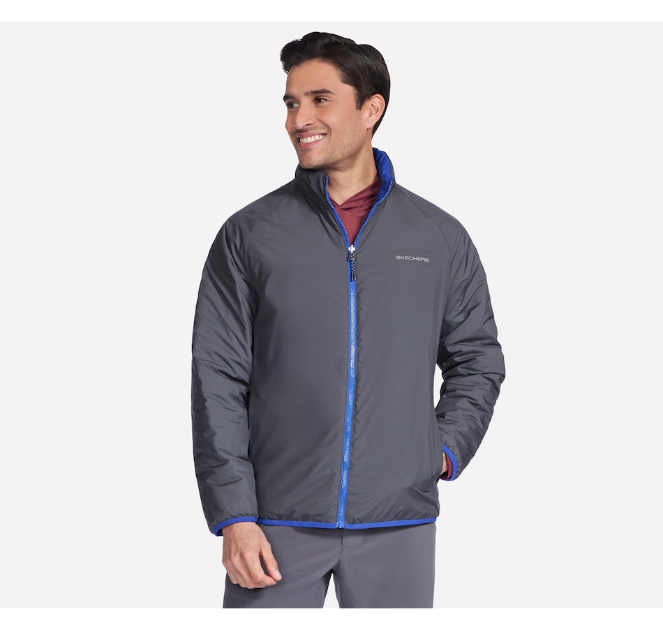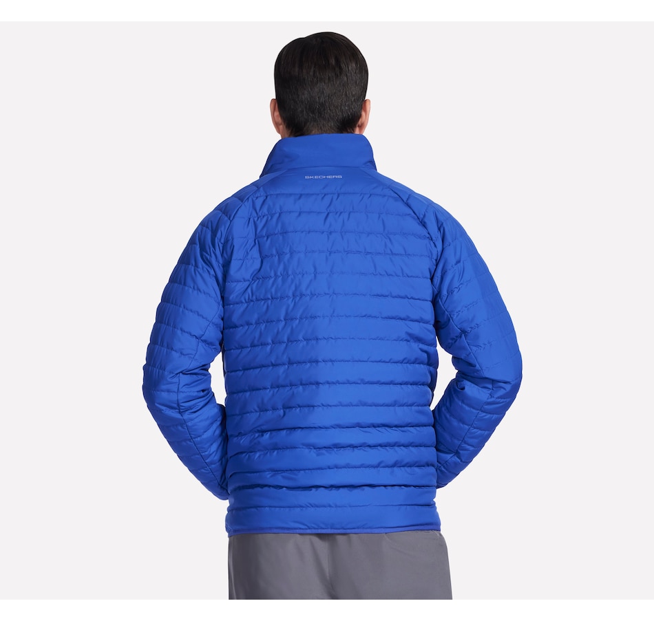 This men's mock neck puffer jacket from Skechers is designed with a reversible zipper with ticked cord puller and elastic binding at the hem and cuffs. The quilted side has a  zippered chest and hand pockets, while the non-quilted side has open hand pockets, the Skechers logo and an interior locker loop.
