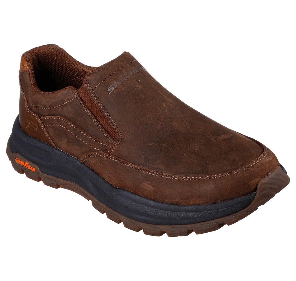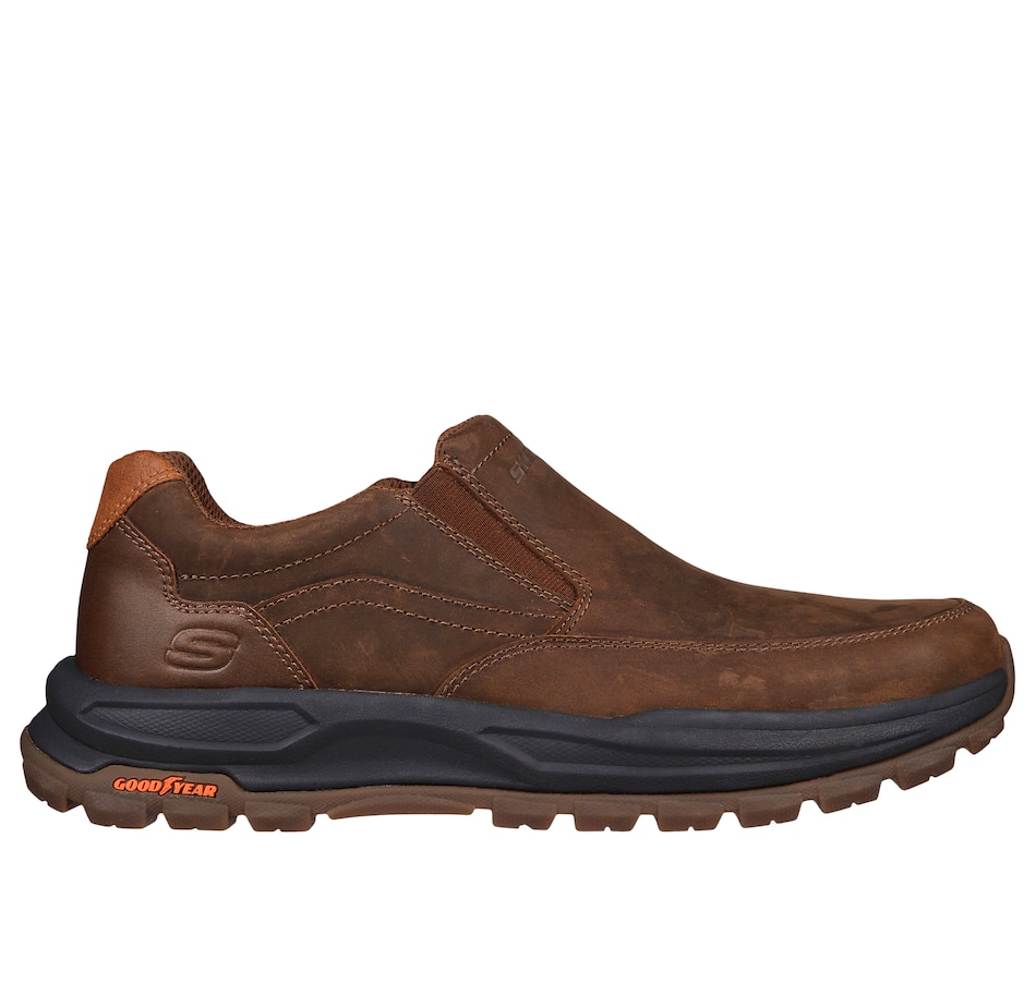 Gain good traction with surefooted comfort in Skechers Relaxed Fit Zeller Carther. This laceless design features a leather upper with a Skechers Air-Cooled Memory Foam insole, Skechers Goga Mat Arch cushioning, and an anti-slip Goodyear rubber outsole.