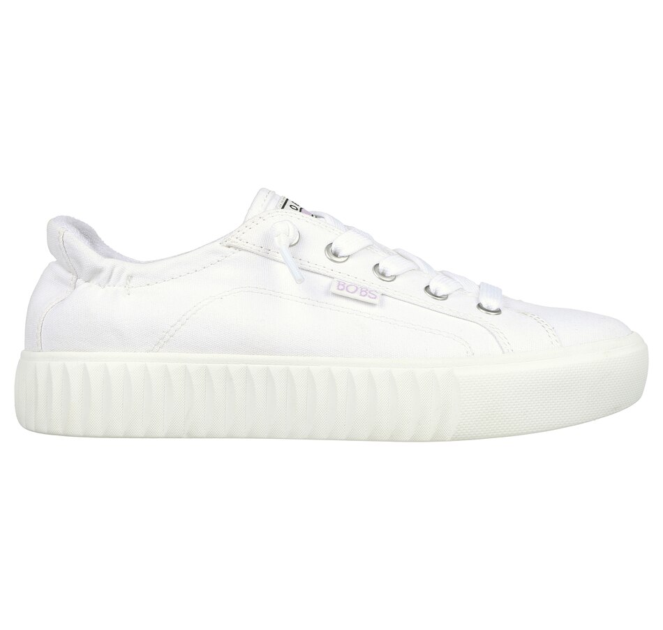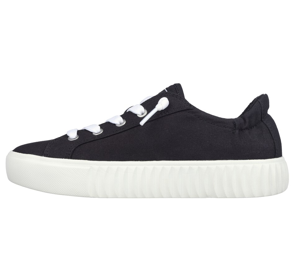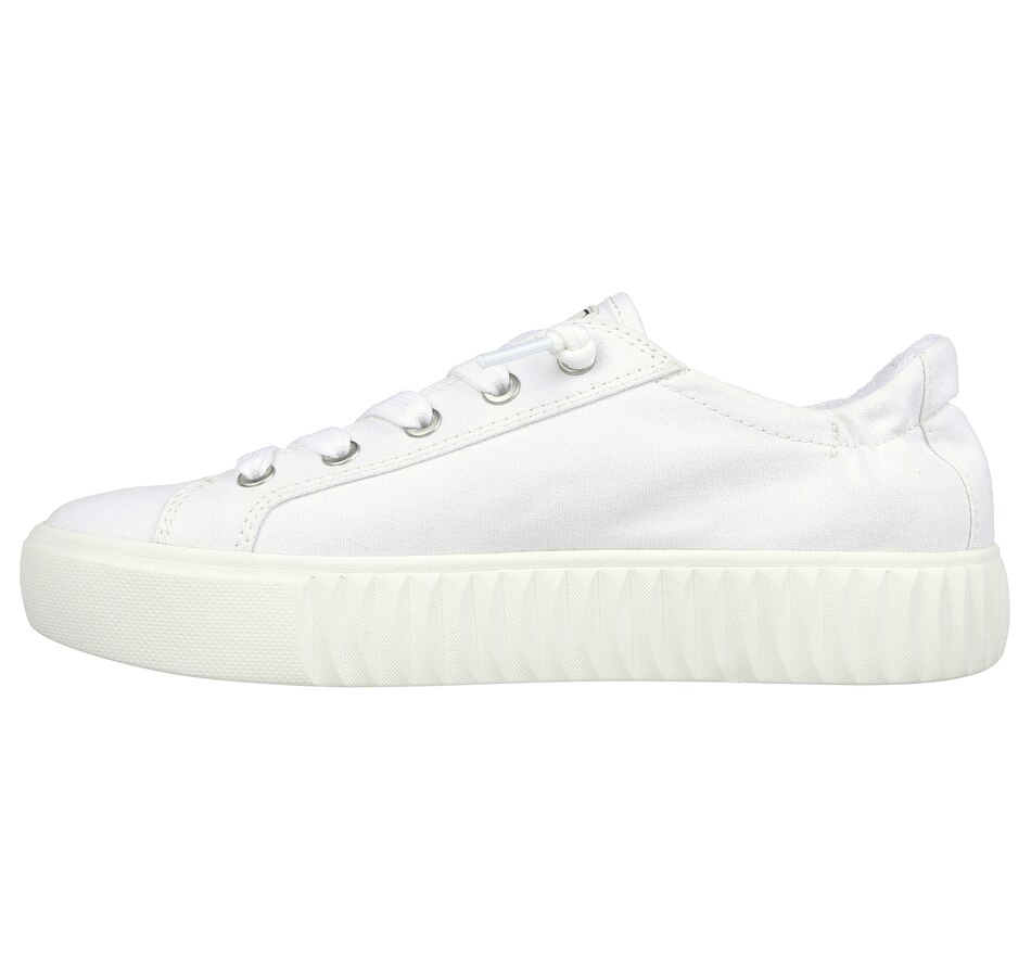 Heighten your casual style wearing BOBS from Skechers Royal Kiss. This casual platform sneaker features a canvas upper with an elasticized scrunch-back, tied-off laces, and a cushioned Skechers Memory Foam insole.