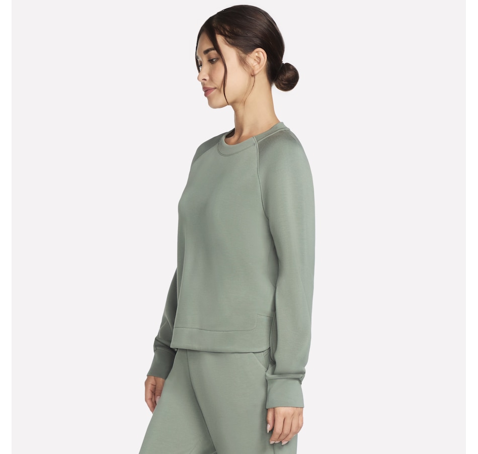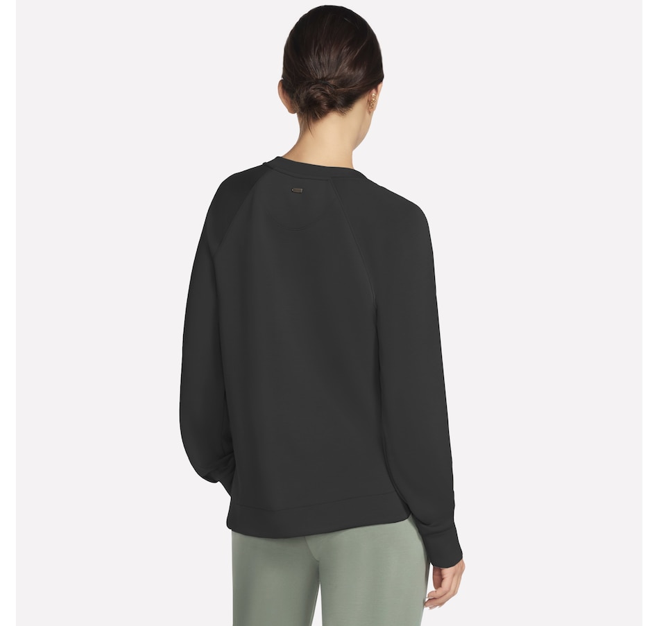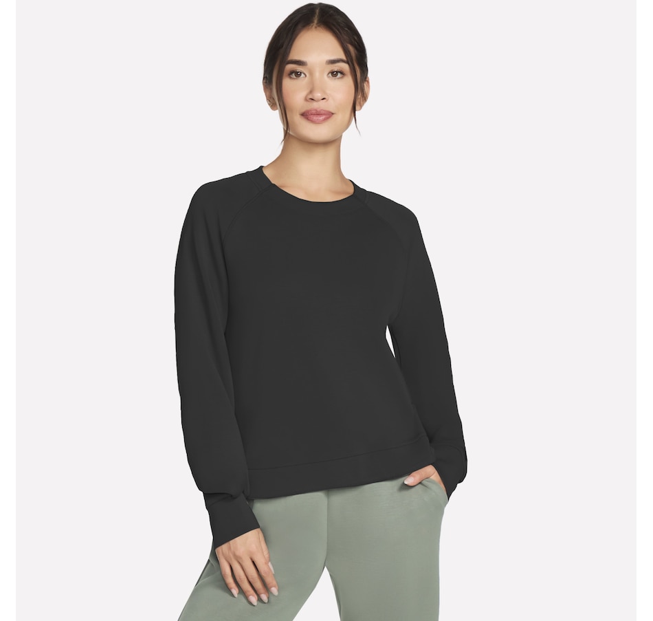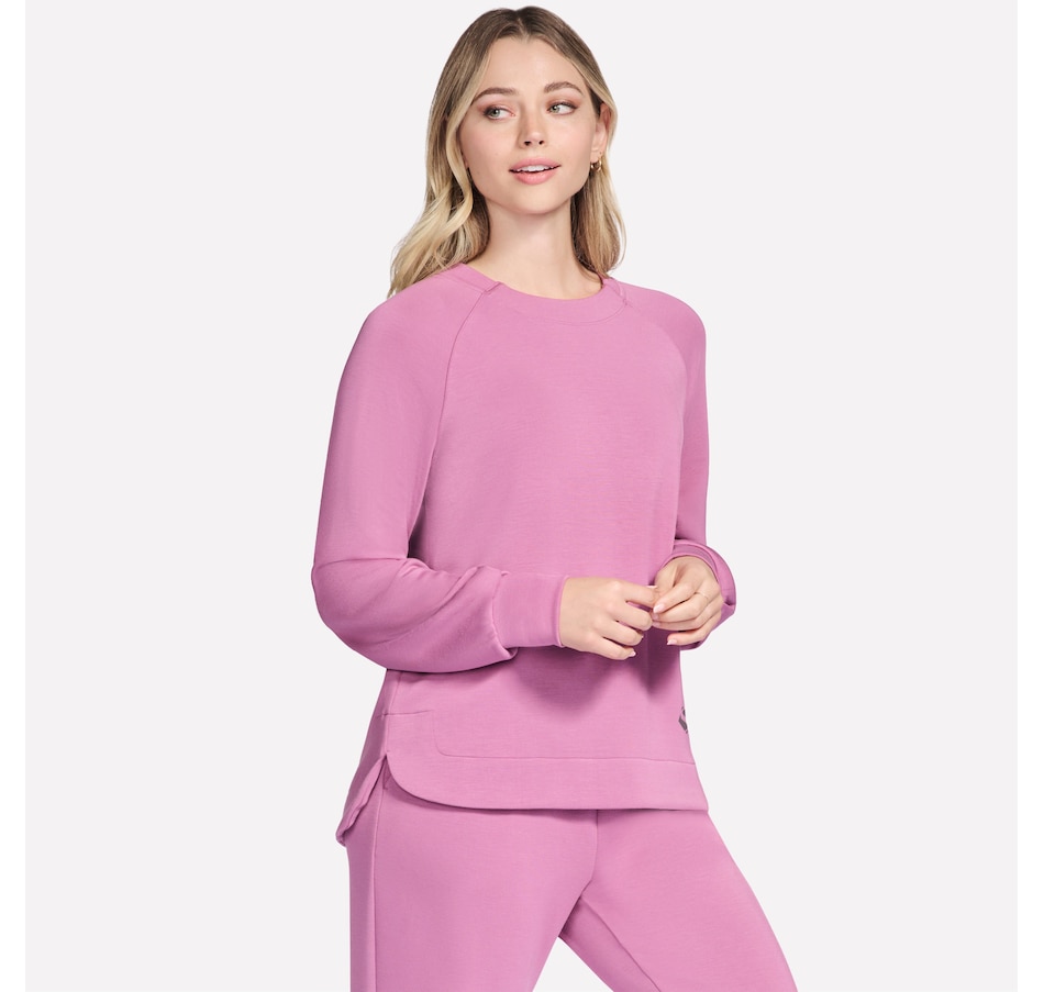 This long sleeve crewneck tee from Skechers features a self front neckband and ribbed back neck band. It is also designed with raglan shoulder seams, a high-low shirt hem, and single box pleat at cuffs.