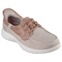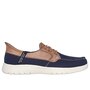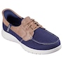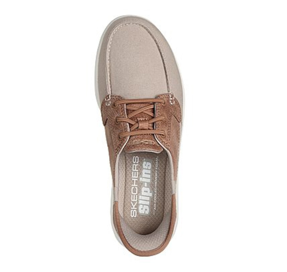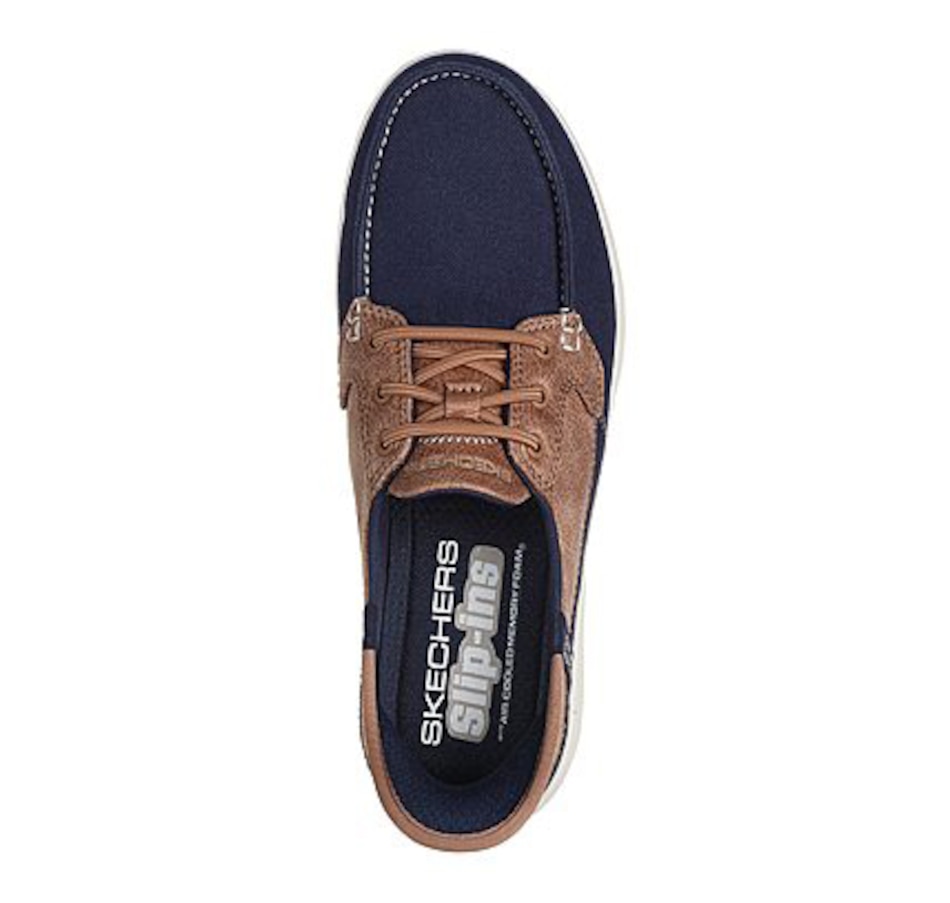 Step-in to convenient nautical comfort and cushioning wearing these Skechers hands free slip-ins On-The-Go Flex - Palmilla. This casual boat shoe style features a canvas and faux leather upper, their exclusive heel pillow, a Skechers air-cooled memory foam insole, lightweight Ultra Go cushioning, and a hands-free molded heel panel.