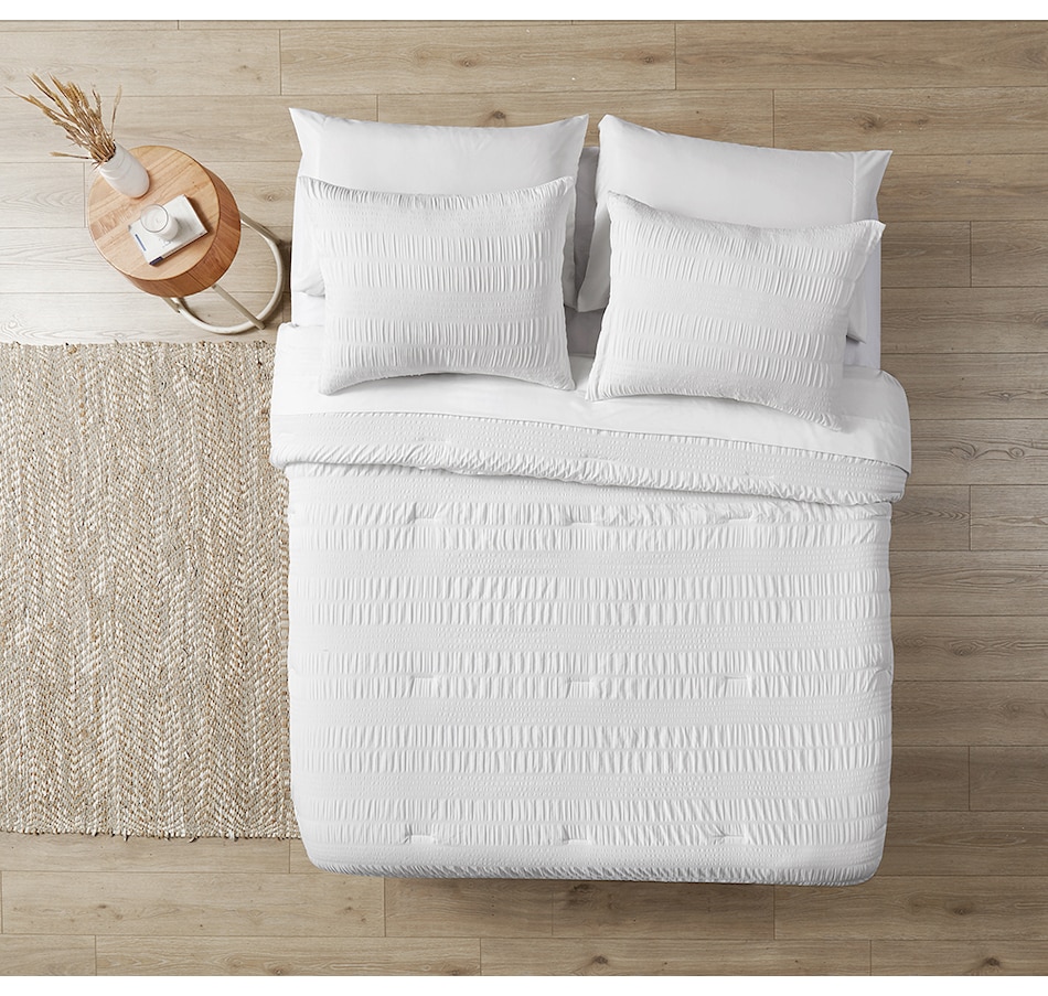 Create a dreamy oasis with this comforter set. An update from the simple, solid-coloured fabric, this seersucker stripe is perfect for creating a breezy, casual look. The ruffled design is made from brushed microfibre and offers a cloud-like feel. This set is complete with super-soft sheets and shams to provide the comfort you need for a perfect night’s sleep. All items are machine washable.