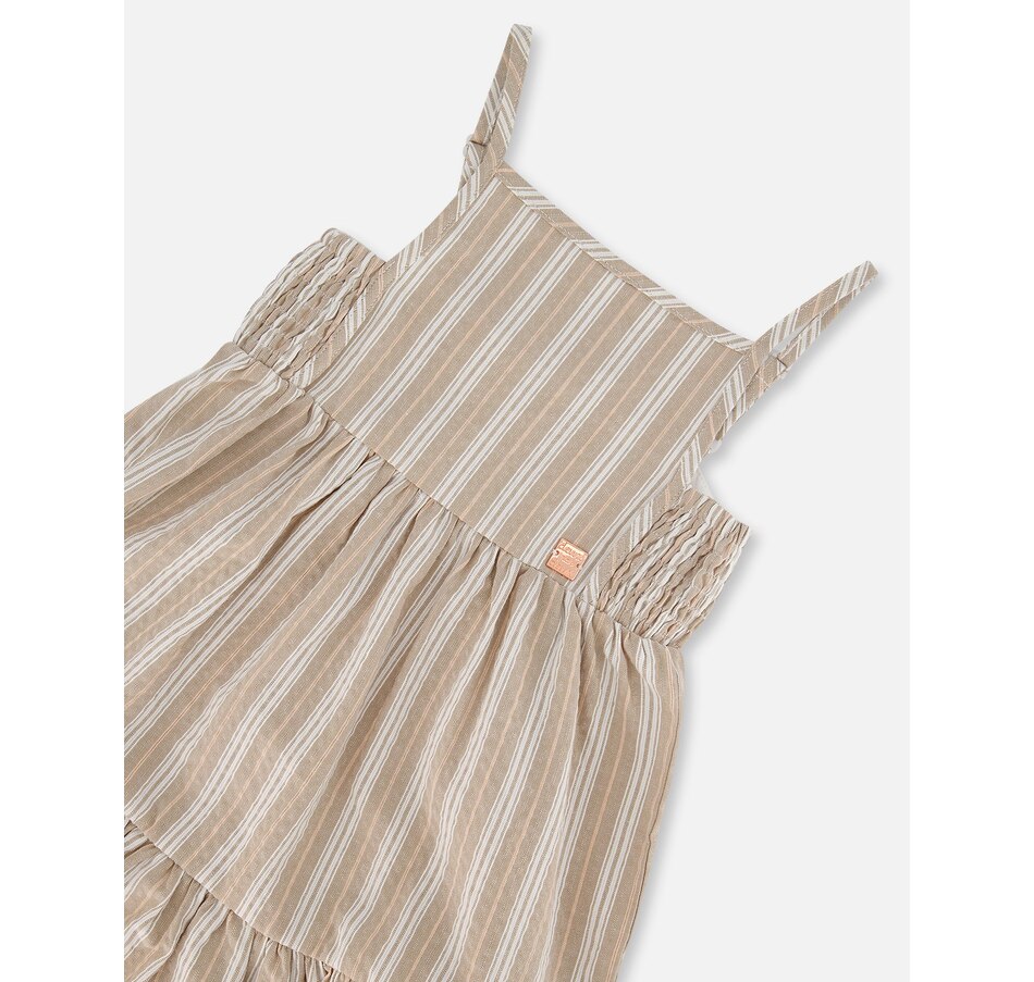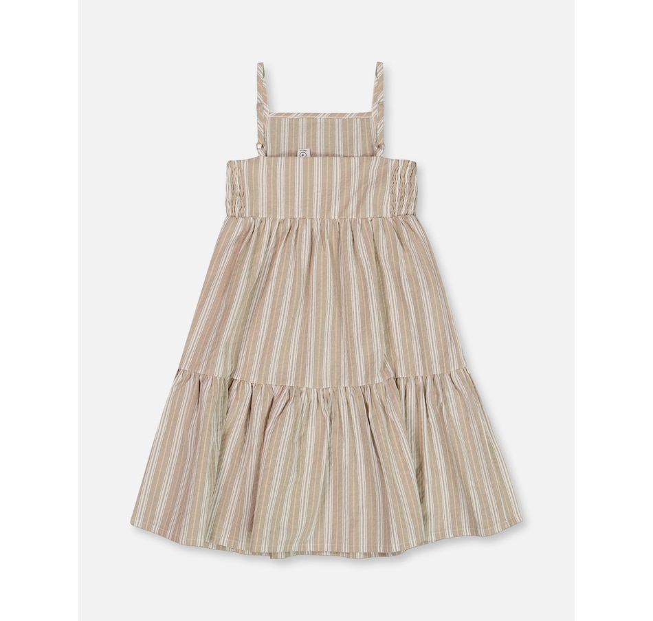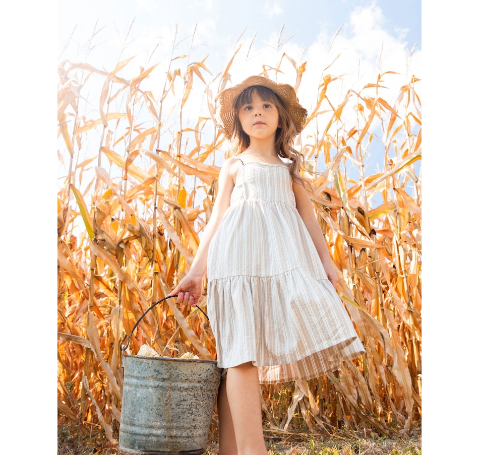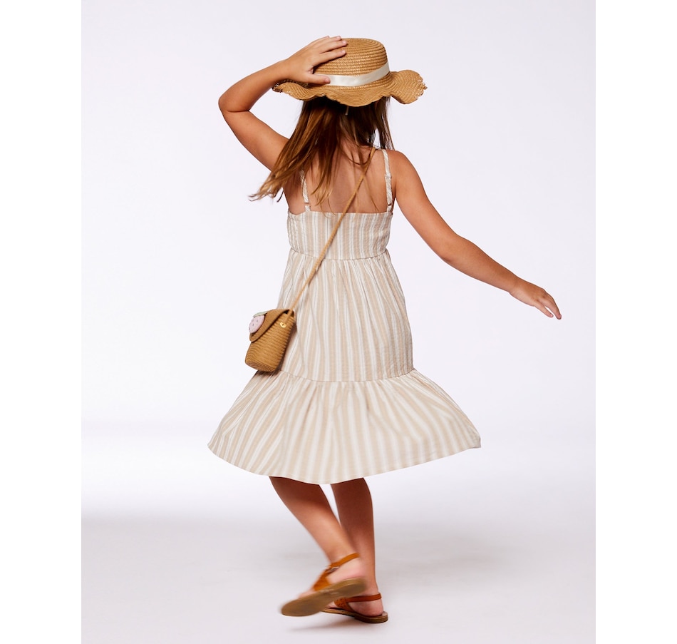 In lightweight cotton fabric, our Sleeveless Linen Dress White and Sage Striped is perfect for parties, play days, and family outings. This comfy, casual dress features adjustable spaghetti straps, a square neck bodice, stretch smocked panels for all day comfort, and a tiered A-line silhouette. A small metal logo plate adds a touch of signature style.