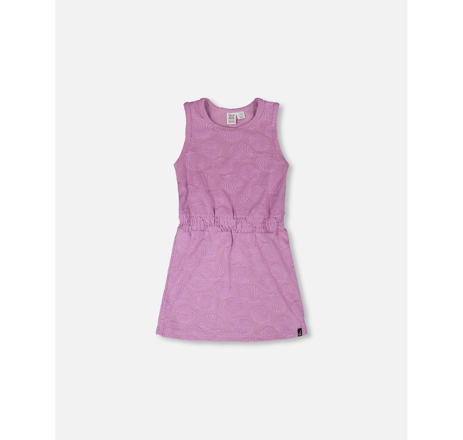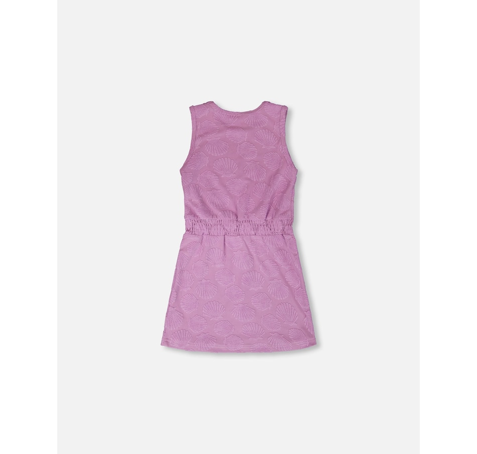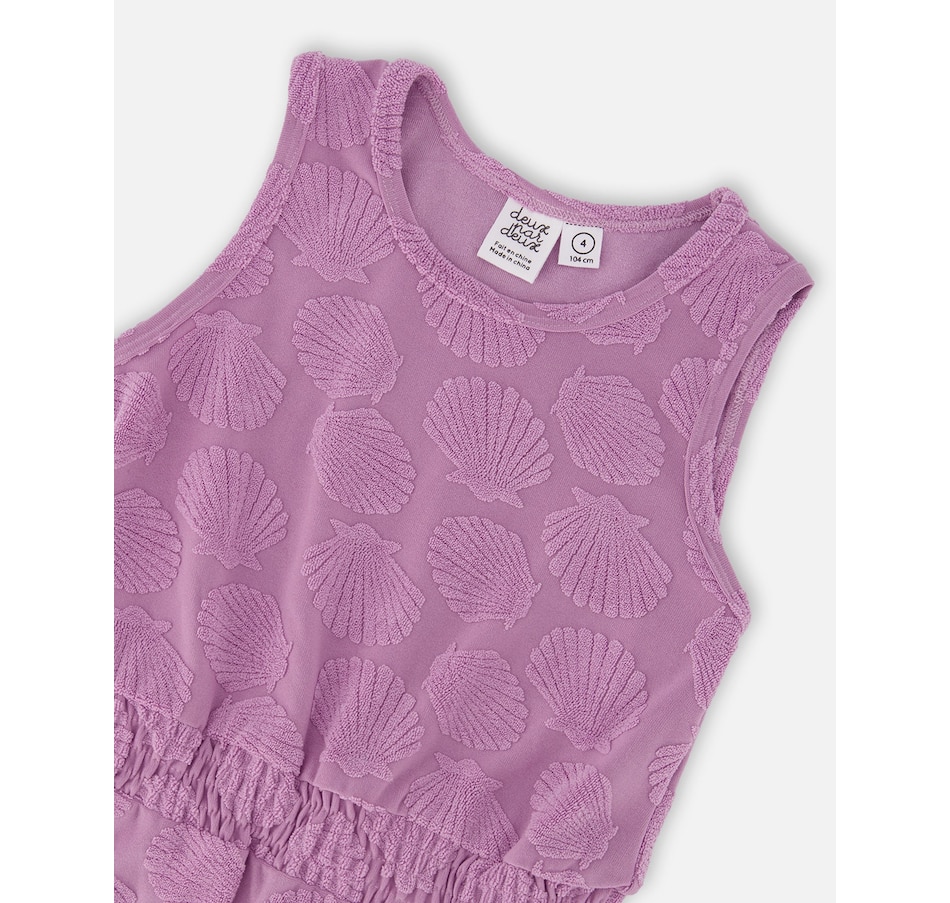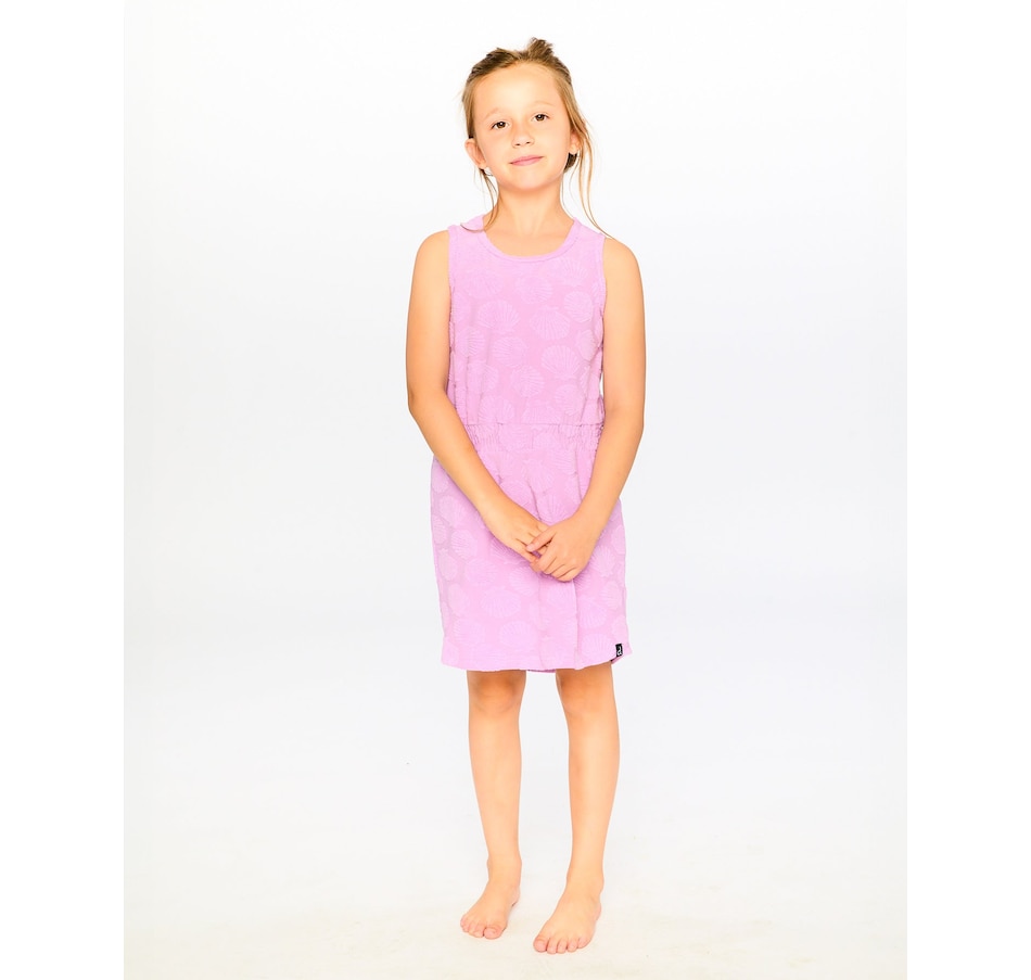 This terry cloth beach dress in lilac is both playful and easy to wear for summer days. This cover-up features a round neckline, a sleeveless cut, and an elastic waist for a flattering fit, while the allover seashell motif adds a touch of seaside charm. A curved hem completes the design, giving it fluidity and comfort in a soft terry cloth fabric.