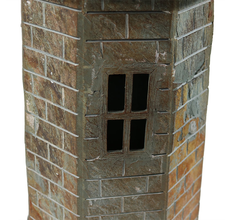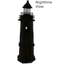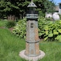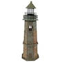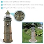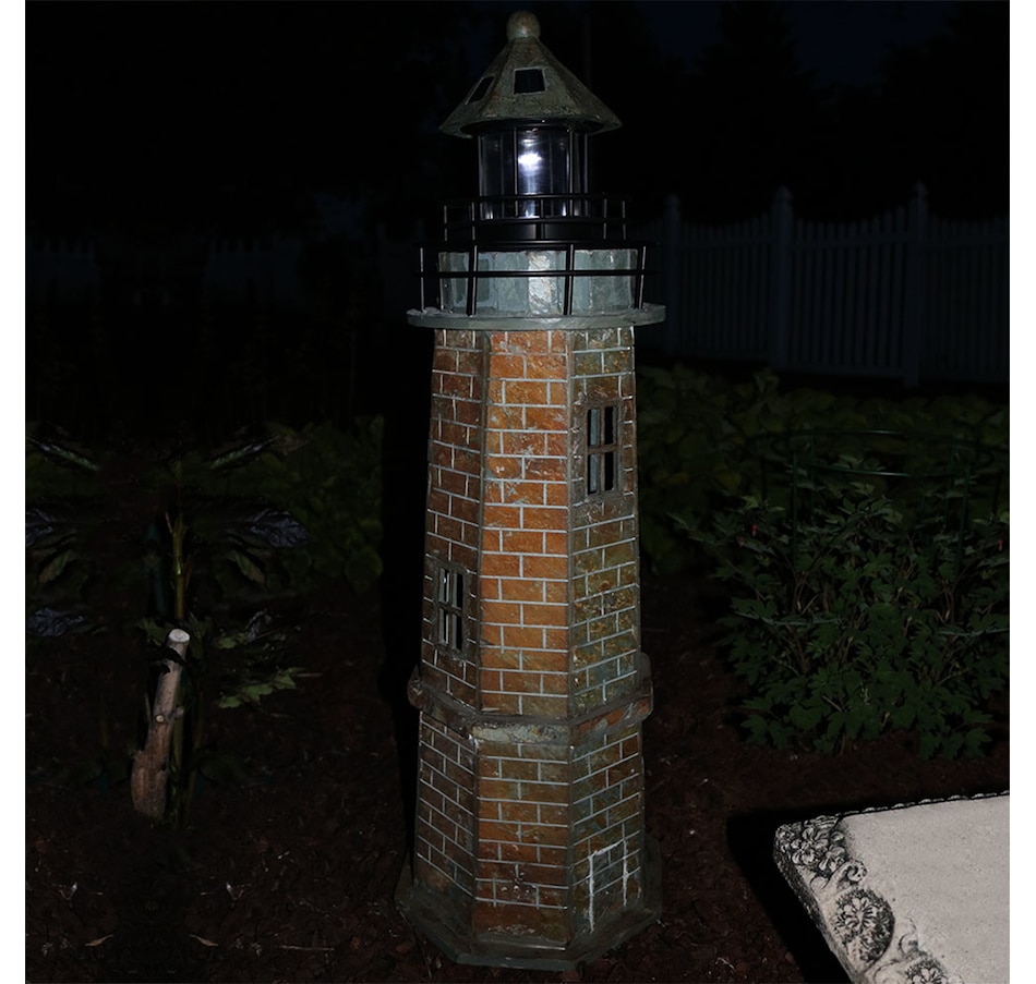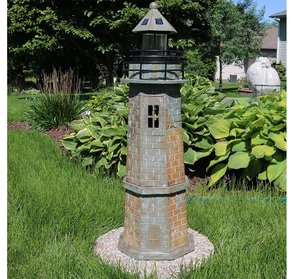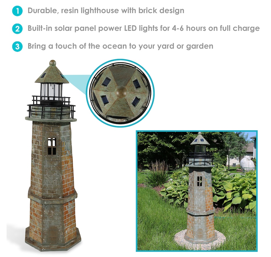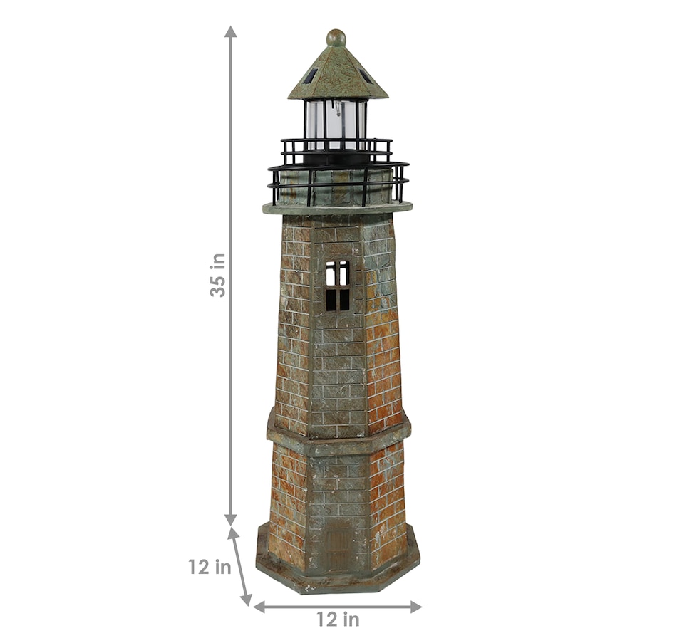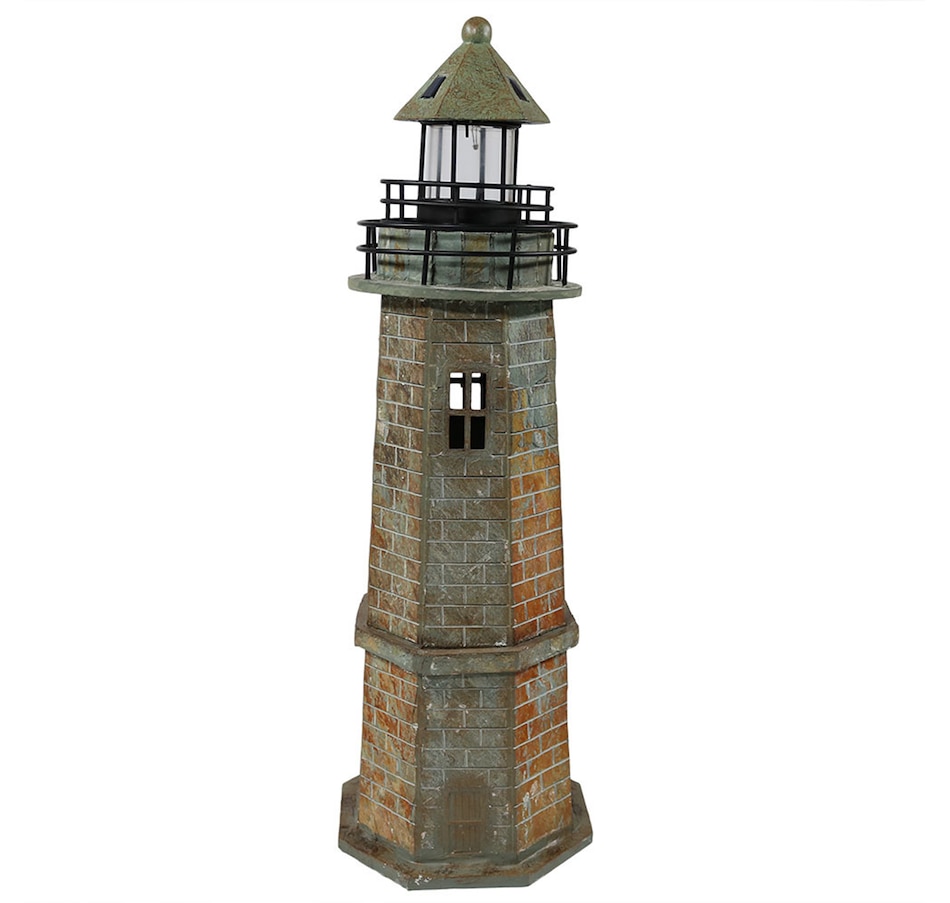 This outdoor lighthouse decor is sure to add charm to any backyard, patio, or other outdoor space in need of some nautical charm. Featuring a durable resin construction, this piece is engineered to impress and last. While made durably, the lighthouse also features stone-like design to look real without the extra hassle and maintenance. Place this lighthouse anywhere it will collect sunlight during the day to charge the solar battery for the LED, solar-powered light at the top of the lighthouse. The battery is housed below the built-in solar panel. This lighthouse is sure to illuminate any landscape throughout the evening. The battery will run for 4-6 hours after the sun has set. This realistic lighthouse will look stunning on the patio, by the pond, poolside, or standing tall on its own in the yard.