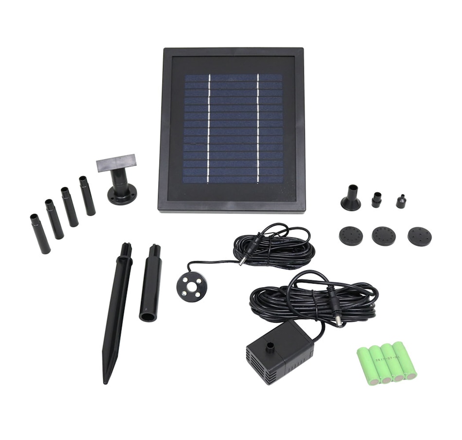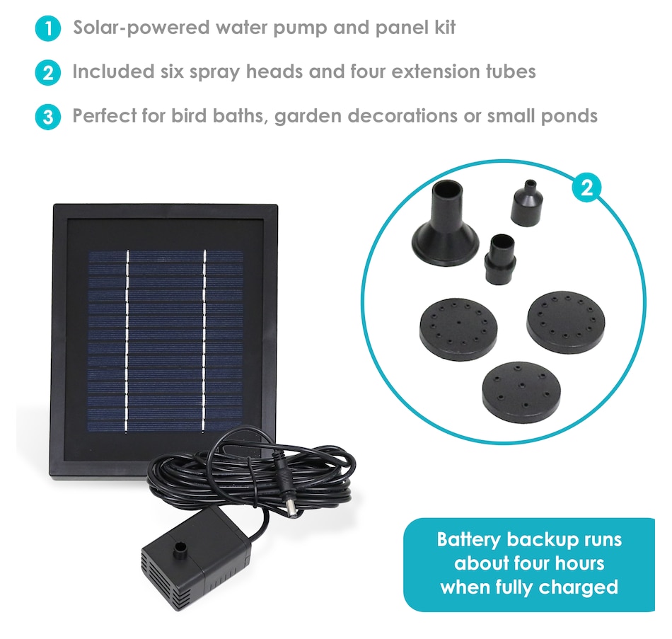 This solar pump with battery backup and panel kit is great for creating a solar garden fountain, converting an existing one to solar, adding movement to a birdbath to keep the mosquitoes away, or for bringing life to a pond. Create your own deluxe fountain experience! With a brushless pump, pane, LED lights, cables, ground stakes for stability, and wall-mounted hardware included, there's no telling what features of your outdoor space you can transform. With the solar panel charging the battery pack, there is no need to worry about any extra additions to the electricity bill. Please note that the battery generally lasts between 12-18 months, but with repeated charges and discharge cycles the battery will become less efficient and battery capacity may reduce.