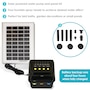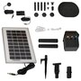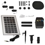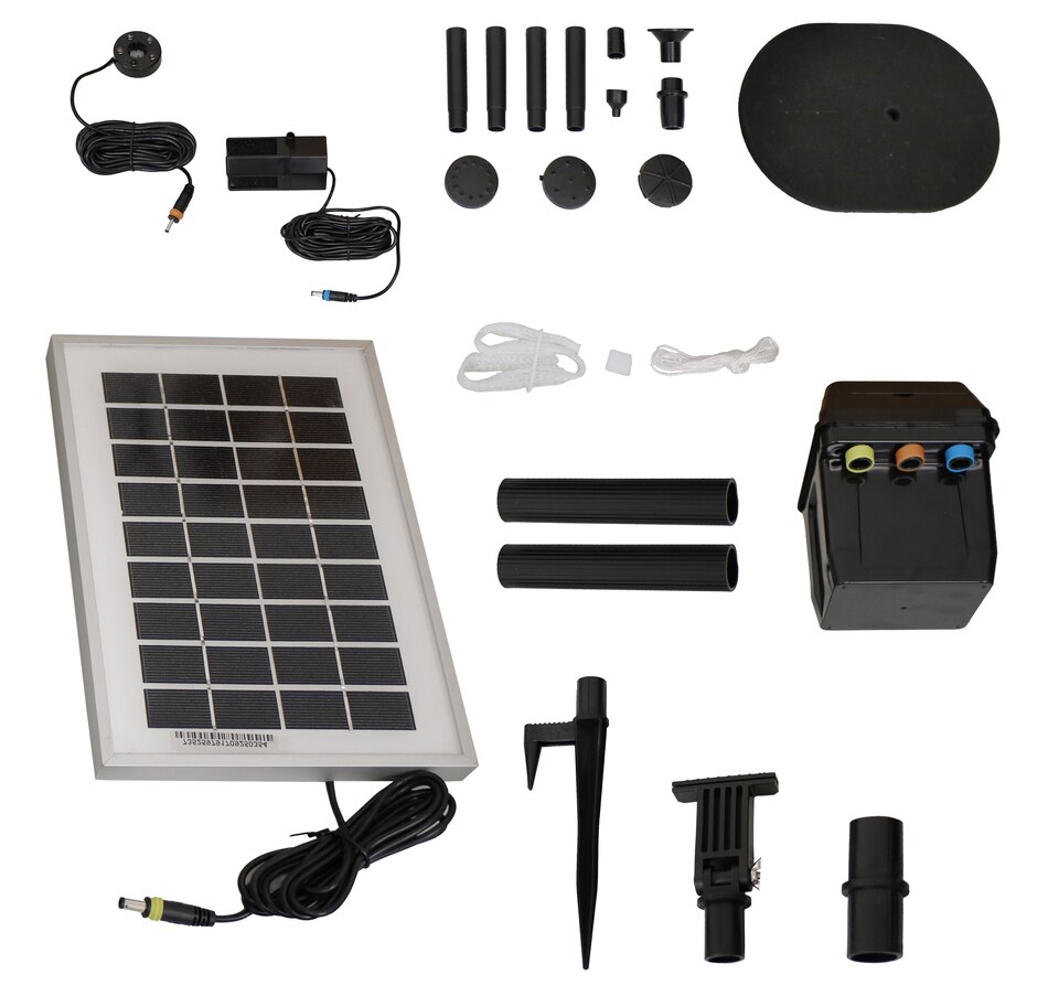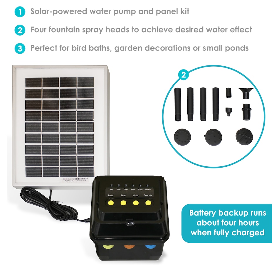 Make a DIY water fountain or convert an electric water fountain to solar with this easy-to-use outdoor fountain pump and solar panel kit with LED lights. This solar powered water fountain pump kit pushes water up to 36 inches and it is also great for man-made outdoor ponds and bird baths with at least a 6" water depth. It is optional to connect a 1/4" diameter hose to the pump. To use, simply place the panel in the ground in direct sunlight and connect the cord from the panel, the pump cable, and the LED light cable to the battery box. This kit includes a solar panel, a battery pack, a 7.5V-12V DC brushless pump, two 16 feet cables, 1 LED light ring, 4 spray heads, and four 2.5-inch extensions. With this kit, transform any outdoor area or water feature.