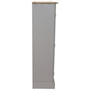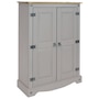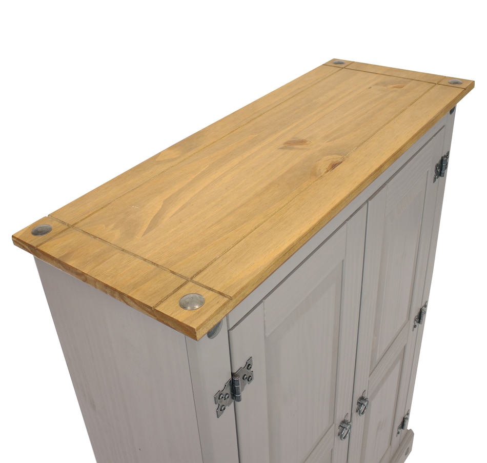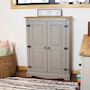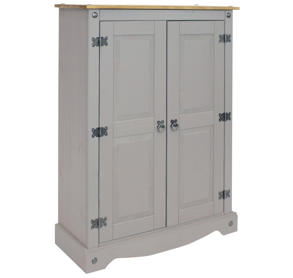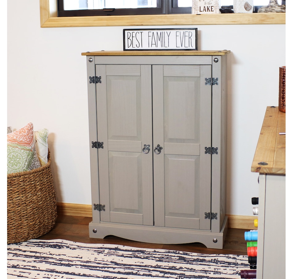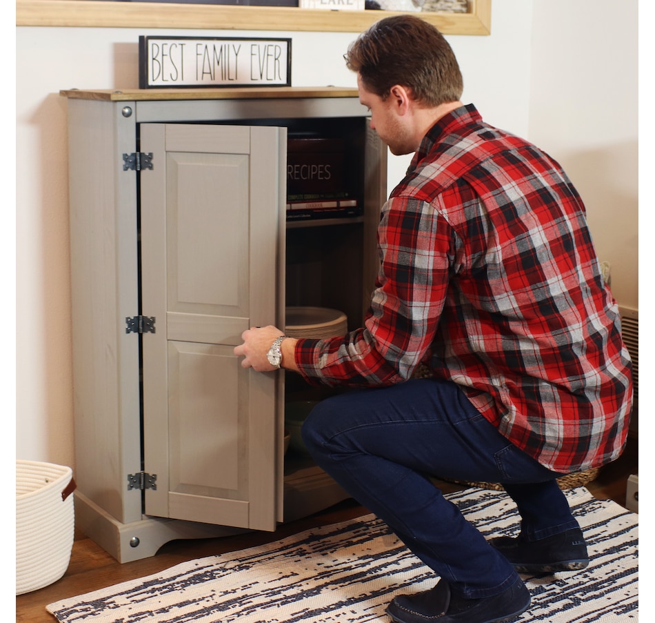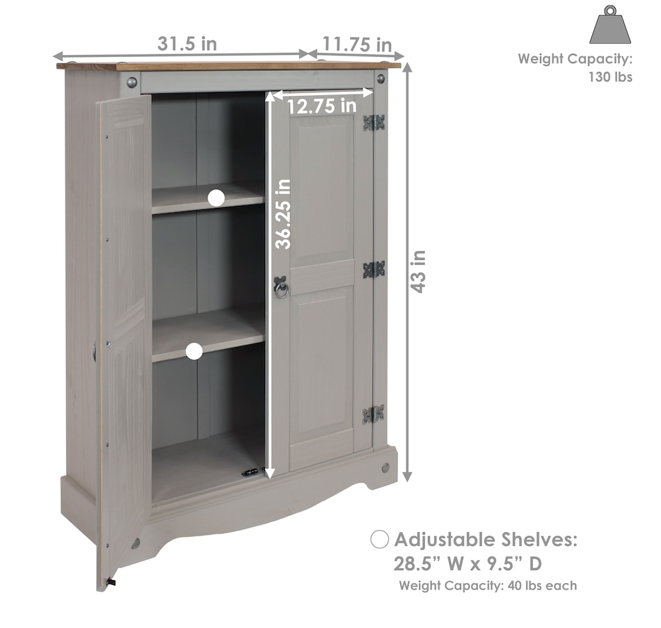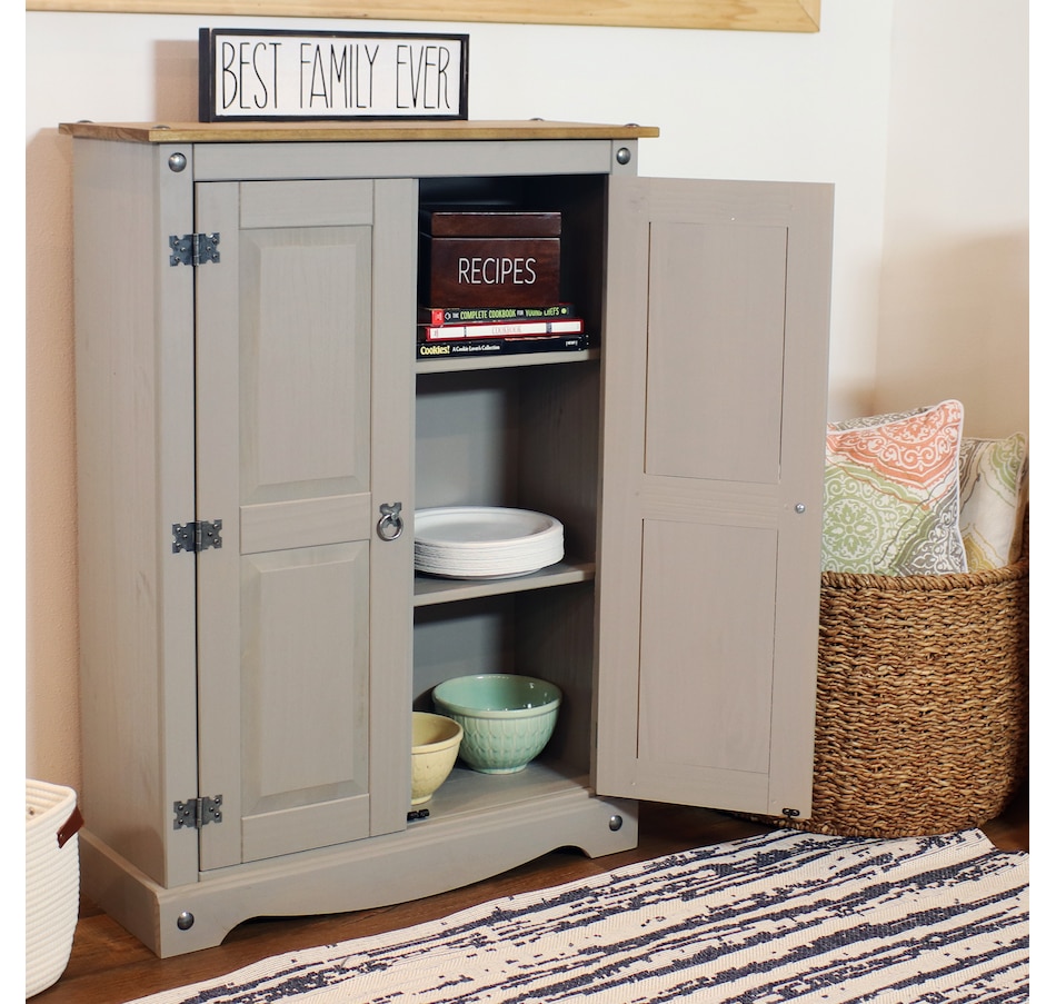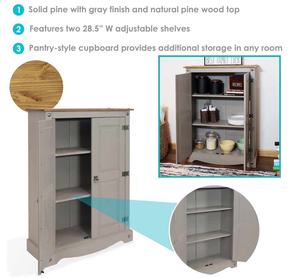 This sophisticated accent cupboard will add elegance and convenient storage to any room. Made of solid pine, the stylish storage cupboard features a two-tone color scheme with a pine cupboard top and a gray finish. The two doors feature beautifully molded details that will complement a variety of decor and furniture styles. Zinc alloy door pulls and hinges give the cabinet an antique appearance. This rustic sideboard cabinet has a sturdy construction and an overall weight capacity of 130 lbs. The accent cabinet has two interior shelves to keep your items neatly organized. Each shelf has a weight capacity of 40 lbs. This versatile cabinet is designed for indoor use and is a wonderful addition to the bedroom, living room, office, or sunroom. Use it to hide away unsightly clutter and store a variety of items, including books and media, pots and pans, cleaning supplies, and arts and crafts items.