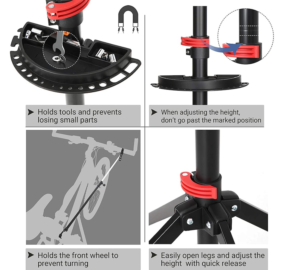 • Songmics notes: when adjusting the height, don’t exceed the marked position on the tube and keep the mark unexposed; before moving the repair stand, please remove your bicycle; during repair or assembly, do not move the 4 legs of this stand.