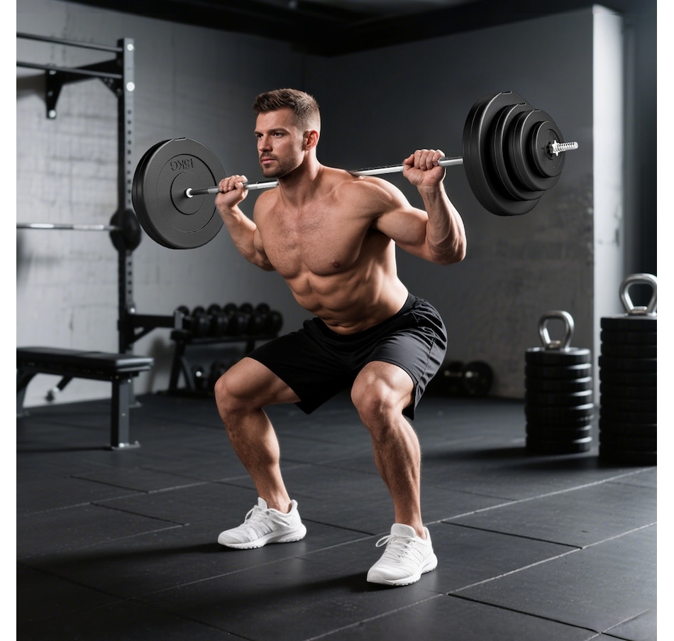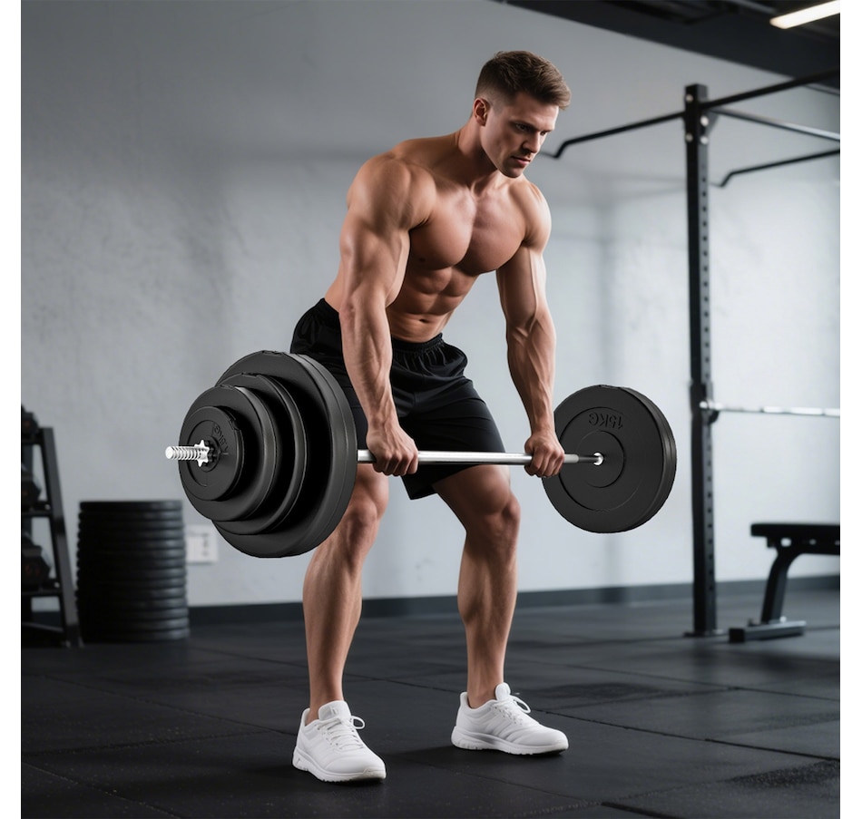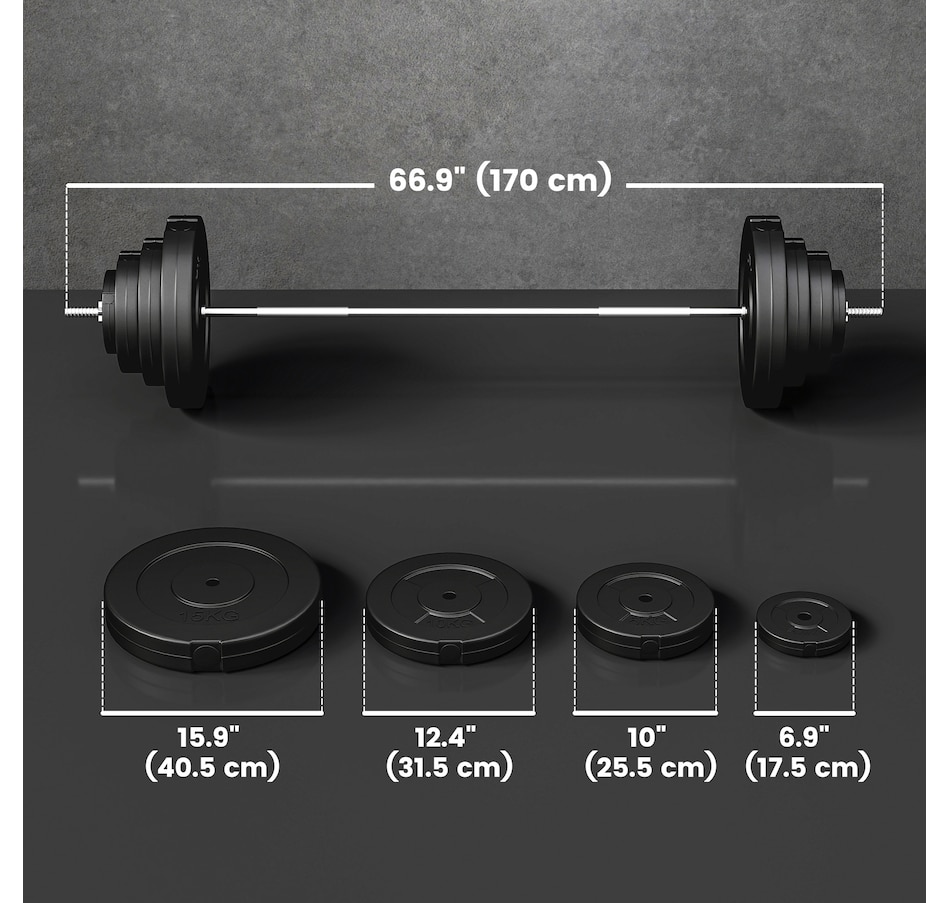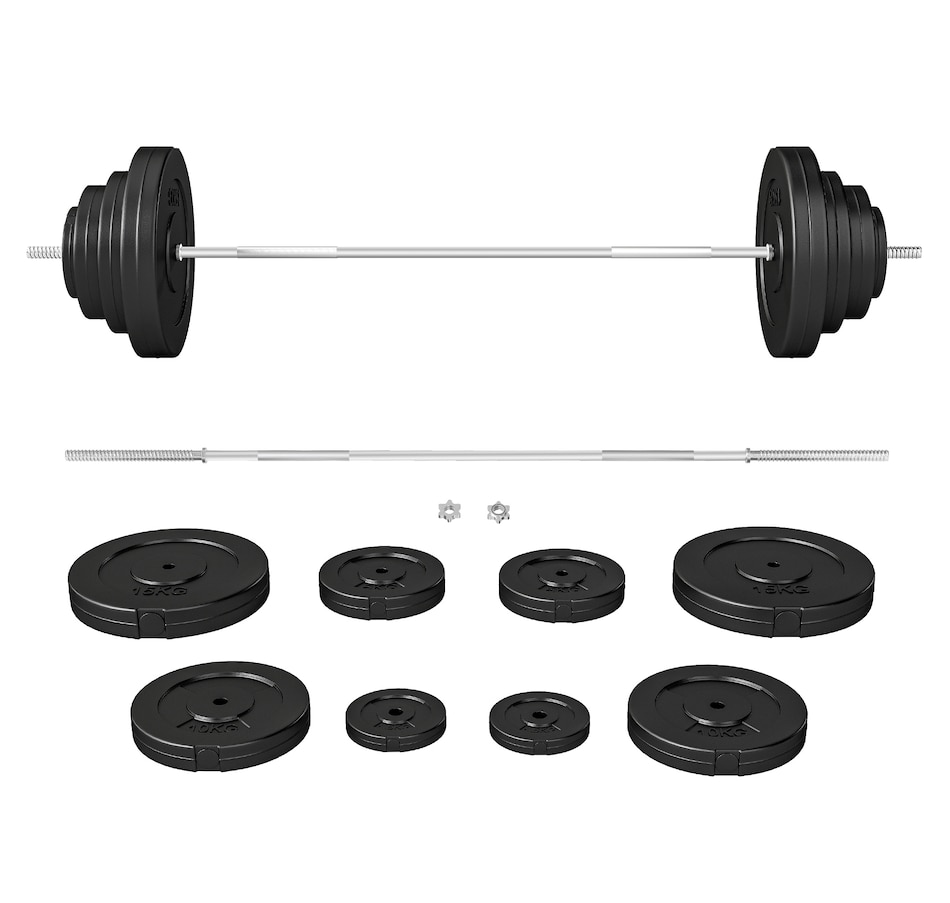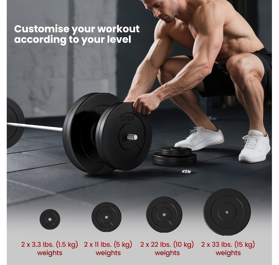 Get a full-body workout with Soozier's 154 lbs (70 kg) barbell and weight set. It comes with two 33 lbs, two 22 lbs, two 11 lbs, and two 3 lbs discs, plus a 15 lbs barbell. Easily tailor the weight to fit your routine at home or the gym. Safety is enhanced with two locking clips that secure the discs in place during your workout. The barbell's textured surface ensures a steady, firm grip.Features: