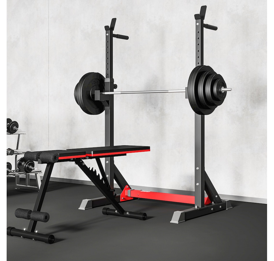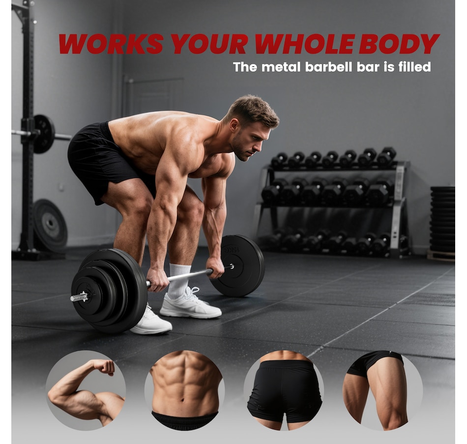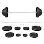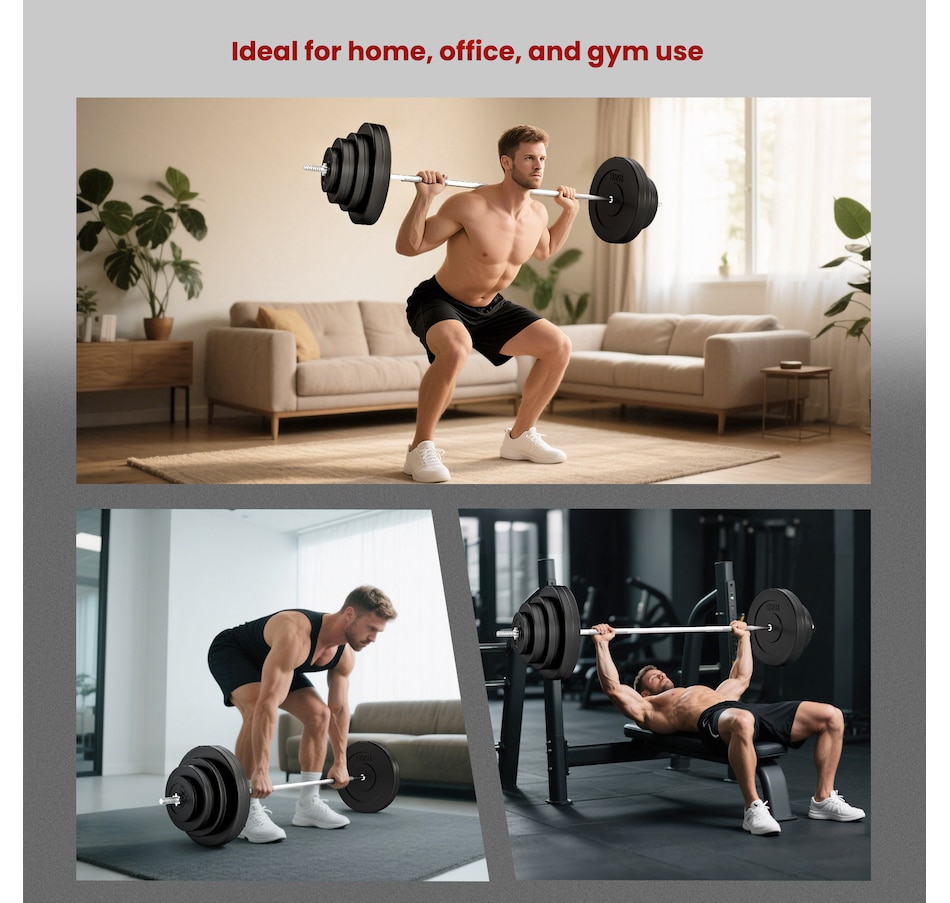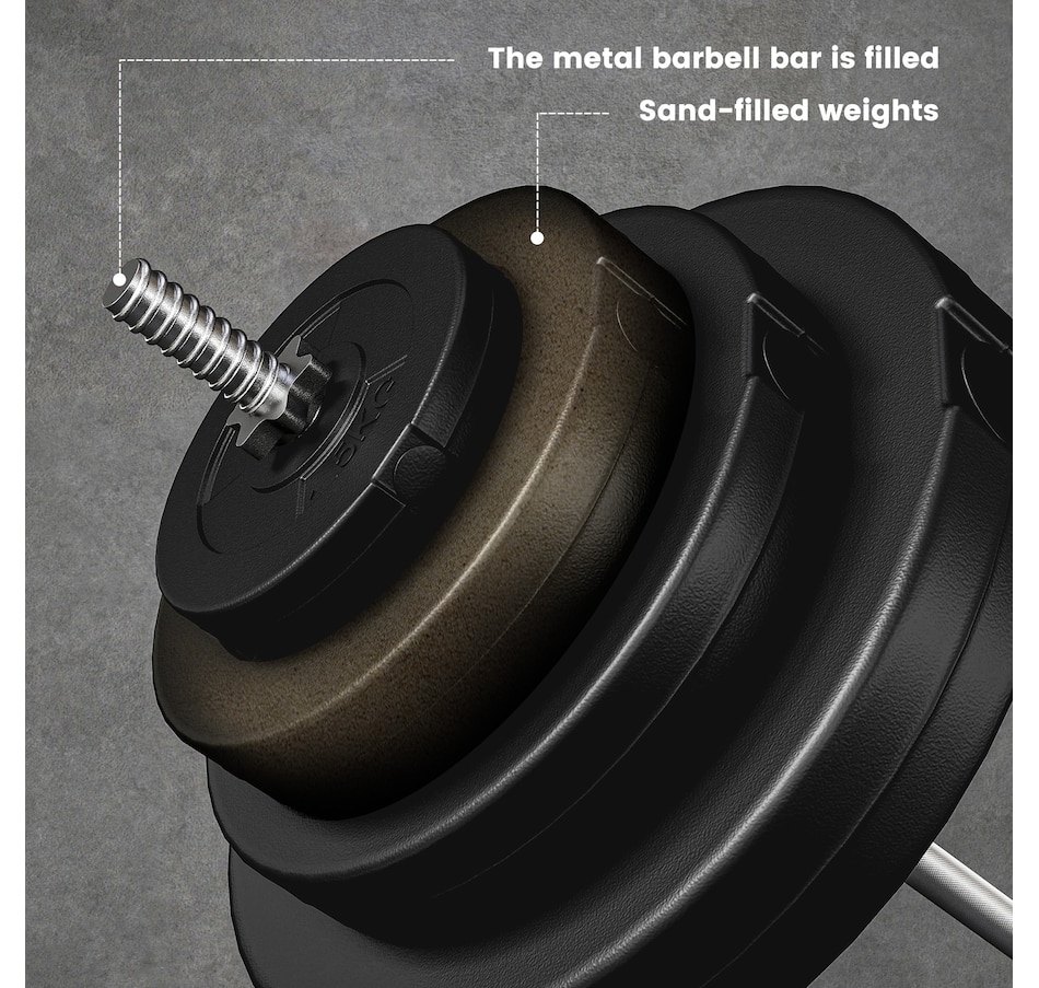 Get a full-body workout with Soozier's 154 lbs (70 kg) barbell and weight set. It comes with two 33 lbs, two 22 lbs, two 11 lbs, and two 3 lbs discs, plus a 15 lbs barbell. Easily tailor the weight to fit your routine at home or the gym. Safety is enhanced with two locking clips that secure the discs in place during your workout. The barbell's textured surface ensures a steady, firm grip.Features: