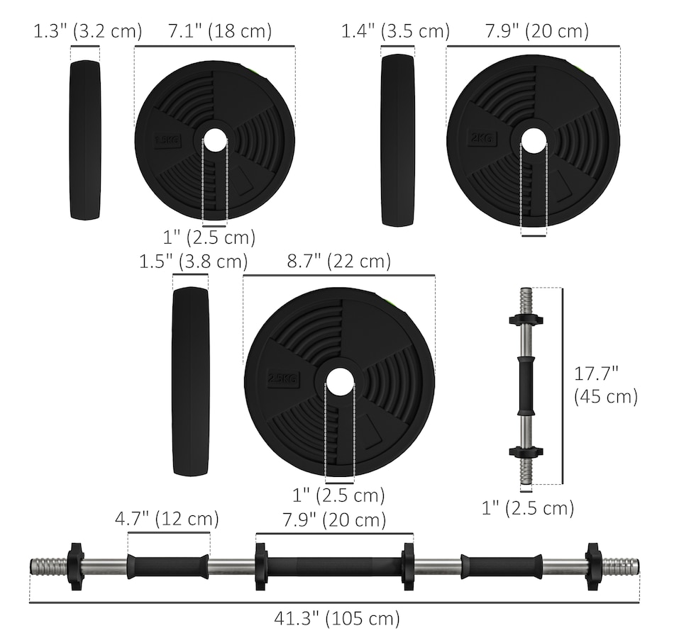 ● Dumbbell Bar: Φ1" x 17.7" L (Φ2.5 x 45L cm)