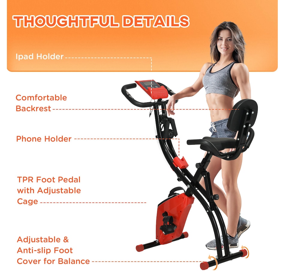 Get a complete cardio workout from the comfort of your own home with this foldable exercise bike from Soozier! The stationary bike includes an LCD Display allows you to maintain a regular workout routine while burning fat, increasing leg strength, and improving your overall cardiovascular health. It can be used as an upright exercise bike, a recumbent bike, and with a tension rope to improve upper body strength.Features:
