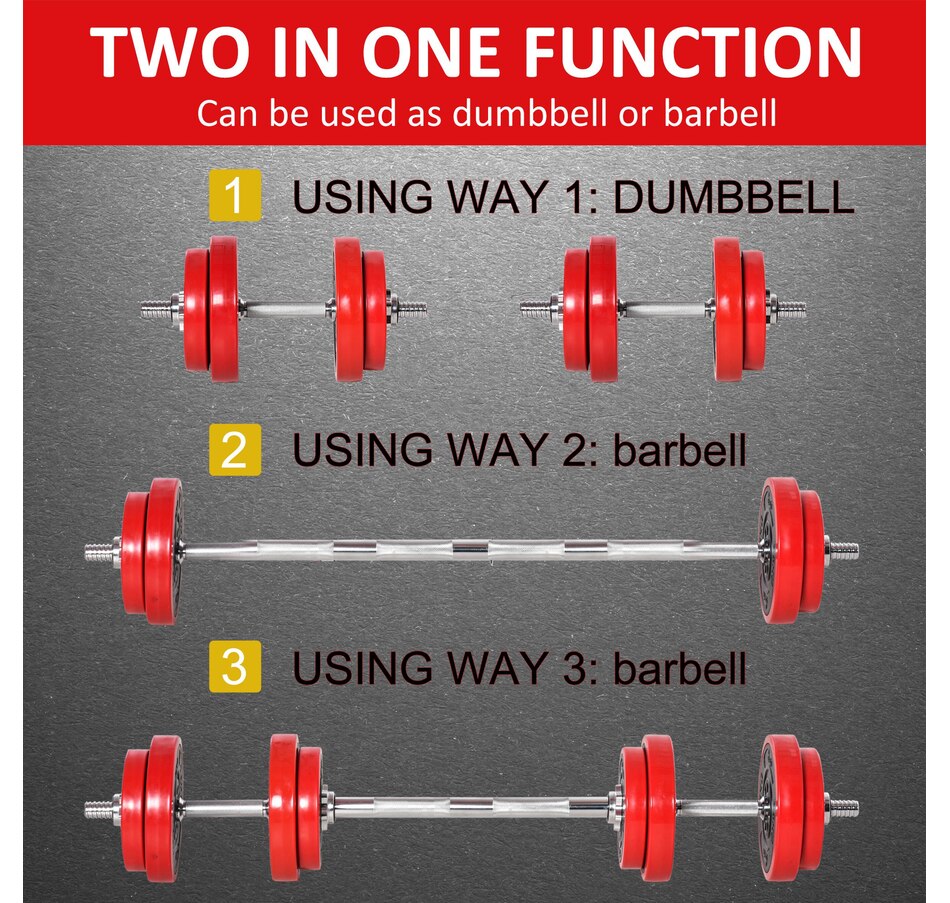 ● 2 in 1 dumbbell and barbell set for a total of 44 lbs;