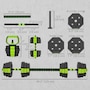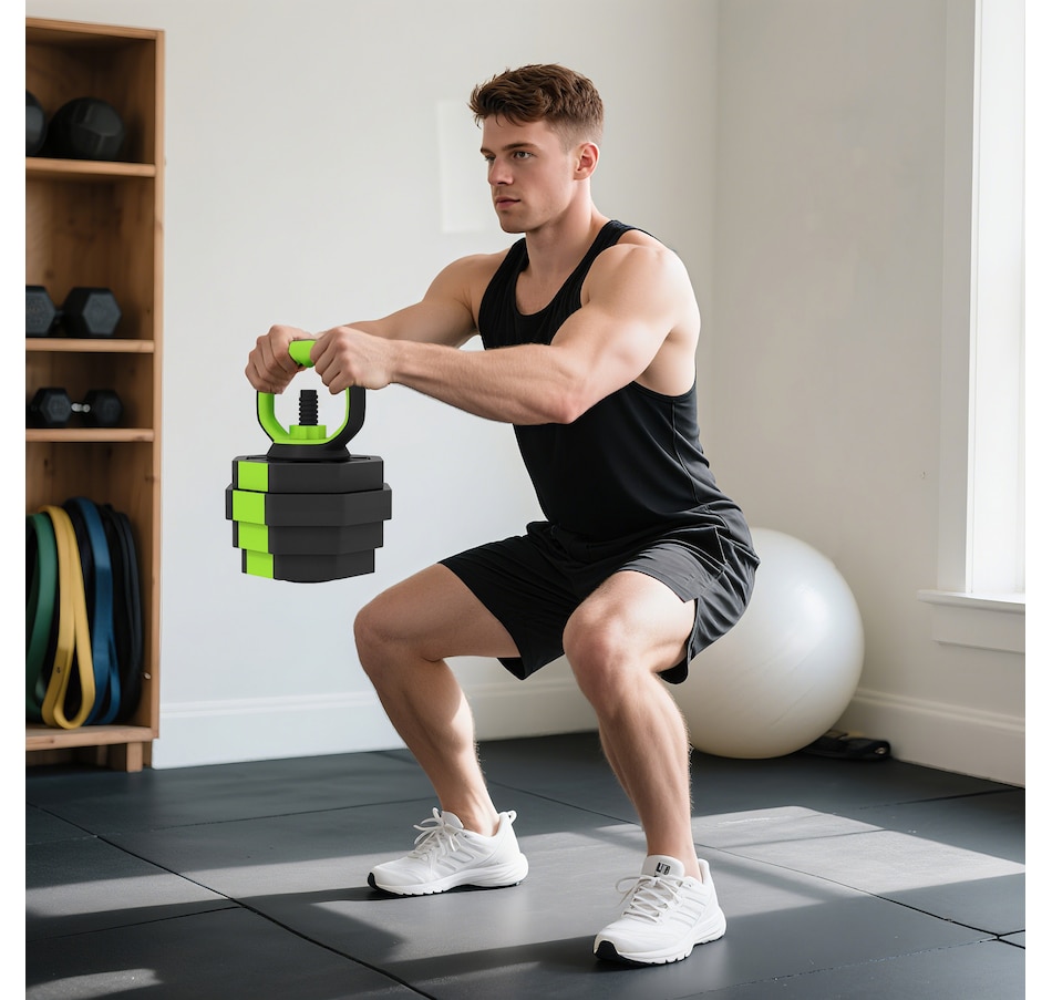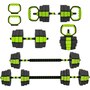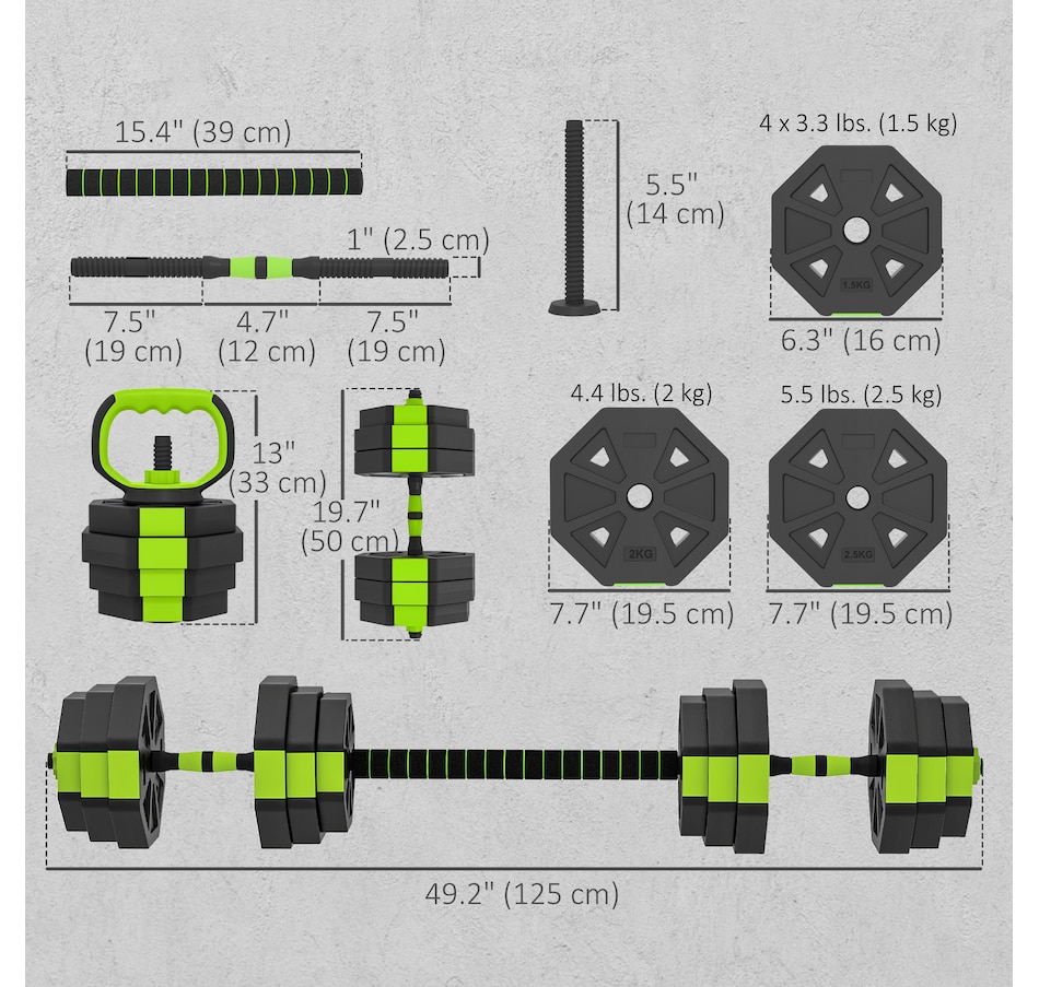 ● 55 lbs. (25 kg) 6-in-1 set: dumbbells, barbells, kettlebells and push-up stands;
