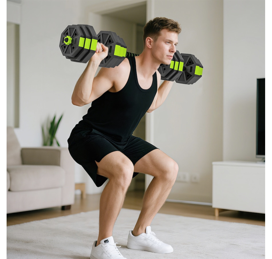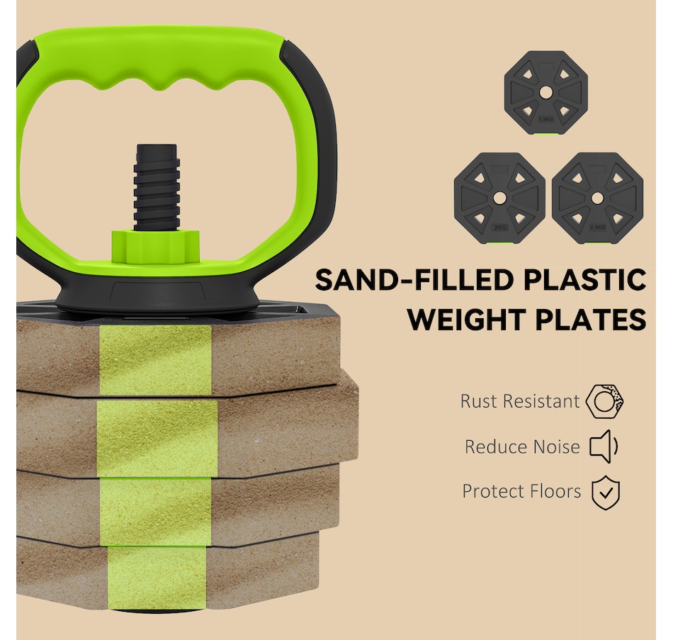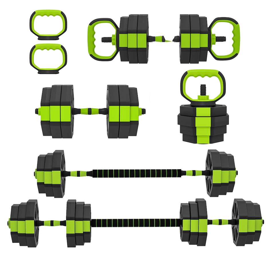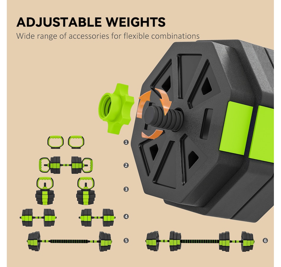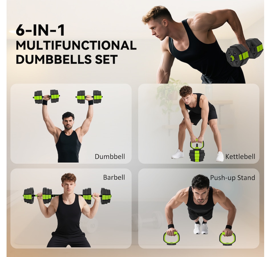 This 6-in-1 Soozier adjustable dumbbell set can be used as dumbbells, barbells, kettlebells and a push-up stand; it's super easy to switch up your routine whenever you desire. Add or lower the adjustable weights so you're comfortable when exercising - suitable for beginners and experts. Great for bicep curls, squats, shrugs, lunges, bench presses and more, allowing you to work your entire body. This is a great way to start your fitness journey, improving your strength and overall health.Features: