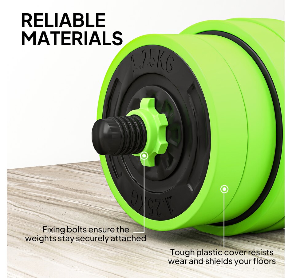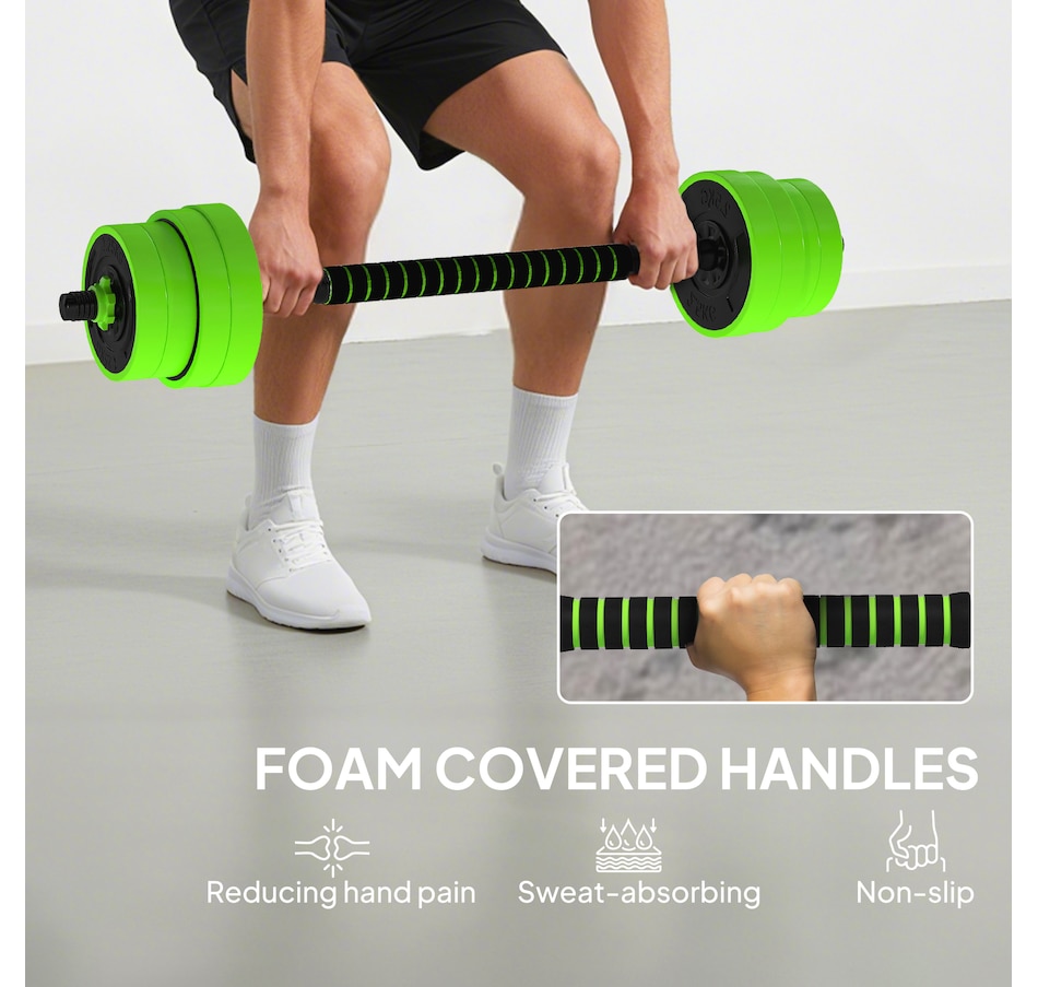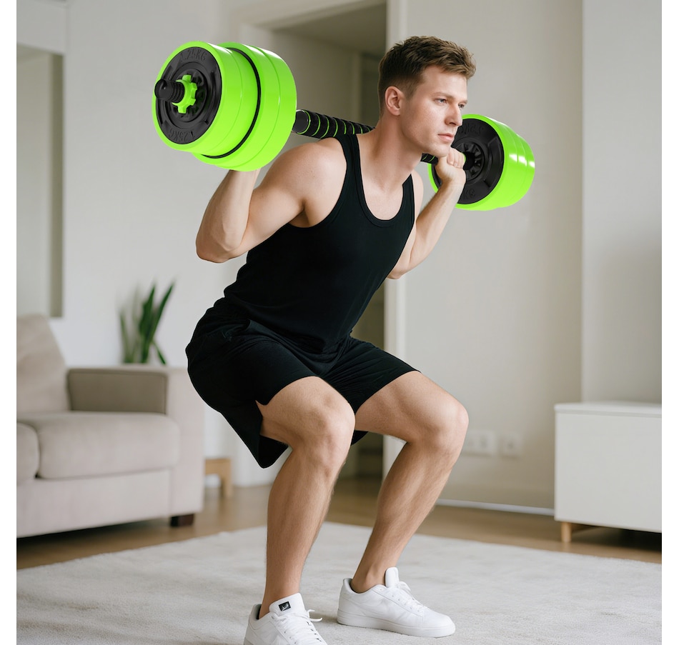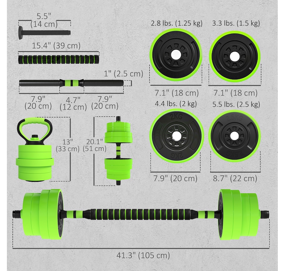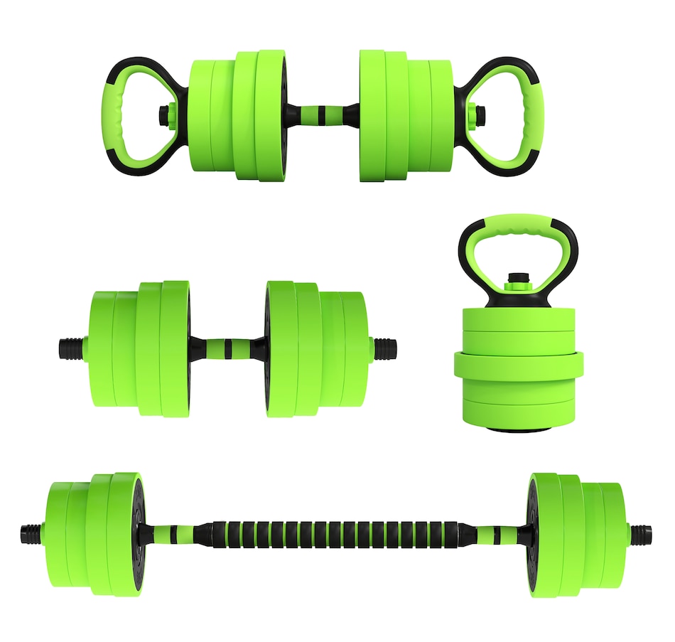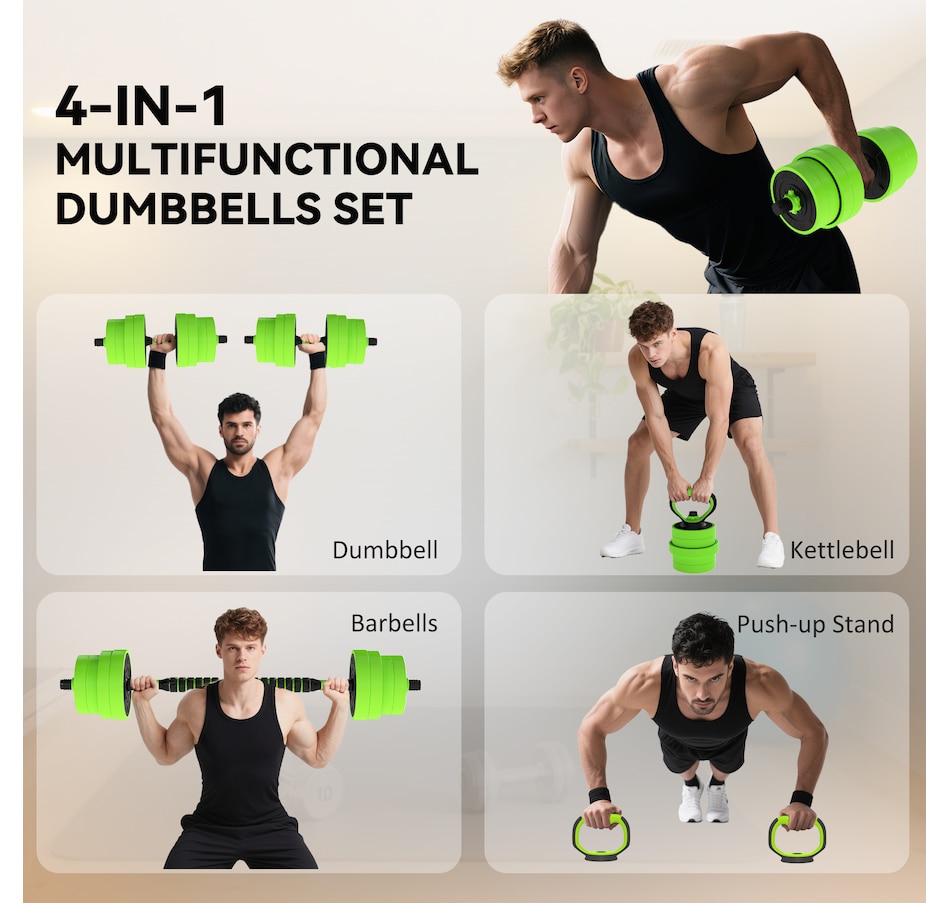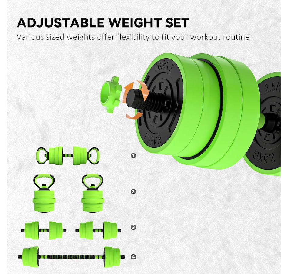 This 4-in-1 Soozier adjustable dumbbell set can be used as dumbbells, barbells, kettlebells and a push-up stand; it's super easy to switch up your routine whenever you desire. Add or lower the adjustable weights so you're comfortable when exercising—suitable for beginners and experts. Great for bicep curls, squats, shrugs, lunges, bench presses and more, allowing you to work your entire body. This is a great way to start your fitness journey, improving your strength and overall health.Features: