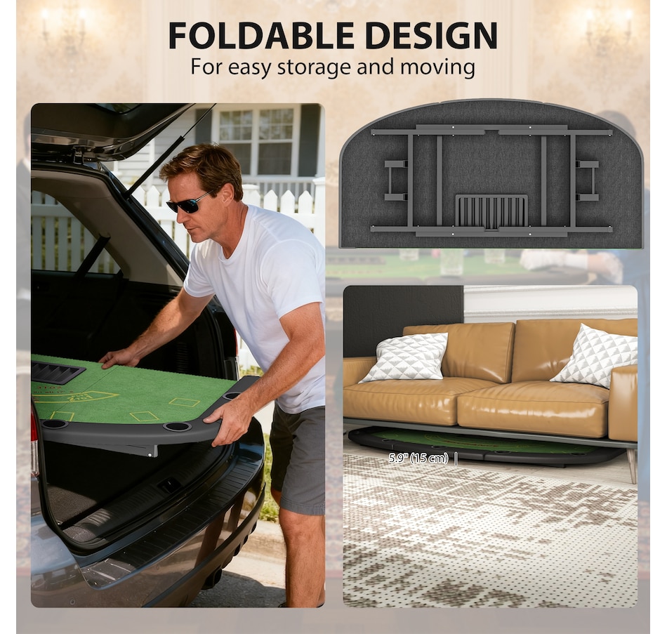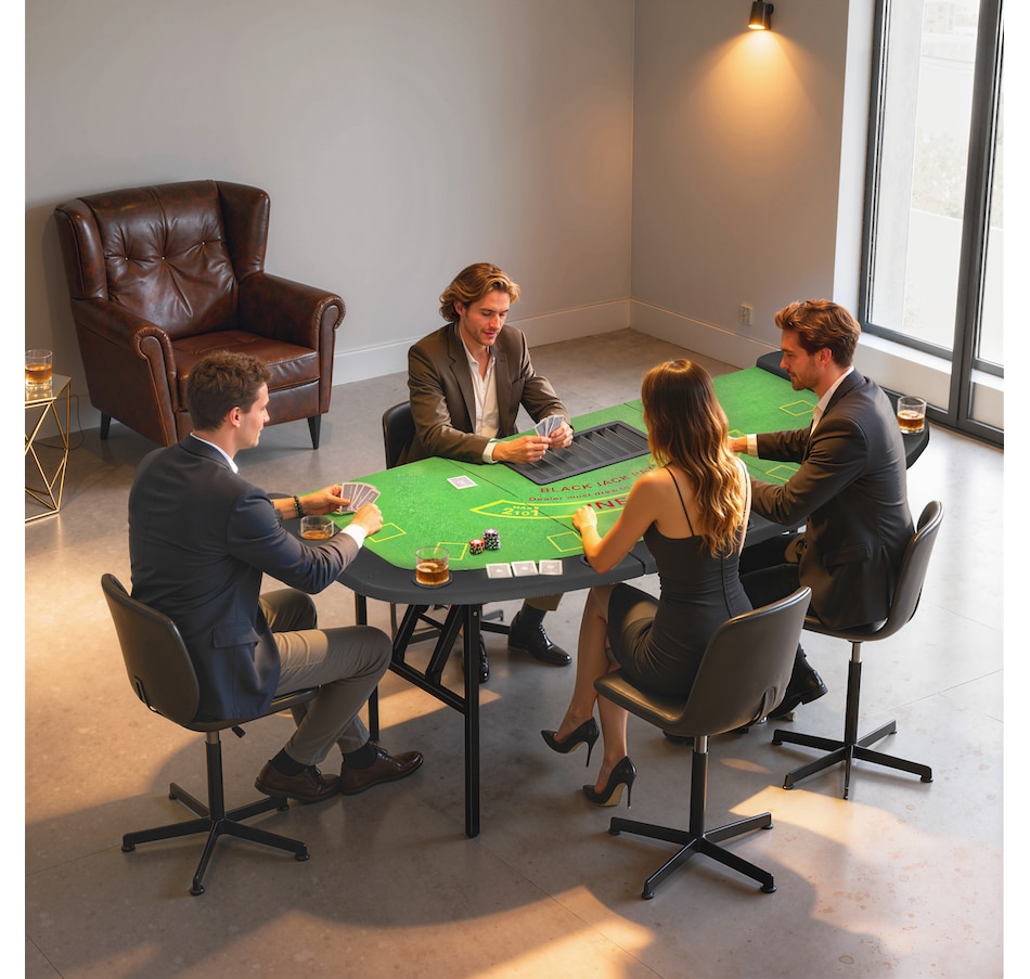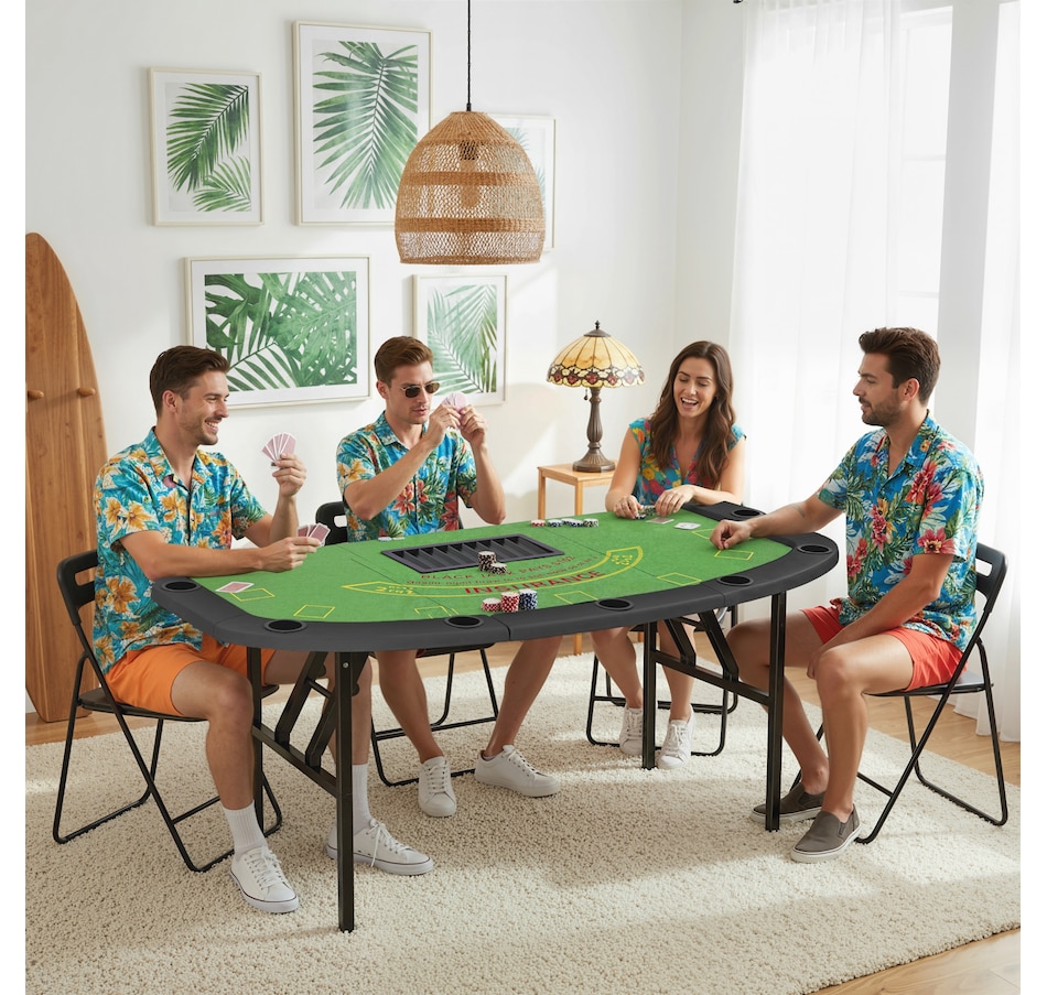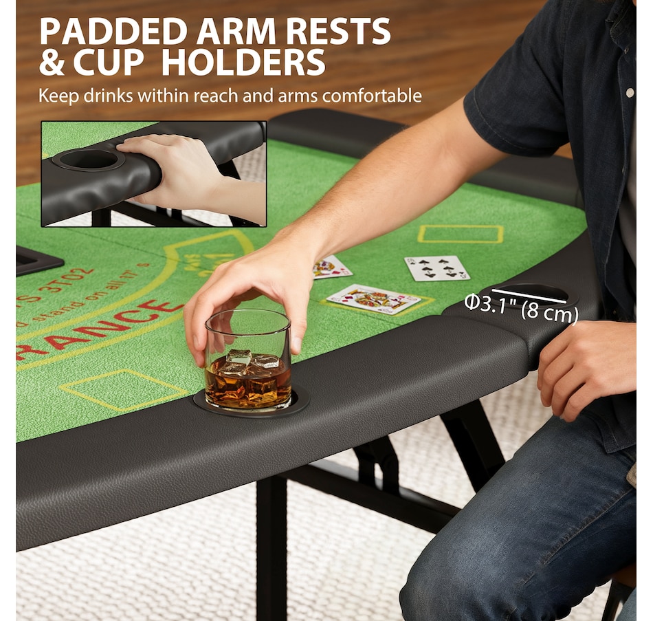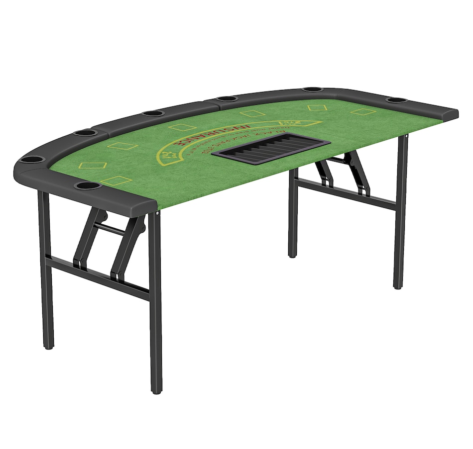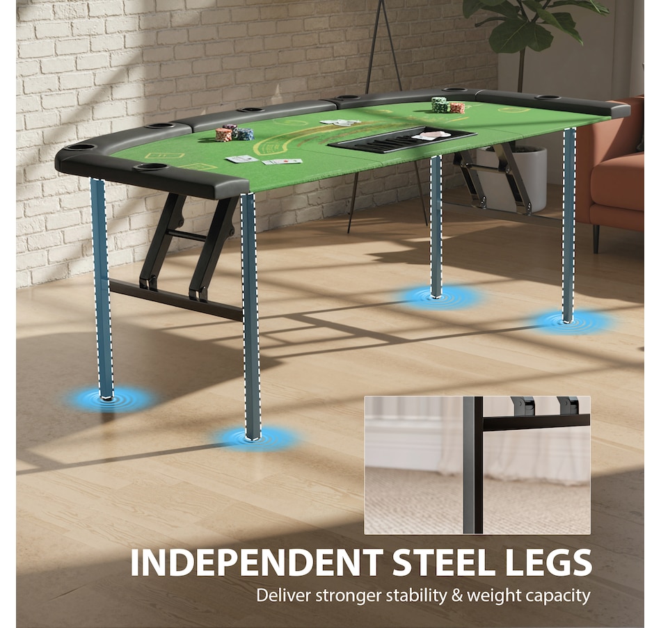 Bring the excitement of the casino home with the Soozier folding poker table, designed to seat up to eight players. Featuring a professional blackjack layout, dealer spot, and 9-row chip tray, it offers an authentic gaming experience. Four independent steel legs ensure superior stability, while padded rails and built-in cup holders provide comfort and convenience all night long.Features: