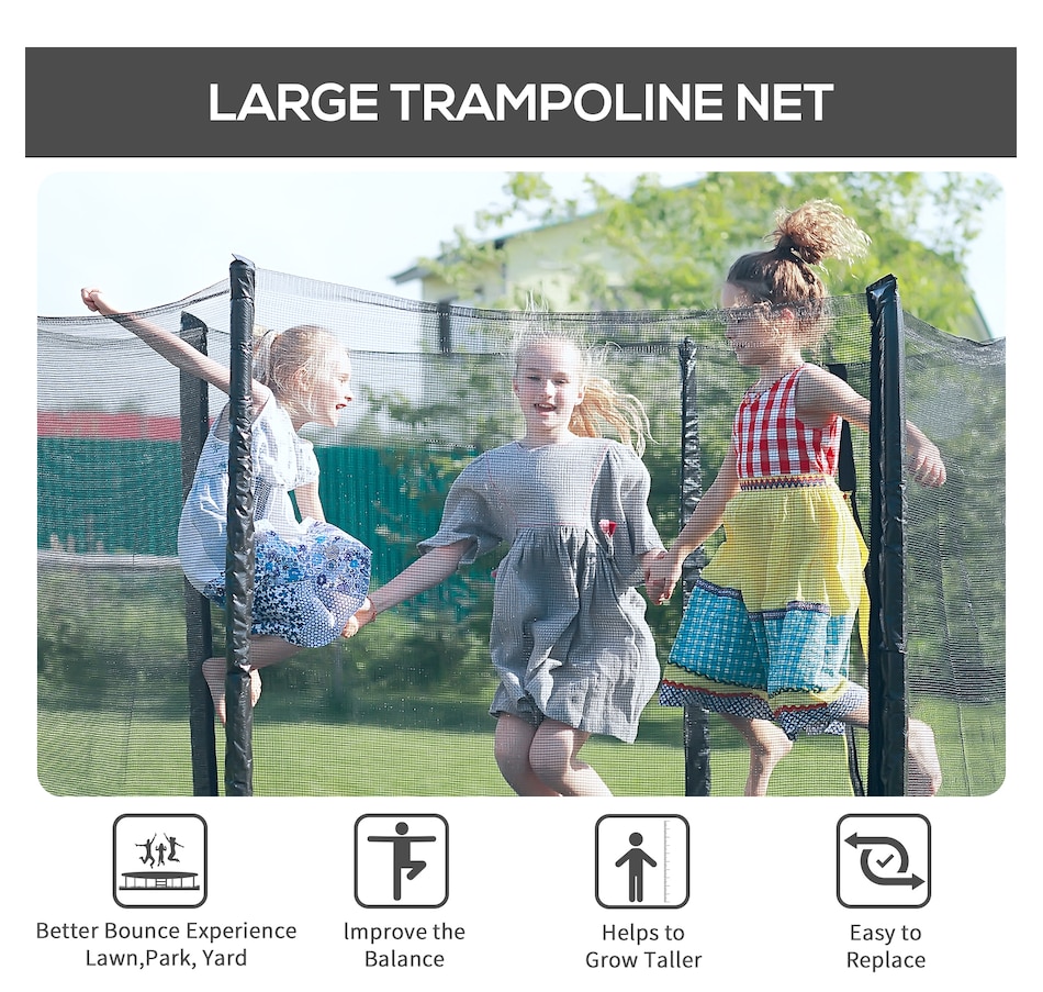 This Soozier's premium safety enclosure net is to be attached onto the 8' round trampoline pad. It is able to completely enclose and provide full protection against bouncing out of the mat or contacting with the frames. Replace your old and worn-out netting with this new product! start a new era of jumping and have great fun!