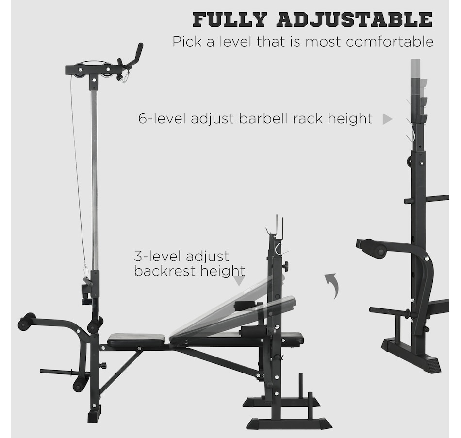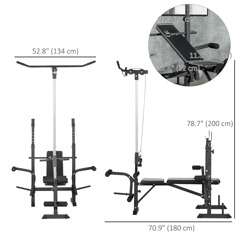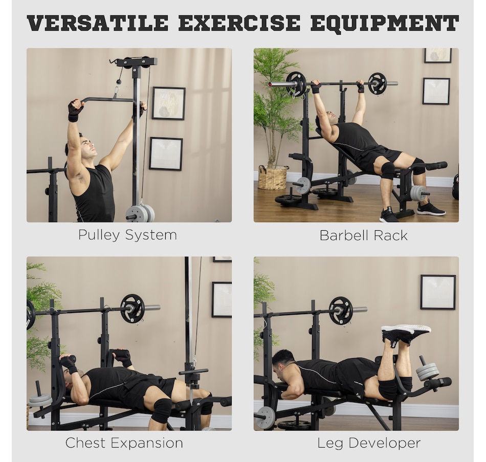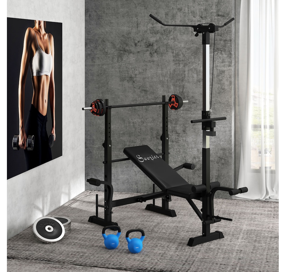 When the size of your home gym is limited, you need a more comprehensive capacity of workouts in your space! This Soozier's multi-station exercise bench will target numerous muscle groups for full-body strength training in a piece of equipment. This high-level fitness bench features a high pulley, butterfly curl, leg curl, bench press, and a barbell rack. Our flat bench features a soft seat and back made with sweat and odor-free fabric, so your workout will feel good in multiple ways.Features: