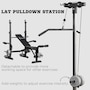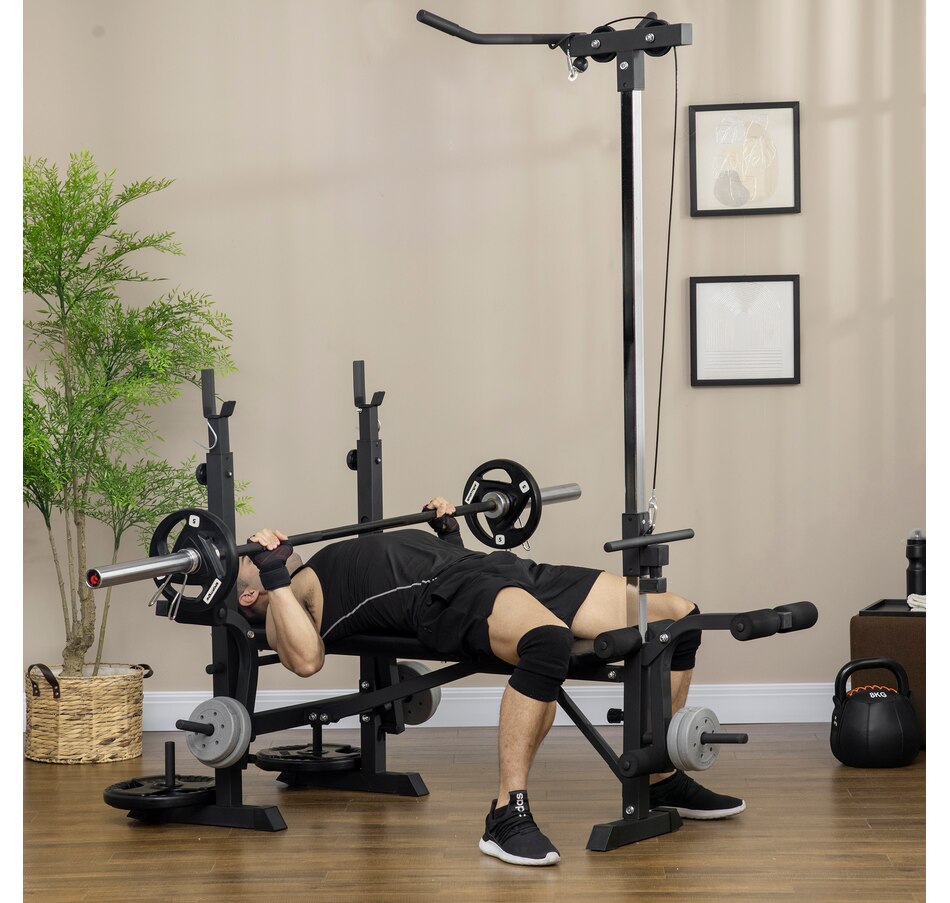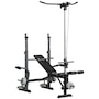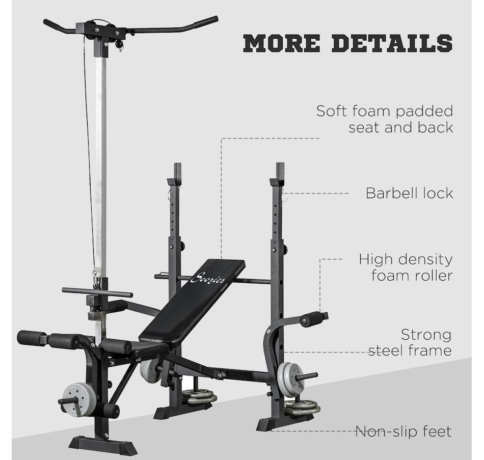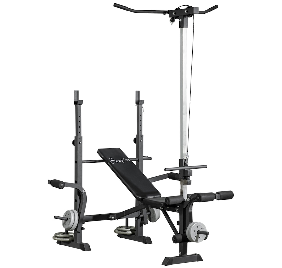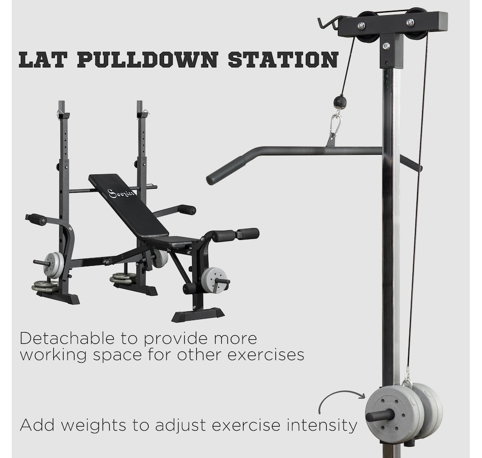 When the size of your home gym is limited, you need a more comprehensive capacity of workouts in your space! This Soozier's multi-station exercise bench will target numerous muscle groups for full-body strength training in a piece of equipment. This high-level fitness bench features a high pulley, butterfly curl, leg curl, bench press, and a barbell rack. Our flat bench features a soft seat and back made with sweat and odor-free fabric, so your workout will feel good in multiple ways.Features: