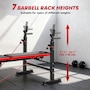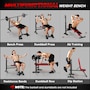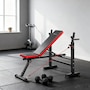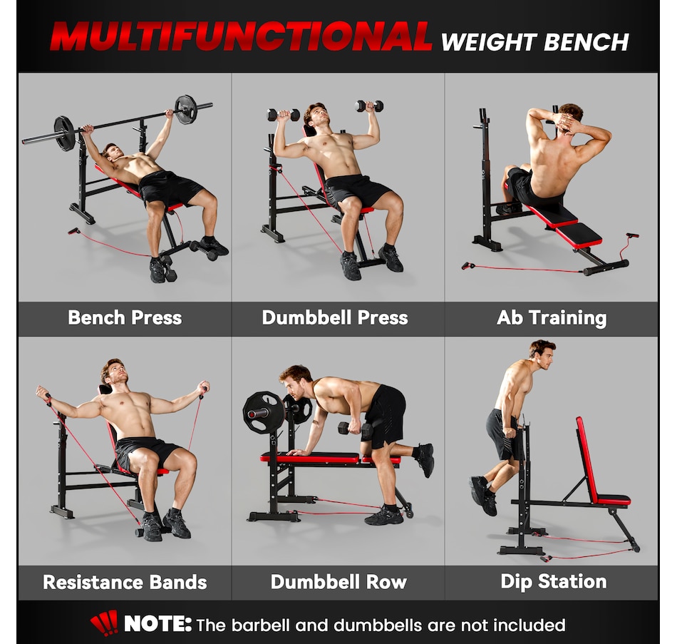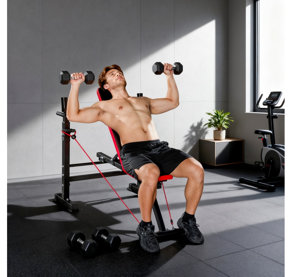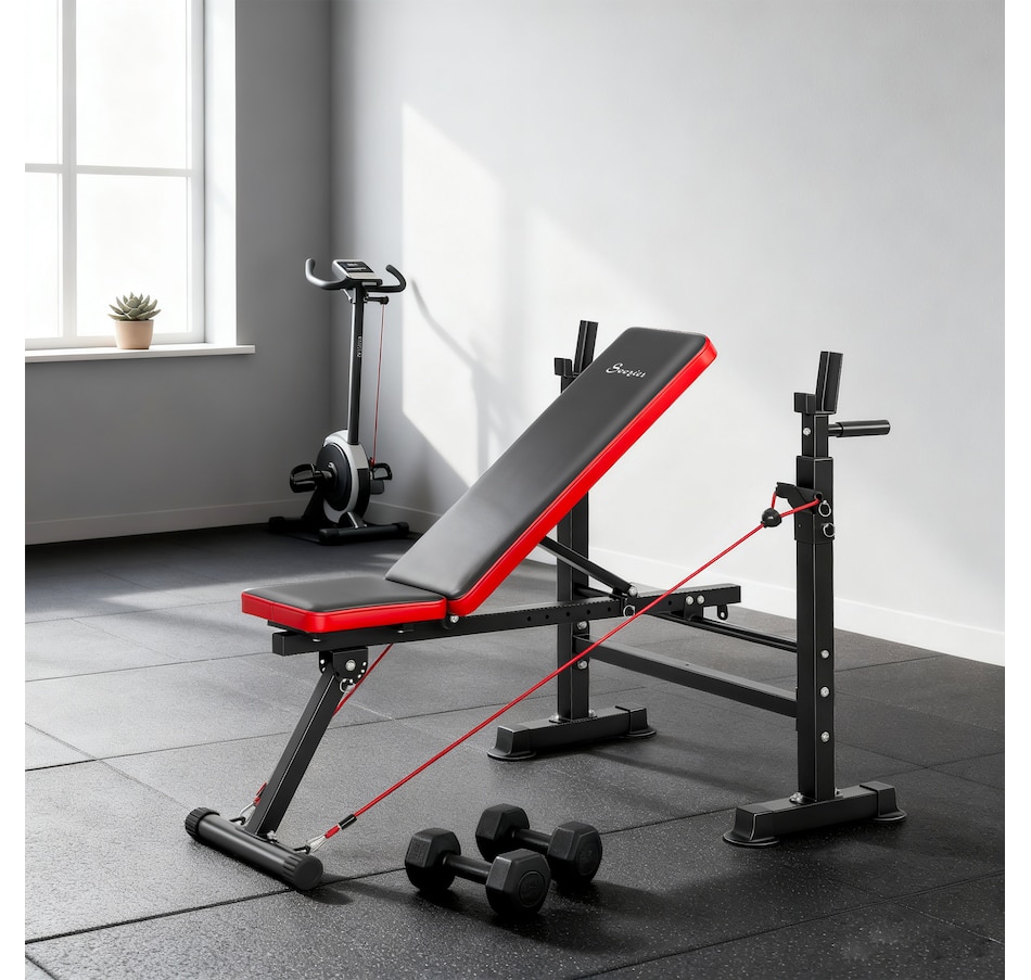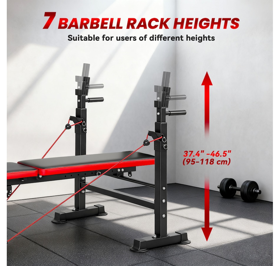 ● Multifunctional weight bench with integrated barbell rack for full-body training;