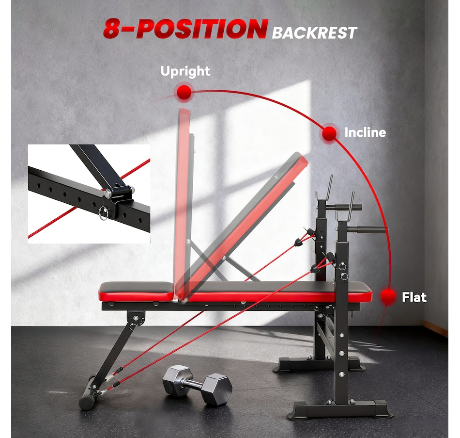 Turn your home into a personal gym with Soozier adjustable weight bench and squat rack combo. Suitable for bench press, squats, and full-body training, it saves space while replacing multiple bulky machines. The 7-level barbell rack and 8-position bench backrest let you easily switch between flat, incline, and upright angles, so you can customize every workout, target different muscles, and stay challenged as you get stronger.Features:
