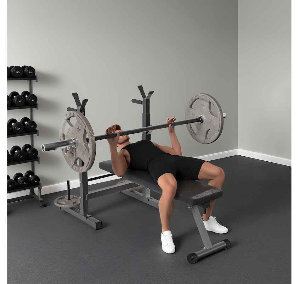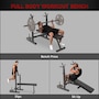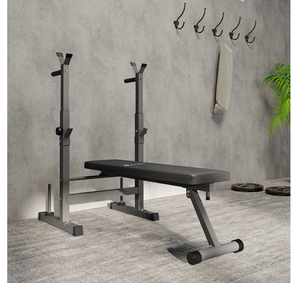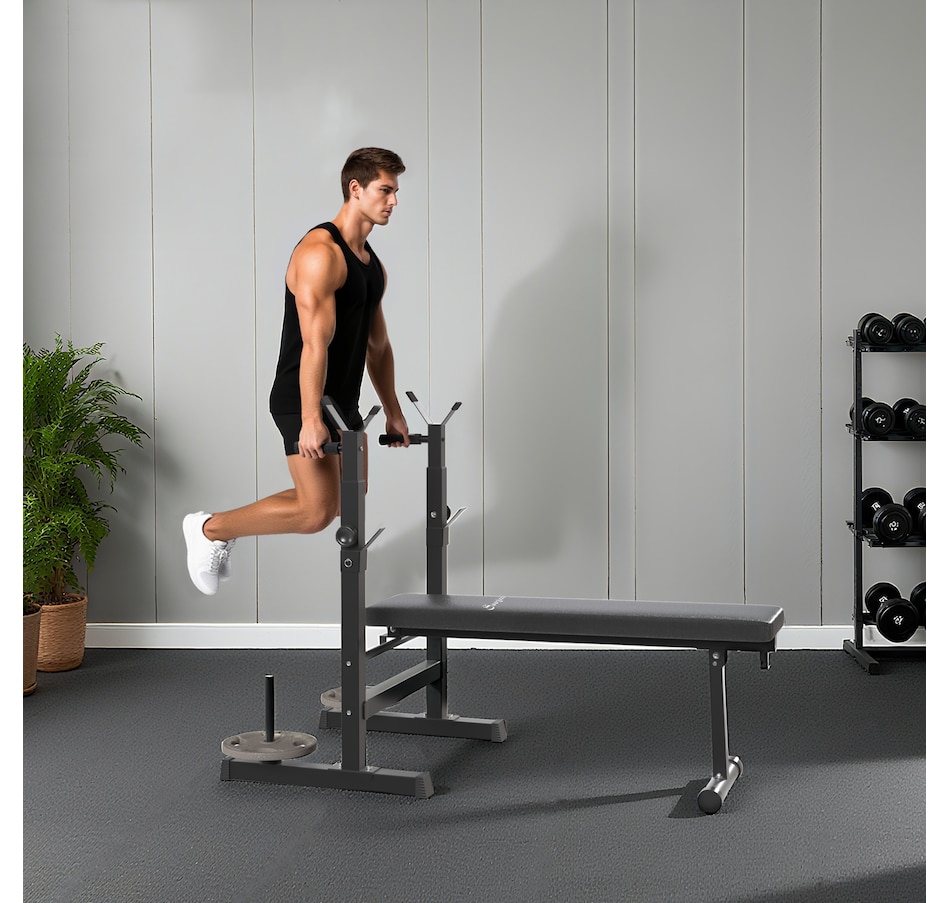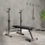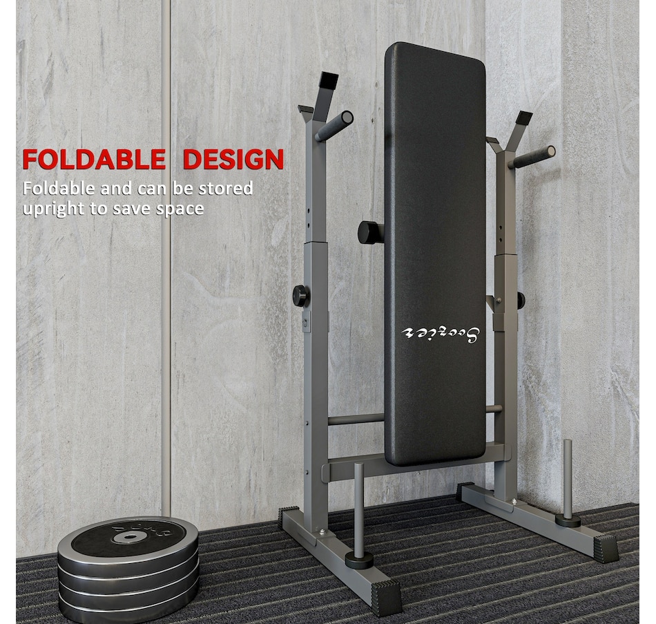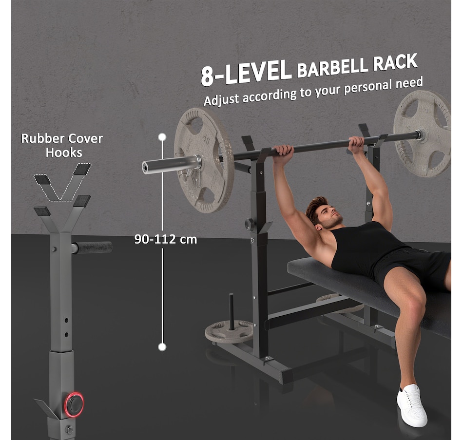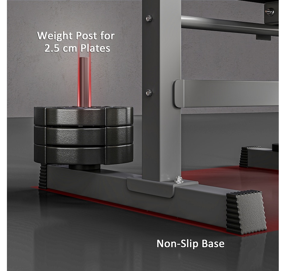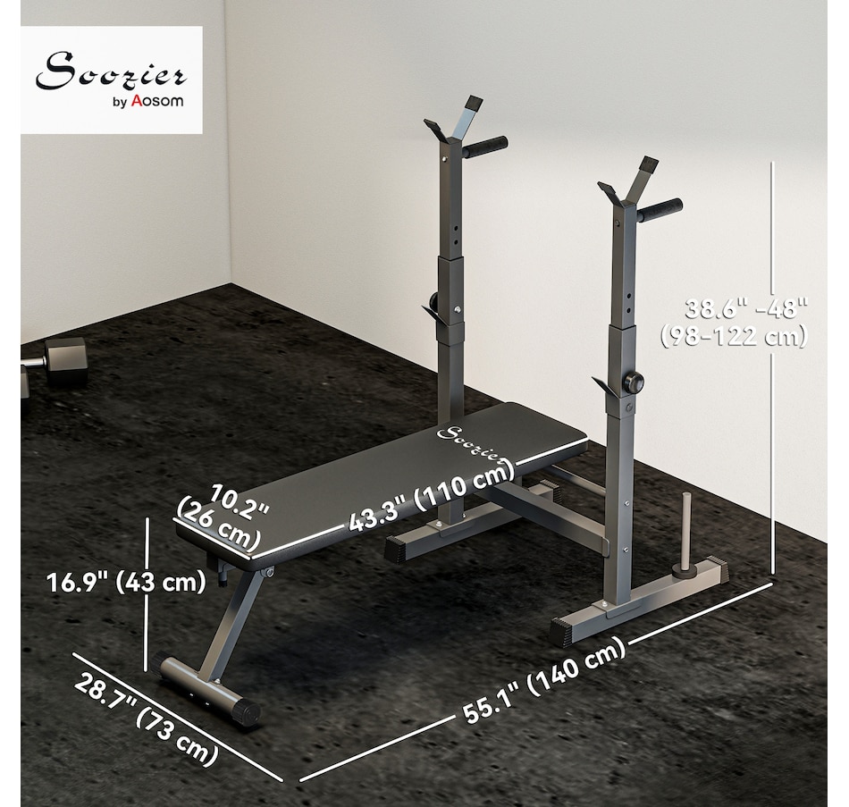 This Soozier weight bench with squat rack is ideal for any level of user looking to build, ton, and maintain muscle mas. We feature a barbell rack, weight lifting bench and dip station, a great option to work out your entire body right at home. The steel tube construction makes the strength training bench sturdy and stable, while the standard plate weight racks allow you to keep the weight close at hand. Try this squat and bench rack by Soozier and start getting the body of your dreams.Features: