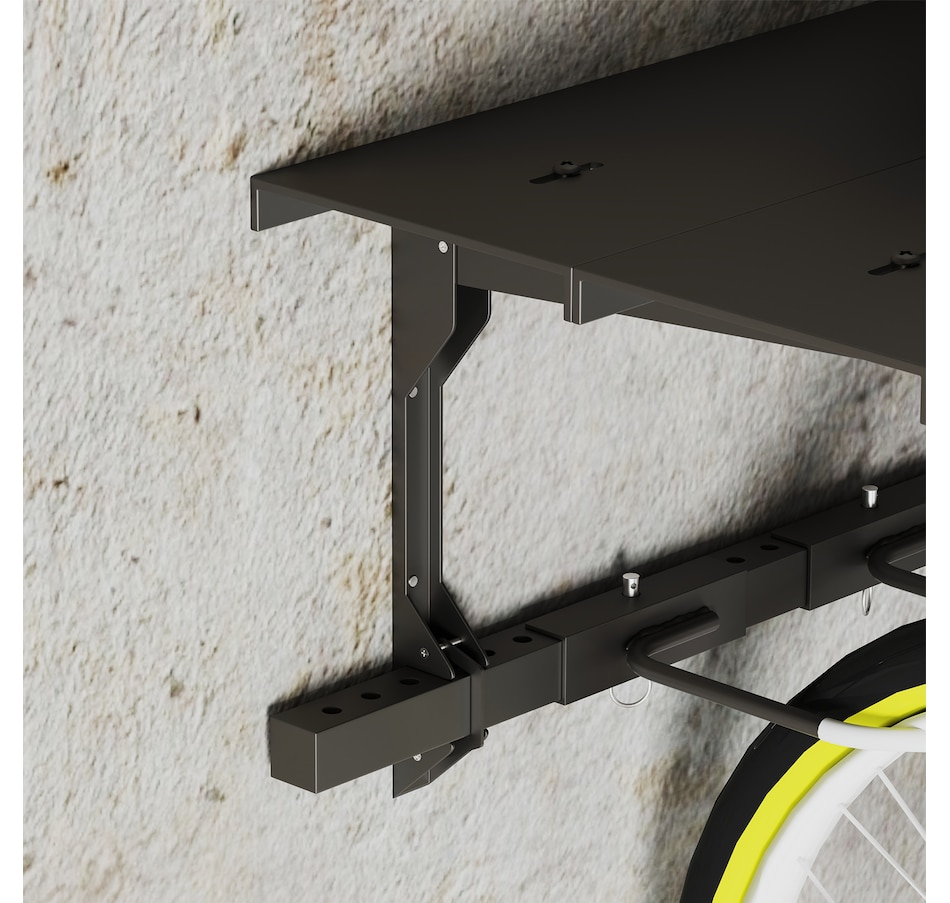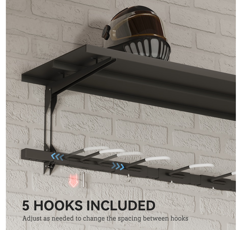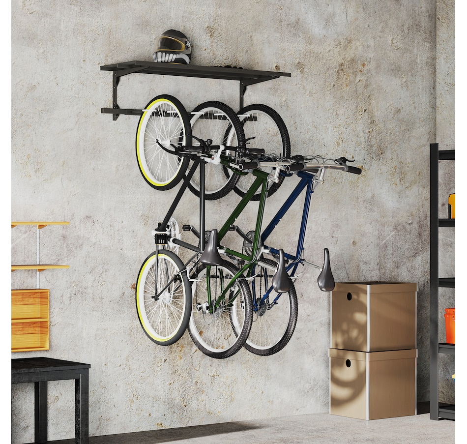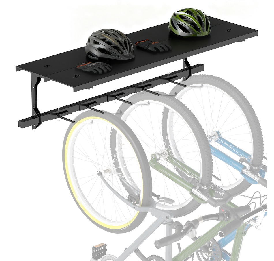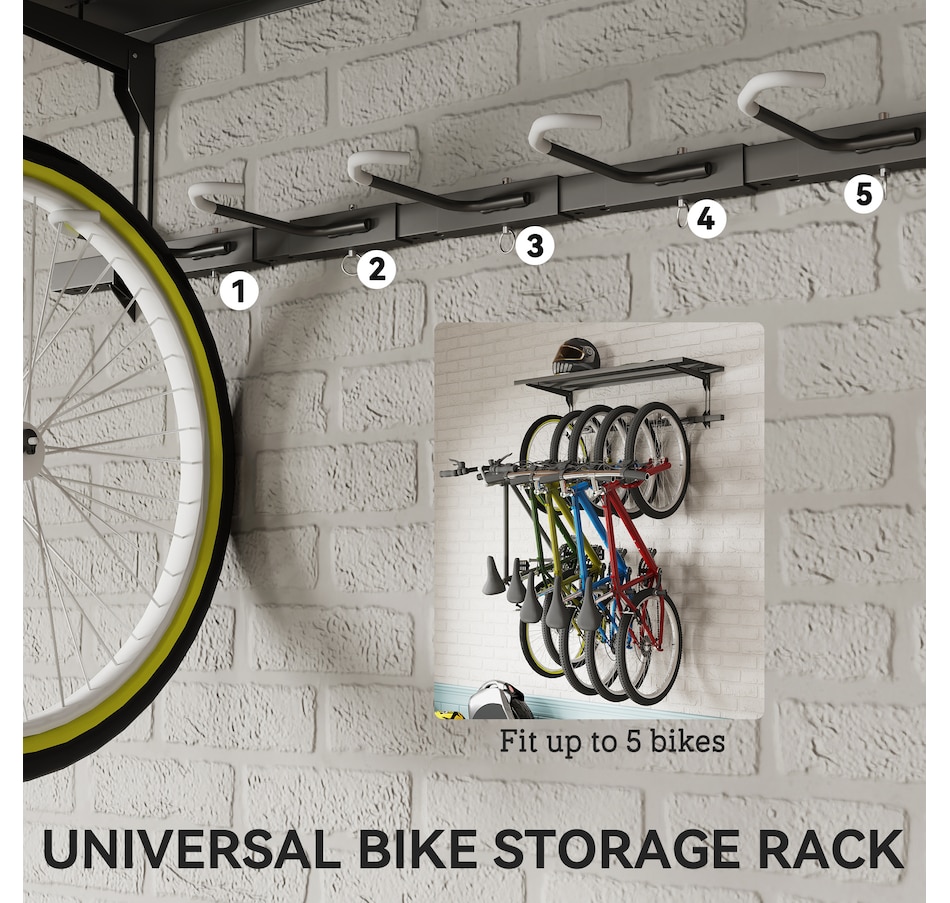 The Soozier bike rack is the all-in-one storage solution for all your bikes and equipment! With 5 heavy-duty storage hooks, you can hang road bikes, mountain bikes, recreational bikes, and family bikes right on the wall for space-efficient storage. The overhead storage shelf provides additional space to hold bike helmets, shoes, pumps, tools, and more! Clear up space in your garage and organize all your bikes and gear right on the wall with the bicycle rack!