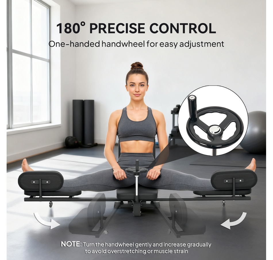 ● Large wheel offers 0-180° adjustment for safe, single-handed stretching control;