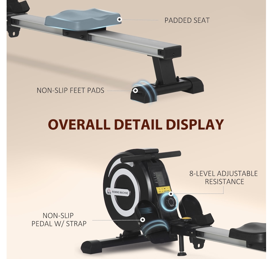Row into shape with this foldable rowing machine from Soozier! The home magnetic rowing machine is designed for convenience while also providing the challenging feel of outdoor rowing. Built with a smoother and quieter magnetic tension system with 8 levels of adjustable resistance, a convenient large LCD console, a fully padded seat, larger anti-slip foot pedals, and a foldable design for easy storage. Bring your workout to your home and more!