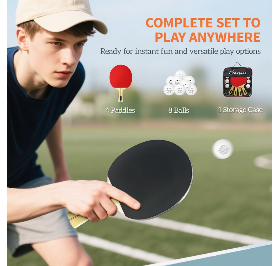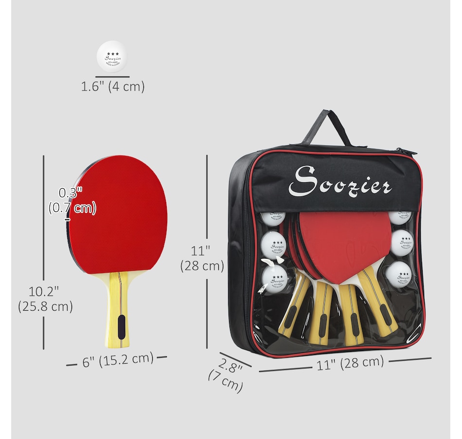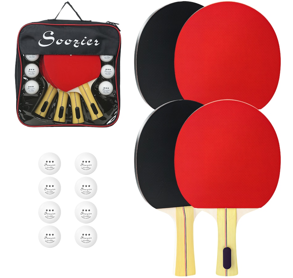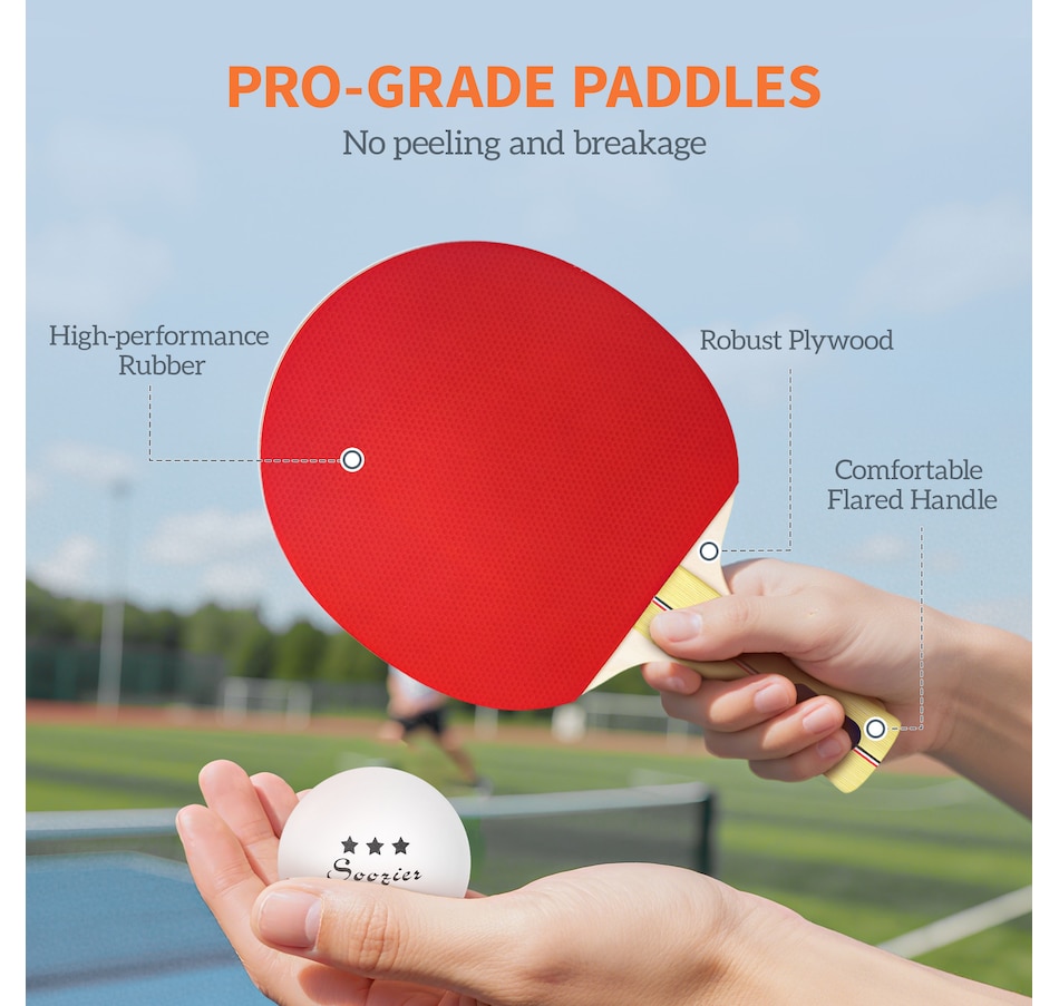 Experience the excellent blend of quality and comfort with the Soozier table tennis paddle set. Each paddle features reliable P2-grade plywood and 1.5 mm rubber for superior bounce and long-lasting performance. The ergonomic flared handles fit your hand perfectly, ensuring a non-slip grip during every fast rally. The portable Oxford fabric case with EVA padding keeps your paddles and balls protected from scratches, making it suitable for family fun, practice, or competitive play.Features: