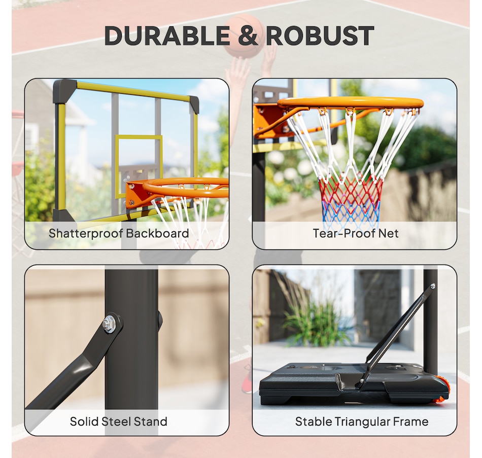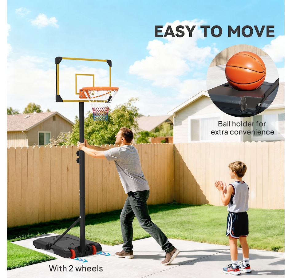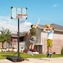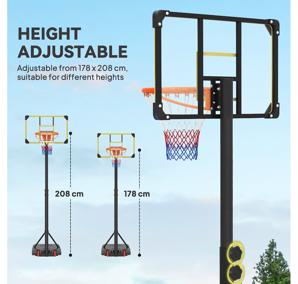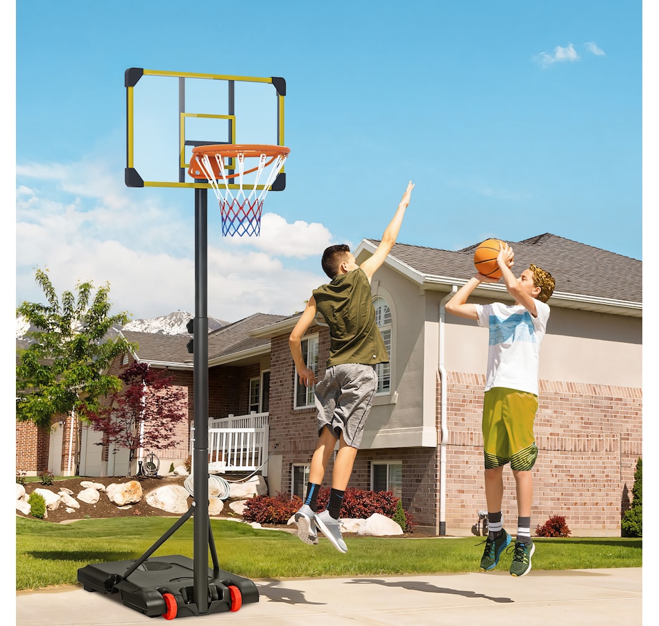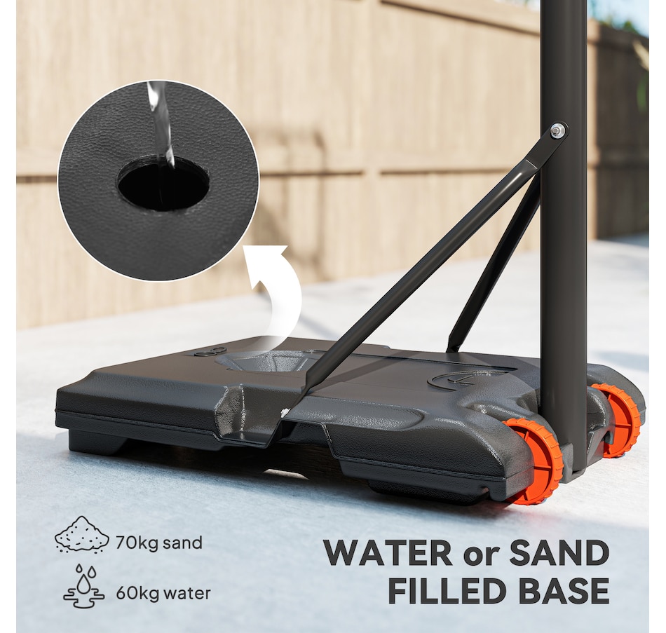 Enjoy shooting hoops with this Soozier outdoor basketball hoop. It has an adjustable height, so it's suitable for all heights – everyone can join the fun. A steel frame for strength and durability, whilst the base can be filled with water or sand, keeping it firmly in place. Wheels at the bottom let you move the stand easily, which can be placed in the proper position. Play on your own or with others; enjoy the swooshing sound of the ball passing through the net.Features: