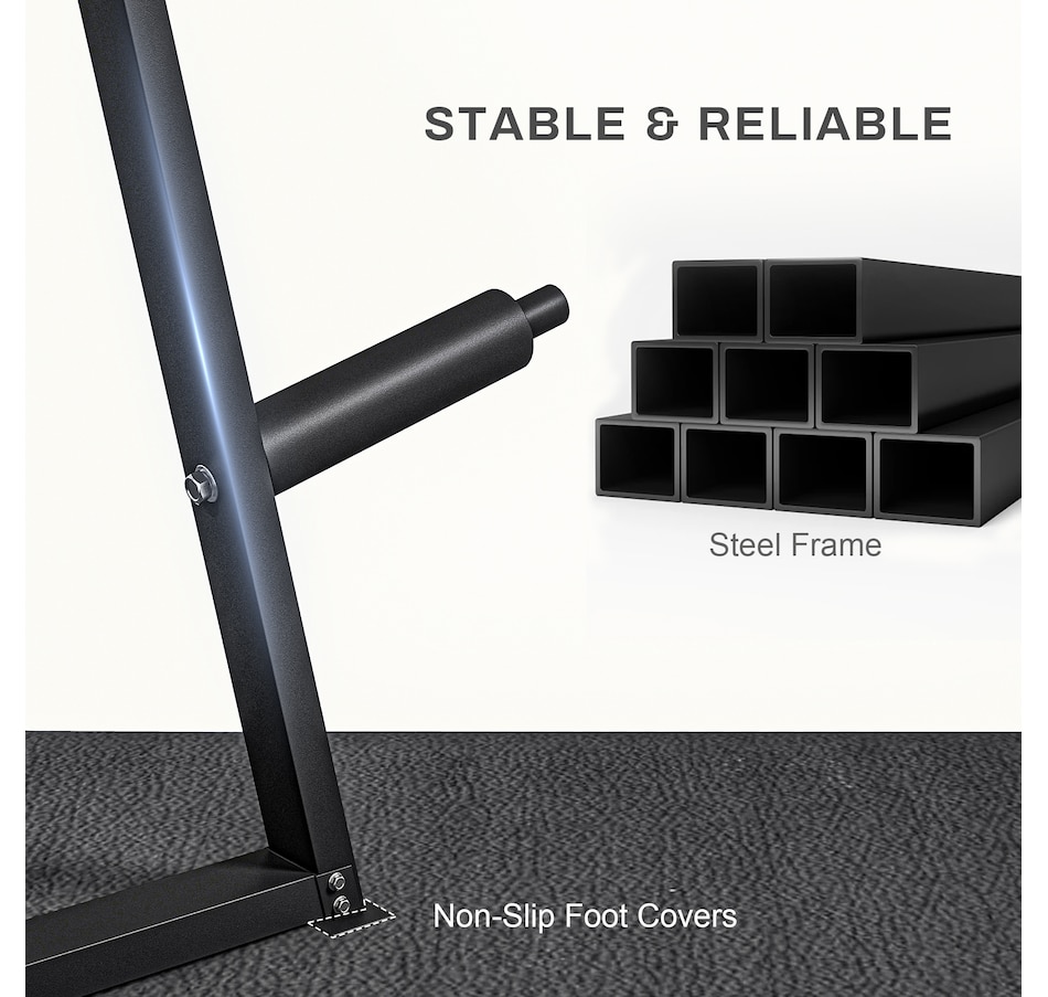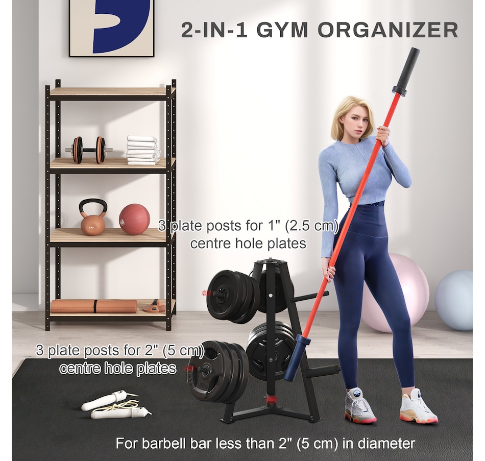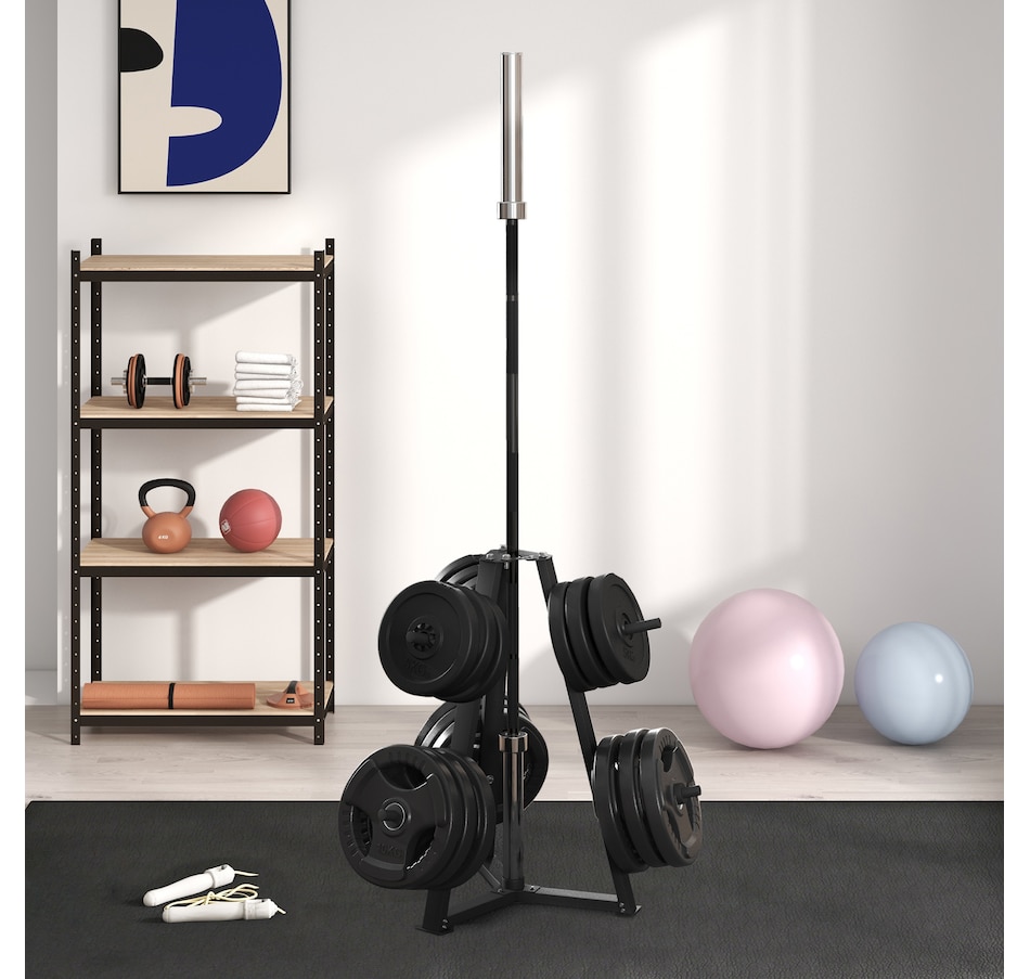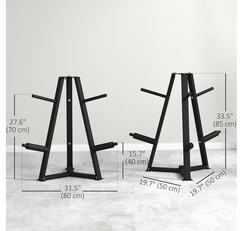 Transform your home gym with the Soozier weight holder! It's crafted for 2" (5 cm) and 1" (2.5 cm) plates on six posts, ensuring your area remains organized. Features a bar holder and a steel frame for a robust 660 lbs (300 kg) capacity. Keep your workout area secure with non-slip foot covers for unmatched stability.Features: