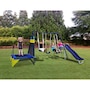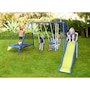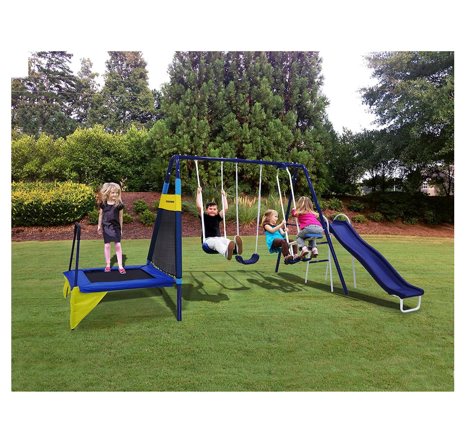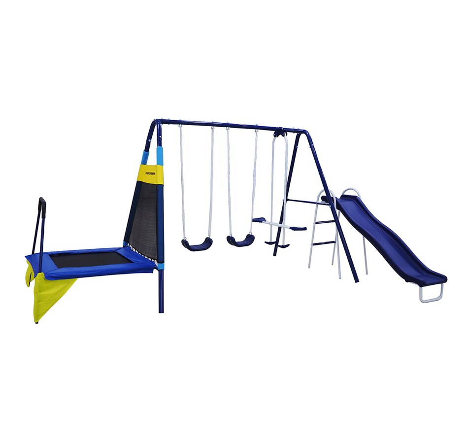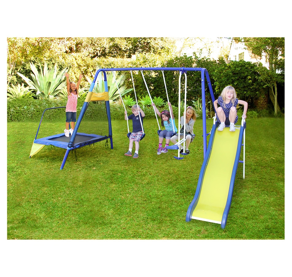 Have fun jumping and swinging with the Sportspower Almansor six station metal swing set! With two blow-molded swings, a glide ride and trampoline, this swing set is sure to become an outdoor favourite with your kids. Stay active with all the excitement this swing set has to offer! Kids benefit from frequent physical activity and exercise, and you benefit from knowing the kids are secure in your own backyard. This set offers four activities that can keep up to six kids busy at the same time.