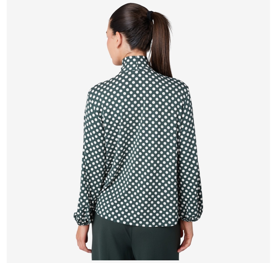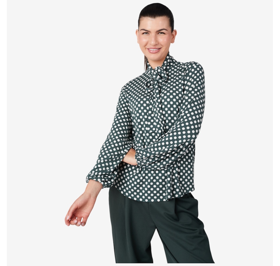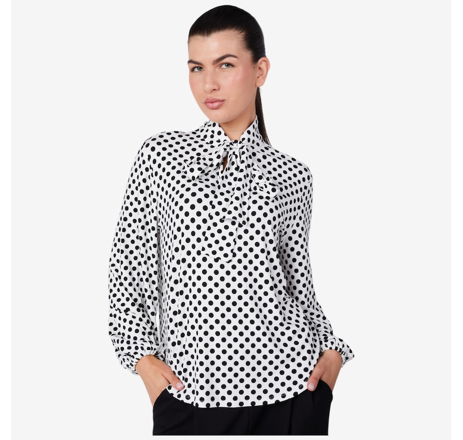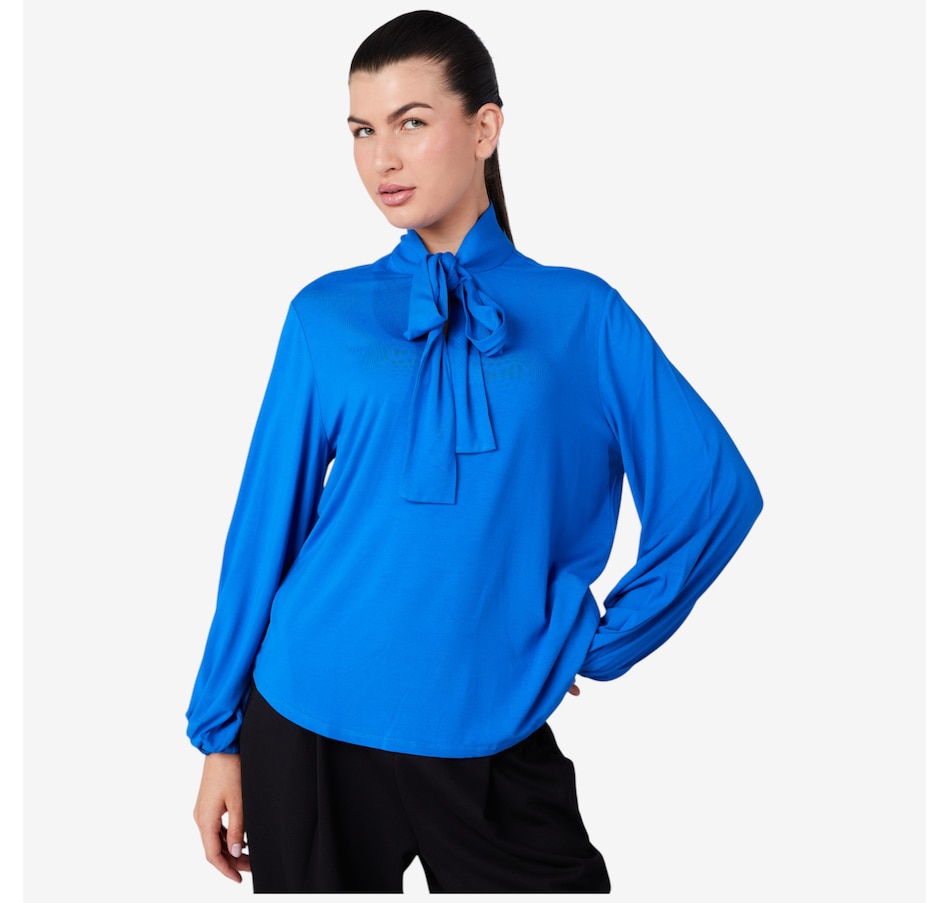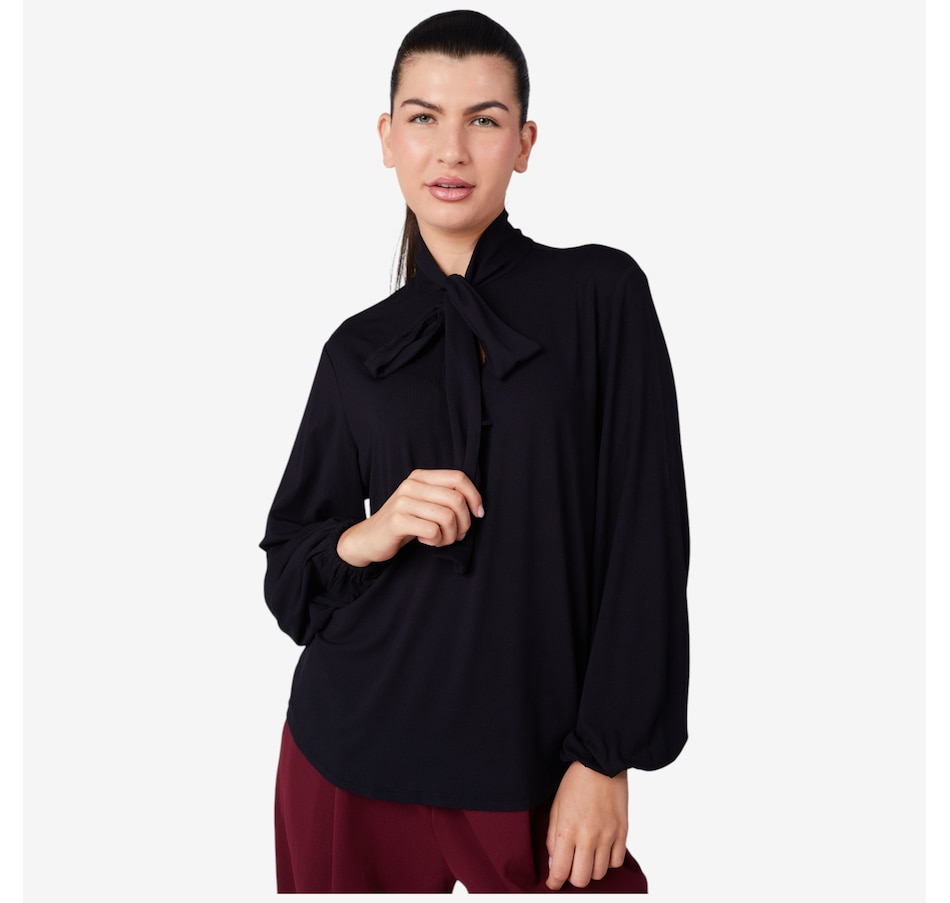 Centre your fall look in cute style with this pullover jersey bow blouse from Stacy London.