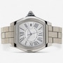 This Swiss-made stainless-steel CARTIER ROADSTER "S" model wristwatch captures the spirit of refined adventure with its distinctive tonneau-shaped (tonneau means "barrel" in French) 45mm x 40mm stainless steel case and classic silver guilloche dial with black Roman numeral hour markers and an inner minute track. It features luminescent sword-shaped oxidized hands and a black seconds hand. It has an automatic self-winding movement, powered by Cartier’s automatic Caliber 2894 and offers precision beneath a curved scratch resistant sapphire crystal with a cyclops magnifying glass. There is a date calendar at the 3 o'clock aperture and a secret Cartier signature can be found at the 7 o'clock mark. It is attached to a stainless-steel bracelet with a hidden double butterfly clasp. There is a screw-down radiator cap style crown. The watch is water resistant to 330 feet/100 meters. The model # is 3312 and the case is numbered 183566QX. The Roadster delivers timeless design and everyday performance in equal measure.
