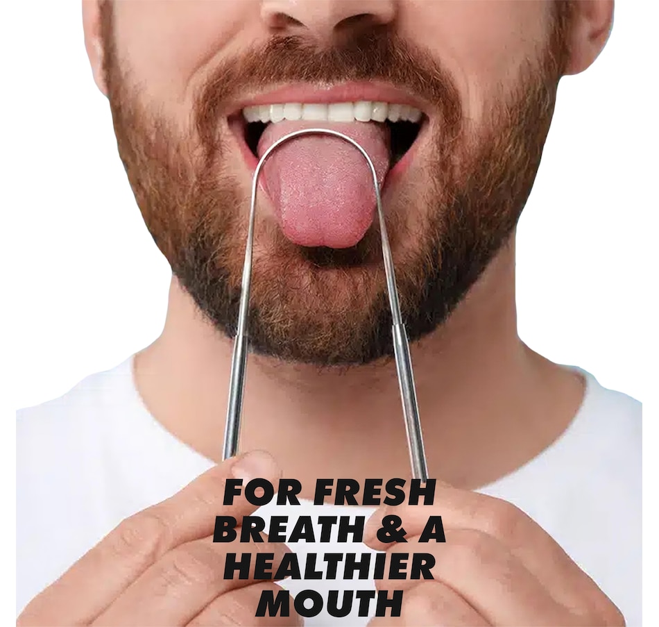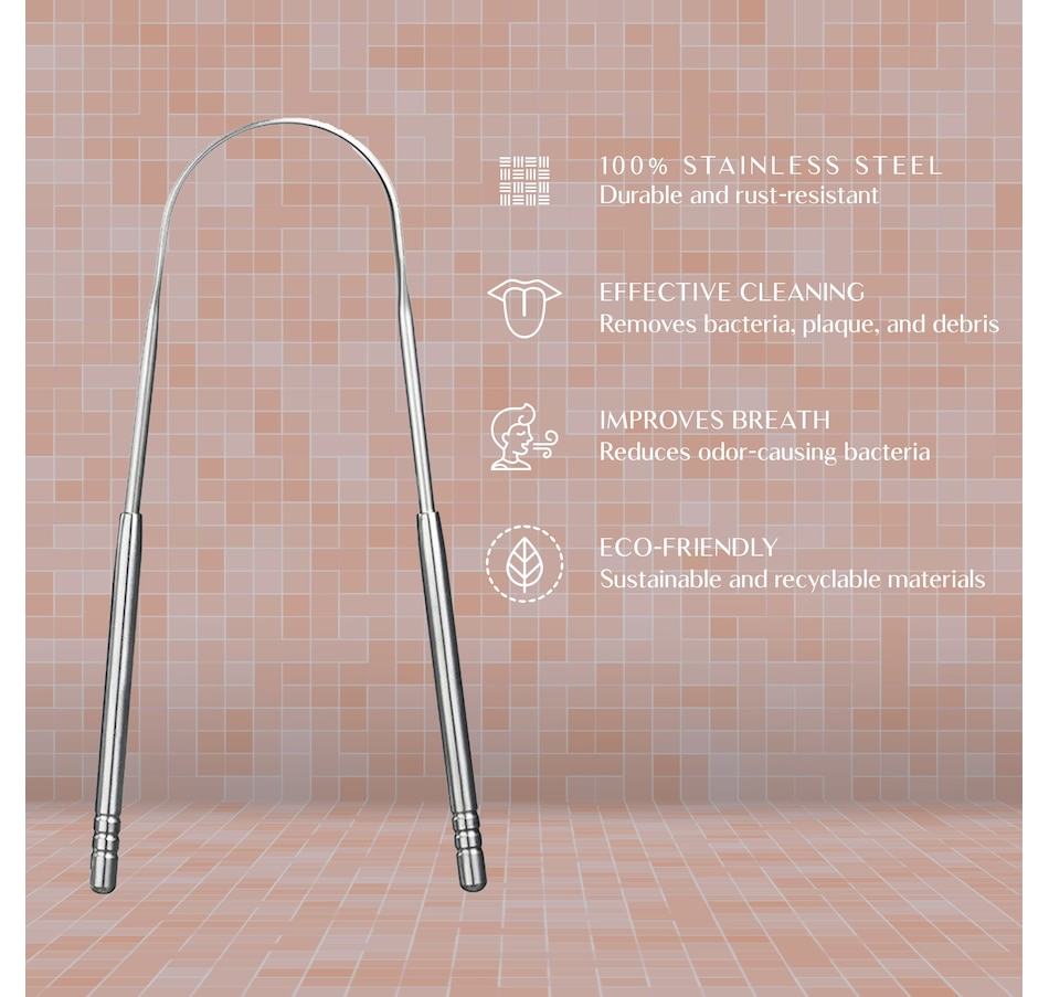 Experience a new level of oral hygiene with our 100% Stainless Steel Tongue Scraper, designed for those who prioritize both freshness and sustainability. This premium tongue cleaner is crafted entirely from high-quality stainless steel, ensuring durability and maximum cleaning effectiveness with every use.Key Benefits:Effective Cleaning: Our stainless steel tongue scraper goes beyond ordinary brushing, reaching deep to remove bacteria, plaque, and debris that can accumulate on the tongue. This helps prevent bad breath and promotes a cleaner, healthier mouth.Improves Breath: Regular tongue cleaning is known to reduce the buildup of odor-causing bacteria, giving you fresh breath all day long. Just a few seconds each morning can make a big difference in your confidence!Eco-Friendly Choice: Made from sustainable and fully recyclable materials, this tongue scraper is a zero-waste solution that’s gentle on the environment. Unlike plastic alternatives, stainless steel is long-lasting and can be reused indefinitely.This ergonomic tool is easy to handle and simple to clean, making it a hygienic addition to your daily routine. Make the switch to a greener, fresher approach to oral care with our stainless steel tongue scraper, and enjoy the benefits of a healthier mouth and confident, fresh breath!