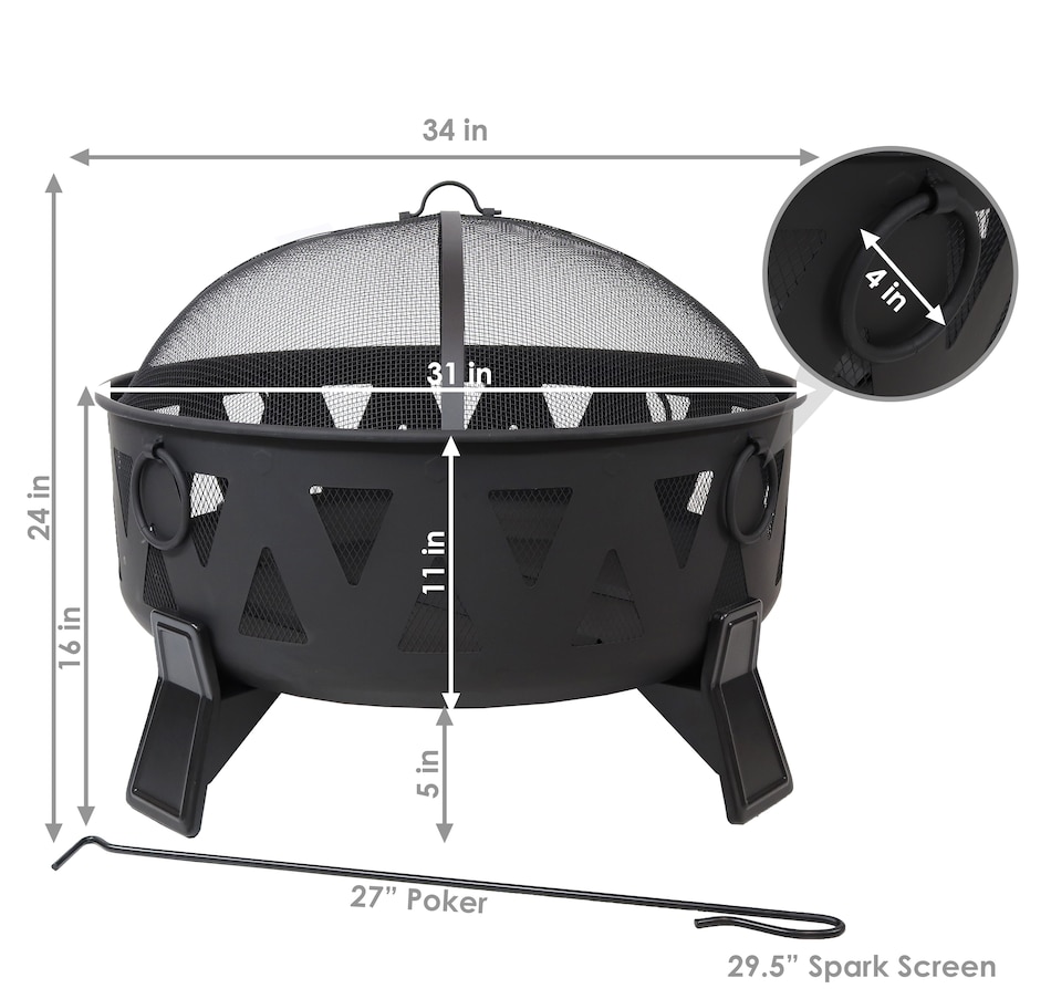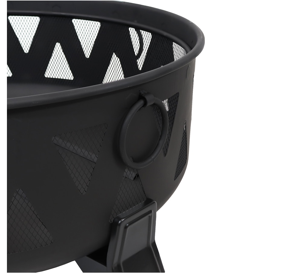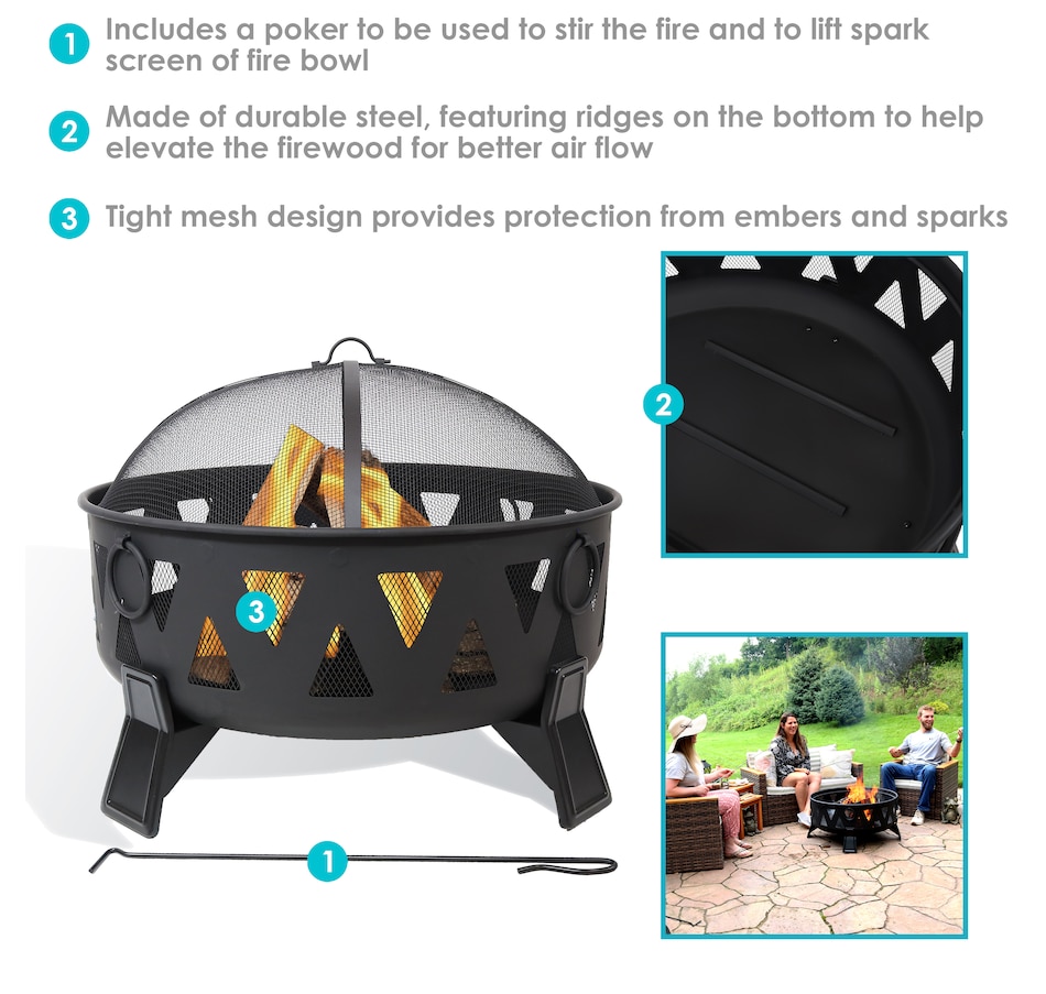 Enjoy the warmth and ambiance of a wood-burning fire on chilly nights with this Nordic-inspired wood-burning fire pit. Durably constructed of steel, this outdoor fire pit is designed to hold a roaring fire and be enjoyed season after season. This fire pit also has lower ridges on the bottom to help elevate the firewood for air flow and better, longer wooden burns. This fire pit includes a mesh spark screen and fire poker that allows anyone to safely enjoy and tend to the fire while keeping flying embers contained within the fire's vicinity. Not only can the poker be used to safely stir the logs, but it can also be used to lift the hot spark screen off the fire bowl. Whether in the backyard or vacationing at the cabin, this outdoor fire pit is great for making cozy memories with friends and family to treasure for years to come.