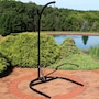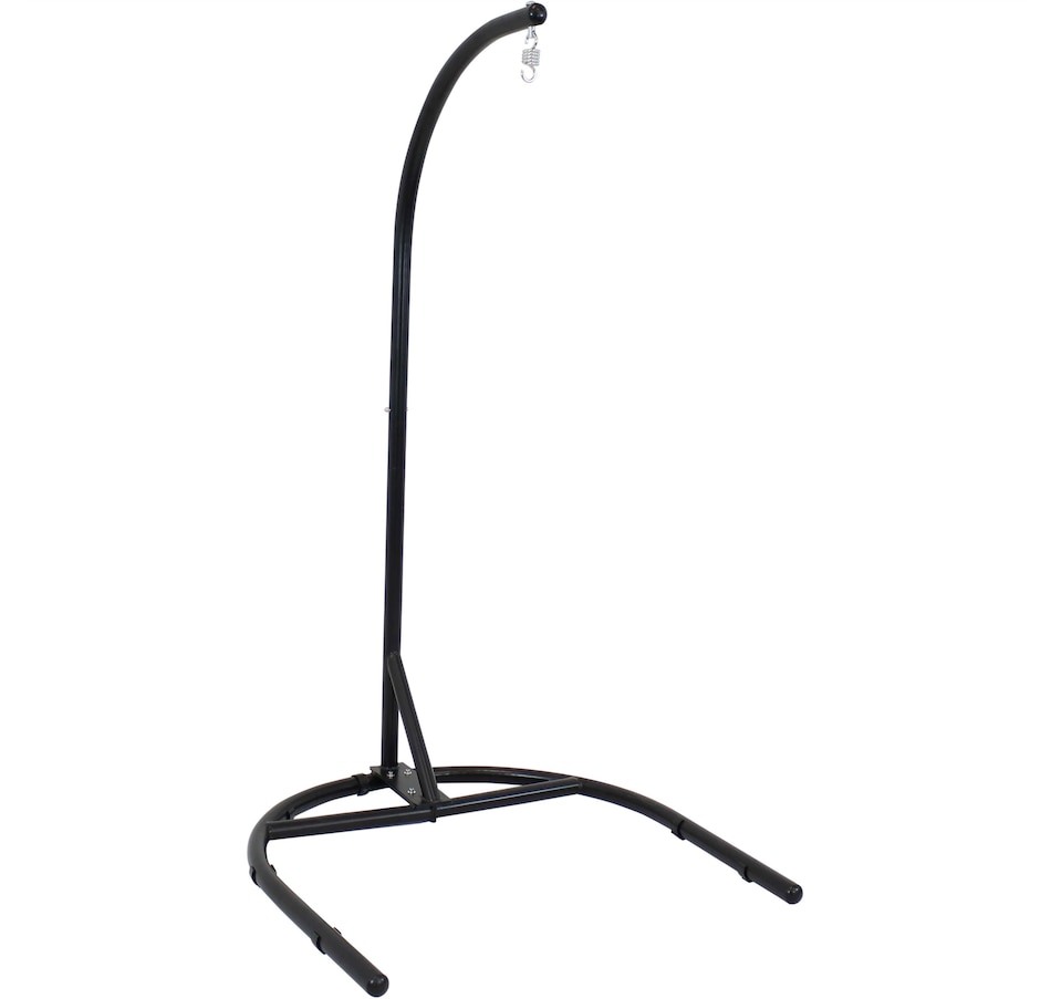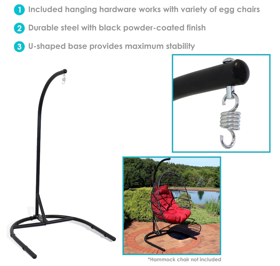 This steel, U-shaped, hanging chair stand is the right place to hang an egg chair without having to drill holes in the ceiling. Made of durable steel, this versatile stand for hanging chairs can be used in a number of indoor or outdoor locations including the patio, living room, deck, front porch, balcony, or bedroom. It features a unique U-shaped base for extra stability and a classic black powder-coated finish to complement any chair color or decor style. The steel and powder-coated layered material makes this stand able to easily withstand the elements when placed outdoors. Plus, all of the necessary hardware is included so assembly is simple (egg chair not included) and enjoy this egg chair stand almost right out of the box.
