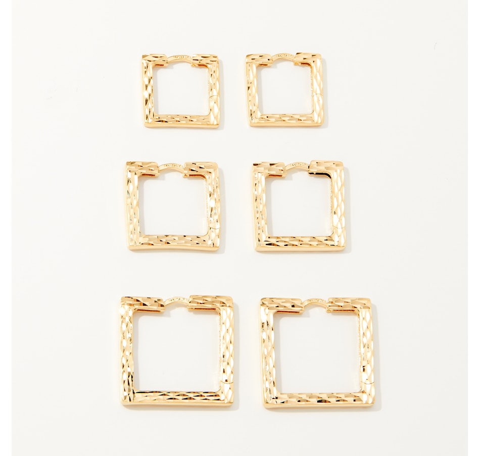 14K Yellow Gold Geometric Square Diamond-Cut Hoop Earrings