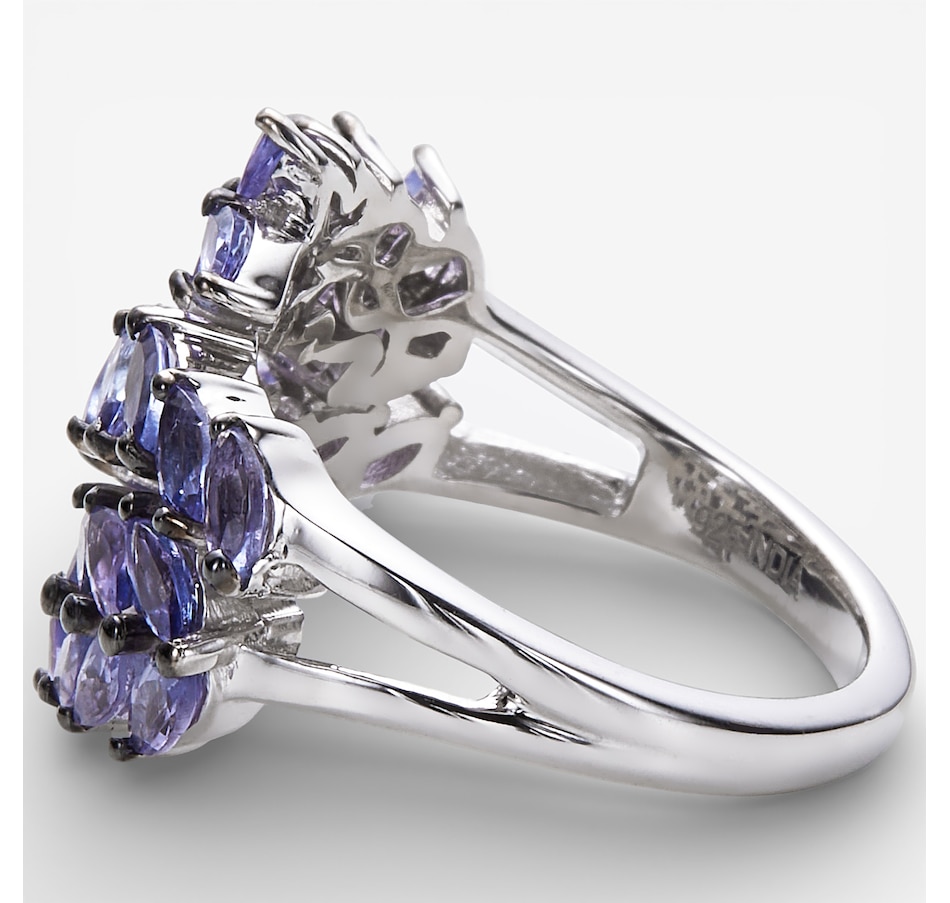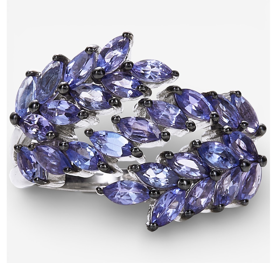 A striking arrangement of marquise‑cut tanzanite gemstones creates a bold and sparkling display in this sterling silver ring. Finished with black rhodium accents to enhance the depth of colour, the design offers eye‑catching texture and a smooth, comfortable undergallery.