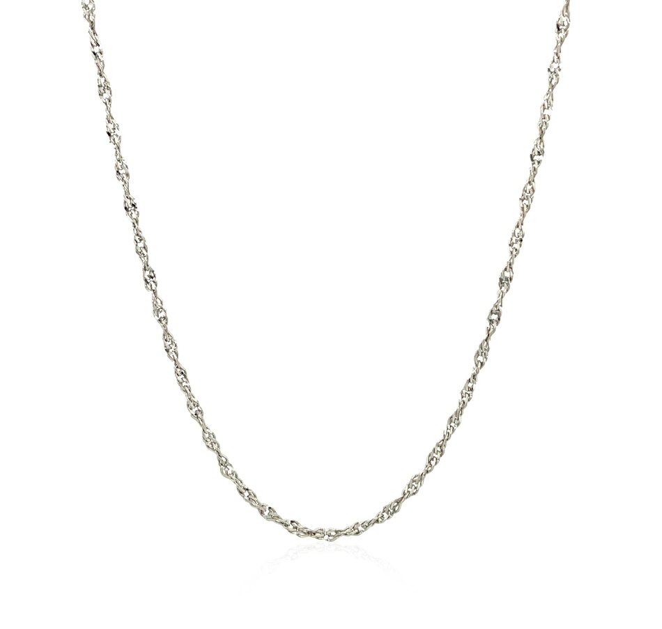 This classic chain crafted in gleaming sterling silver with rhodium polish. Featuring a Singapore type design, it had a width of 1.6 millimeters and secured with a lobster clasp.