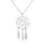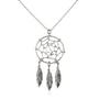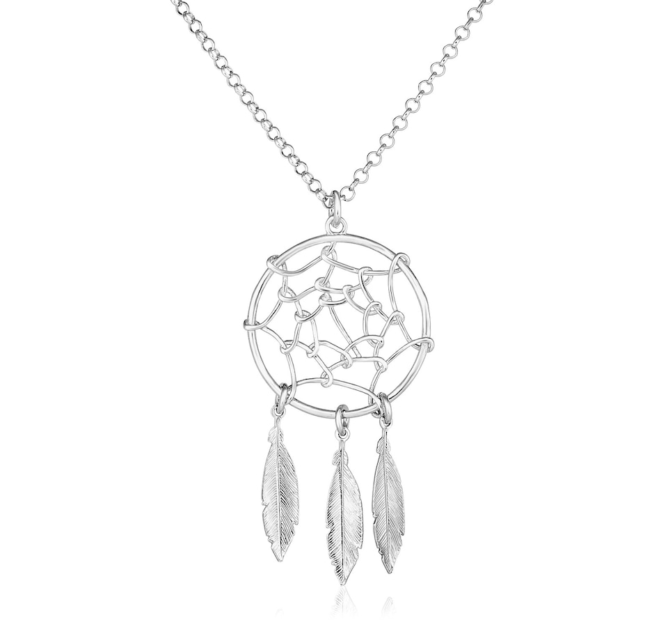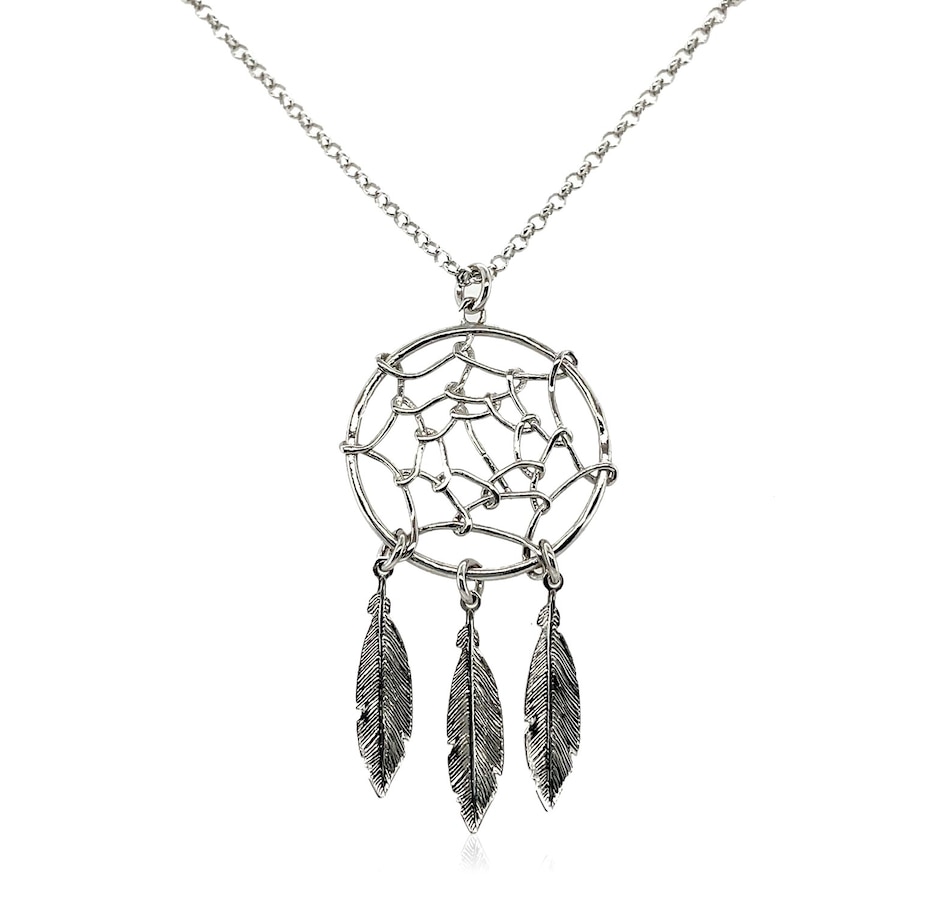 A beautiful sterling silver dream catcher pendant, complete with fascinating textured feathers, adorns a lovely chain necklace. Necklace is 17 inches long and closes with a lobster clasp.